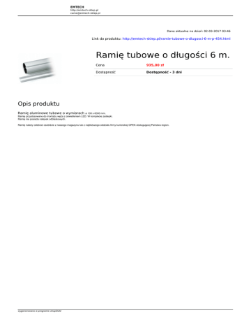 EMTECH http://emtech-sklep.pl [email protected] Dane aktualne na dzień: 02-03-2017 03:46 Link do produktu: http://emtech-sklep.pl/ramie-tubowe-o-dlugosci-6-m-p-454.html Ramię tubowe o długości 6 m. Cena 935,00 zł Dostępność Dostępność - 3 dni Opis produktu Ramię aluminowe tubowe o wymiarach ø 100 x 6000 mm. Ramię przystosowane do montażu węża z oświetleniem LED. W komplecie zaślepki. Ramię nie posiada nalepek odblaskowych. Ramię należy odebrać osobiście z naszego magazynu lub z najbliższego oddziału firmy kurierskiej OPEK obsługującej Państwa region. wygenerowano w programie shopGold Powered by TCPDF (www.tcpdf.org)