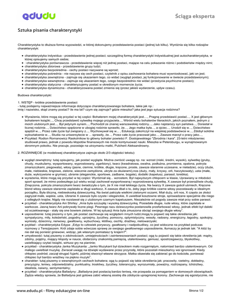 Ściąga eksperta Sztuka pisania charakterystyki Charakterystyka to dłuższa forma wypowiedzi, w której dokonujemy przedstawienia postaci (jednej lub kilku). Wyróżnia się kilka rodzajów charakterystyk: charakterystyka indywidua - przedstawienie jednej postaci; szczególną formą charakterystyki indywidualnej jest autocharakterystyka, w której opisujemy samych siebie; charakterystyka porównawcza - przedstawienie więcej niż jednej postaci, mające na celu pokazanie różnic i podobieństw między nimi; charakterystyka zbiorowa - przedstawienie grupy ludzi; charakterystyka bezpośrednia - cechy postaci nazywane są wprost; charakterystyka pośrednia - nie nazywa się cech postaci, czytelnik z opisu zachowania bohatera musi wywnioskować, jaki on jest; charakterystyka zewnętrzna - zajmuje się ukazaniem tego, co widać (wygląd postaci, jej funkcjonowanie w świecie przedstawionym); charakterystyka wewnętrzna - zajmuje się ukazaniem tego, czego bezpośrednio nie widać (przeżycia psychiczne postaci); charakterystyka statyczna - charakteryzujemy postać w określonym momencie życia; charakterystyka dynamiczna - charakteryzowana postać zmienia się (przez jakieś wydarzenie, upływ czasu). Budowa charakterystyki: 1. WSTĘP - krótkie przedstawienie postaci: - tutaj podajemy najważniejsze informacje dotyczące charakteryzowanego bohatera, takie jak np.: imię i nazwisko, skąd znamy postać? ile ma lat? czym się zajmuje? gdzie mieszka? jaka jest jego sytuacja rodzinna? Wyrażenia, które mogą się przydać w tej części: Bohaterem mojej charakterystyki jest...., Pragnę przedstawić postać..., X jest głównym bohaterem książki..., Chcę przedstawić sylwetkę mojego przyjaciela..., Wśród wielu bohaterów literackich, jakich poznałem, jednym z moich ulubionych jest..., Był jedynym synem..., Pochodził ze znanej warszawskiej rodziny..., Jako najstarszy syn państwa..., Dorastał w licznej rodzinie..., Dzieciństwo spędzone w ubogiej rodzinie sprawiło, że..., Jego matka była..., a ojciec..., Urodził się w..., Dzieciństwo spędził w..., Przez całe życie był związany z..., Wychowywał się w... , Edukację zakończył na wiejskiej podstawówce w..., Zdobył solidne wykształcenie w..., Studia na uniwersytecie w ... sprawiły, że..., Przez całe życie pracował jako..., Zawsze marzył o pracy jako..., Przykład: Rodion Romanowicz Raskolnikow to główny bohater powieści F. Dostojewskiego "Zbrodnia i kara". 23-letni młodzieniec studiował prawo, jednak z powodu kłopotów finansowych nie może kontynuować nauki. Mieszka w Petersburgu, w wynajmowanym skromnym pokoiku. Nie pracuje, pozostaje na utrzymaniu matki, Pulcherii Aleksandrowny. 2. ROZWINIĘCIE (w modelowej charakterystyce zajmuje około 2/3 objętości tekstu): wygląd zewnętrzny: tutaj opisujemy, jak postać wygląda. Można zwrócić uwagę np. na: wzrost (niski, średni, wysoki), sylwetkę (gruby, chudy, muskularny, wysportowany, wyprostowany, zgarbiony), twarz (kwadratowa, owalna, podłużna, promienna, opalona, pokryta zmarszczkami, piegowata), włosy (jasne, ciemne, krótkie, długie, kręcone, proste, zawsze starannie uczesane, w nieładzie), oczy (duże, małe, niebieskie, brązowe, zielone, wiecznie zamyślone, ukryte za okularami),nos (duży, mały, krzywy, orli, haczykowaty), usta (małe, duże, wykrzywione w grymas), ubranie (eleganckie, sportowe, zadbane, bogate), dodatki (kapelusz, parasol, torebka). wyrażenia, które mogą się przydać w tej części: Wyróżniał się... wzrostem, Był najwyższym chłopcem w klasie, Uprawiany w młodości sport sprawił, że mimo podeszłego już wieku wciąż zachował wysportowaną i wyprostowaną sylwetkę, X zawsze był przeraźliwie chudy, Zmęczona, pokryta zmarszczkami twarz świadczyła o tym, że X nie miał lekkiego życia, Na twarzy X zawsze gościł uśmiech, Kręcone blond włosy zawsze starannie zaplatała w długi warkocz, X zawsze dbał o to, żeby jego krótkie czarne włosy pozostawały w idealnym porządku, Była śliczną, niebieskooką dziewczynką, Na świat patrzyła wielkimi zielonymi oczami, Miał duży, orli nos, X często ze złości zagryzał małe, wąskie, usta, Ubranie X zawsze było czyste i eleganckie, X uwielbiał kosztowne stroje, sprowadzane specjalnie dla niego z odległych krajów, Nigdy nie rozstawał się z ulubionym czarnym kapeluszem, Niezależnie od pogody zawsze miał przy sobie parasol. przykład - charakterystyka Ani Shirley: „Ania była szczupłą i wysoką dziewczynką. Posiadała długie, rude włosy, które zaplatała w warkocze. Jasną twarz Ani pokrywały liczne piegi. Pewnego razu dziewczynka postanowiła przefarbować włosy, jednak efekt był daleki od oczekiwanego - stały się one bowiem zielone. W tej sytuacji Ania była zmuszona obciąć swojego długie włosy”. usposobienie: tutaj piszemy o tym, jak postać zachowuje się względem innych ludzi;mogą tu pojawić się takie określenia jak: sympatyczny, miły, koleżeński, pogodny, uprzejmy, życzliwy, pomocny, optymistyczny, wesoły, radosny, energiczny, łagodny, spokojny, wyniosły, dziecinny, nerwowy, gwałtowny, wybuchowy, kłótliwy, oschły, drażliwy, nietowarzyski; pzykład - charakterystyka Edypa: „Edyp to człowiek porywczy, gwałtowny i nadpobudliwy, co jest widoczne na przykład podczas rozmowy z Terezjaszem. Król zdaje sobie wówczas sprawę ze swojego gwałtownego usposobienie, tłumaczy je jednak tak: "A któż by nie dał się ponieść gniewowi, widząc, jak własnym pomiatasz ty krajem?". umysłowość: tutaj piszemy o zdolnościach, umiejętnościach i zainteresowaniach postaci; ogą tu pojawić się takie określenia jak: mądry, zdolny, pojętny, mający kłopoty w nauce, obdarzony znakomitą pamięcią, utalentowany, geniusz, spostrzegawczy, błyskotliwy, uwielbiający czytać książki, wirtuoz gry na pianinie; przykład - charakterystyka Janka Muzykanta: „Janko Muzykant był dzieckiem mało rozgarniętym