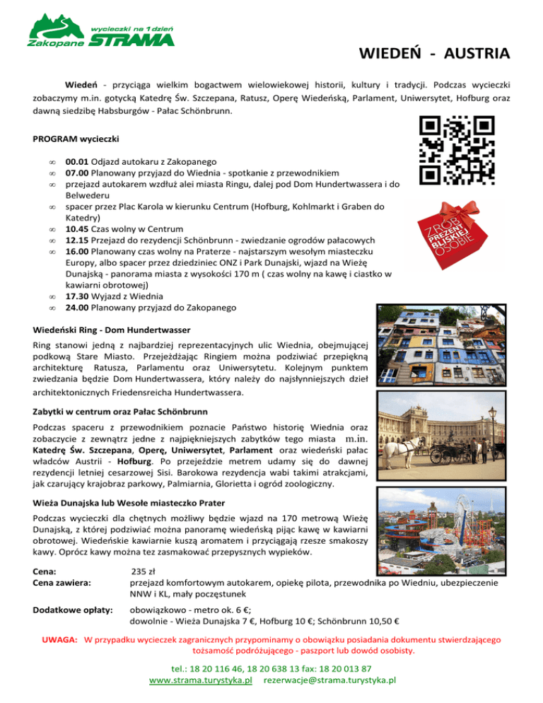 WIEDEŃ - AUSTRIA Wiedeń - przyciąga wielkim bogactwem wielowiekowej historii, kultury i tradycji. Podczas wycieczki zobaczymy m.in. gotycką Katedrę Św. Szczepana, Ratusz, Operę Wiedeńską, Parlament, Uniwersytet, Hofburg oraz dawną siedzibę Habsburgów - Pałac Schönbrunn. PROGRAM wycieczki • • • • • • • • • 00.01 Odjazd autokaru z Zakopanego 07.00 Planowany przyjazd do Wiednia - spotkanie z przewodnikiem przejazd autokarem wzdłuż alei miasta Ringu, dalej pod Dom Hundertwassera i do Belwederu spacer przez Plac Karola w kierunku Centrum (Hofburg, Kohlmarkt i Graben do Katedry) 10.45 Czas wolny w Centrum 12.15 Przejazd do rezydencji Schönbrunn - zwiedzanie ogrodów pałacowych 16.00 Planowany czas wolny na Praterze - najstarszym wesołym miasteczku Europy, albo spacer przez dziedziniec ONZ i Park Dunajski, wjazd na Wieżę Dunajską - panorama miasta z wysokości 170 m ( czas wolny na kawę i ciastko w kawiarni obrotowej) 17.30 Wyjazd z Wiednia 24.00 Planowany przyjazd do Zakopanego Wiedeński Ring - Dom Hundertwasser Ring stanowi jedną z najbardziej reprezentacyjnych ulic Wiednia, obejmującej podkową Stare Miasto. Przejeżdżając Ringiem można podziwiać przepiękną architekturę Ratusza, Parlamentu oraz Uniwersytetu. Kolejnym punktem zwiedzania będzie Dom Hundertwassera, który należy do najsłynniejszych dzieł architektonicznych Friedensreicha Hundertwassera. Zabytki w centrum oraz Pałac Schönbrunn Podczas spaceru z przewodnikiem poznacie Państwo historię Wiednia oraz zobaczycie z zewnątrz jedne z najpiękniejszych zabytków tego miasta m.in. Katedrę Św. Szczepana, Operę, Uniwersytet, Parlament oraz wiedeński pałac władców Austrii - Hofburg. Po przejeździe metrem udamy się do dawnej rezydencji letniej cesarzowej Sisi. Barokowa rezydencja wabi takimi atrakcjami, jak czarujący krajobraz parkowy, Palmiarnia, Glorietta i ogród zoologiczny. Wieża Dunajska lub Wesołe miasteczko Prater Podczas wycieczki dla chętnych możliwy będzie wjazd na 170 metrową Wieżę Dunajską, z której podziwiać można panoramę wiedeńską pijąc kawę w kawiarni obrotowej. Wiedeńskie kawiarnie kuszą aromatem i przyciągają rzesze smakoszy kawy. Oprócz kawy można tez zasmakować przepysznych wypieków. Cena: Cena zawiera: 235 zł przejazd komfortowym autokarem, opiekę pilota, przewodnika po Wiedniu, ubezpieczenie NNW i KL, mały poczęstunek Dodatkowe opłaty: obowiązkowo - metro ok. 6 €; dowolnie - Wieża Dunajska 7 €, Hofburg 10 €; Schönbrunn 10,50 € UWAGA: W przypadku wycieczek zagranicznych przypominamy o obowiązku posiadania dokumentu stwierdzającego tożsamość podróżującego - paszport lub dowód osobisty. tel.: 18 20 116 46, 18 20 638 13 fax: 18 20 013 87 www.strama.turystyka.pl [email protected]