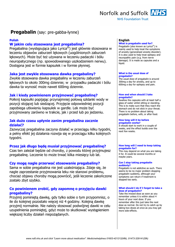 Pregabalin (say: pre-gabba-lynne) Polish English W jakim celu stosowana jest pregabalina? Pregabalina (występująca jako Lyrica®) jest głównie stosowana w leczeniu objawów zaburzeń lękowych (uogólnionych zaburzeń lękowych). Może być też używana w leczeniu padaczki i bólu neuropatycznego (np. spowodowanego uszkodzeniem nerwu). Dostępna jest w formie kapsułek i w formie płynnej. What is pregabalin used for? Pregabalin (also known as Lyrica®) is mainly used to help treat the symptoms of anxiety (generalised anxiety disorder). It is also used to help treat epilepsy and neuropathic pain (e.g. from nerve damage). It is made as capsules and a liquid. Jaka jest zwykle stosowana dawka pregabaliny? Zwykle stosowana dawka pregabaliny w leczeniu zaburzeń lękowych to około 300mg dziennie; w przypadku padaczki i bólu dawka ta wynosić może nawet 600mg dziennie. What is the usual dose of pregabalin? The usual dose of pregabalin is around 300mg a day for anxiety, and up to 600mg a day for epilepsy and pain. Jak i kiedy powinienem przyjmować pregabalinę? Połknij kapsułki popijając przynajmniej połową szklanki wody w pozycji stojącej lub siedzącej. Przyjęcie odpowiedniej pozycji zapobiega utkwieniu kapsułek w gardle. Lek może być przyjmowany zarówno w trakcie, jak i przed lub po jedzeniu. How and when should I take pregabalin? Swallow the capsules with at least half a glass of water whilst sitting or standing. This is to make sure that they reach the stomach and do not stick in your throat. There is no problem about taking pregabalin before, with, or after food. Jak dużo czasu upłynie zanim pregabalina zacznie działać? Zazwyczaj pregabalina zaczyna działać w przeciągu kilku tygodni, a pełny efekt jej działania rozwija się w przeciągu kilku kolejnych tygodni. How long will it be before pregabalin works? It should start to work in a couple of weeks, and the effect builds over the next few weeks. Przez jak długo będę musiał przyjmować pregabalinę? Czas ten zależał będzie od choroby, z powodu której przyjmujesz pregabalinę. Leczenie to może trwać kilka miesięcy lub lat. How long will I need to keep taking pregabalin for? This may depend on what you are taking it for. It could be several months or maybe years. Czy mogę nagle przerwać stosowanie pregabaliny? Sama w sobie pregabalina nie jest uzależniająca. Zdaje się, że nagłe zaprzestanie przyjmowania leku nie stanowi problemu, chociaż objawy choroby mogą powrócić, jeśli leczenie zakończone zostało zbyt szybko. Can I stop taking pregabalin suddenly? Pregabalin is not addictive as such. There seems to be no major problem stopping pregabalin suddenly, although your symptoms can return if treatment is stopped too early. Co powinienem zrobić, gdy zapomnę o przyjęciu dawki pregabaliny? Przyjmij pominiętą dawkę, gdy tylko sobie o tym przypomnisz, o ile do kolejnej pozostało więcej niż 4 godziny. Kolejną dawkę przyjmij normalnie. Nie należy stosować podwójnej dawki w celu uzupełnienia pominiętej, gdyż może to skutkować wystąpieniem większej liczby działań niepożądanych. What should I do if I forget to take a dose of pregabalin? Take the missed dose as soon as you remember unless it is within about 4 hours of your next dose. If you remember after this just take the next dose as normal. Do not try to catch up by taking two doses at once as you may get more side-effects. www.nsft.nhs.uk and click "Learn more about medication". Medicinehelplines 01603-421212(Nfk), 01473-329141(Sfk) Czy mogę pić alkohol podczas przyjmowania pregabaliny? Picie alkoholu w czasie przyjmowania pregabaliny może sprawiać, że będziesz czuł się bardziej senny. Szczególnie ważne jest, by zasięgnąć rady lekarza, jeśli zamierzasz prowadzić pojazdy lub obsługiwać maszyny. Can I drink alcohol while I am taking pregabalin? If you drink alcohol while taking pregabalin it may make you feel more sleepy. This is particularly important if you need to drive or operate machinery and you must seek advice on this. Jakie działania niepożądane mogą wystąpić podczas przyjmowania pregabaliny? What sort of side-effects might I get if I am taking pregabalin? Most people get: Dizziness Being very sleepy U większości ludzi są to: zawroty głowy wzmożone uczucie senności U niektórych są to: bóle głowy suchość w ustach chwianie się (uczucie podobne do występującego po spożyciu alkoholu) nieostre lub niewyraźne widzenie U Some people also get: Headache Dry mouth Feeling a bit wobbly Blurred or unclear vision A few people get Ankle swelling Sexual problems Stomach upset or feeling sick niewielu występują: opuchnięte kostki problemy seksualne dyskomfort w żołądku, mdłości Nie przejmuj się listą działań niepożądanych. U niektórych ludzi nie występują one w ogóle, podczas gdy u innych mogą wystąpić niewymienione tu działania niepożądane. Jeśli wydaje Ci się że, odczuwasz skutek uboczny przyjmowania Twojego leku, powinieneś skonsultować się ze swoim lekarzem, pielęgniarką lub farmaceutą. Do not be worried by this list of side effects. Some people get no side effects at all and others may get some effects that are not listed here. If you think you might have a side effect to your medicine, you should ask your doctor, nurse or pharmacist. Czy mogę prowadzić pojazdy lub jeździć na rowerze w czasie, gdy przyjmuję pregabalinę? Na początku przyjmowania pregabaliny, możesz być nieco senny. To obniży twoją szybkość reakcji. Póki to nie minie, lub nie zorientujesz się jaki pregabalina ma na ciebie wpływ, nie prowadź pojazdów ani nie obsługuj maszyn. Can I drive or cycle while I am taking pregabalin? You may feel a bit sleepy at first when taking pregabalin. You should be careful as it may slow down your reaction times. Until this wears off, or you know how pregabalin affects you, do not drive or operate machinery. Drobny druk: Ta krótka ulotka ma