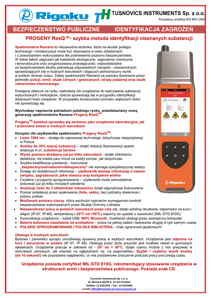 BEZPIECZEŃSTWO PUBLICZNE IDENTYFIKACJA ZAGROŻEŃ PROGENY ResQ™- szybka metoda identyfikacji nieznanych substancji Spektrometria Ramana to niezawodna technika, która na skutek postępu technologii i miniaturyzacji może być stosowana w wielu dziedzinach i z powodzeniem wykorzystana dla podniesienia poziomu bezpieczeństwa. W dobie takich zagrożeń jak katastrofy ekologiczne, zagrożenia chemiczne i terrorystyczne oraz zorganizowana przestępczość, odpowiedzialne za bezpieczeństwo służby potrzebują odpowiednich narzędzi - niezawodnych, sprawdzających się w trudnych warunkach i dających jednoznaczny wynik w krótkim okresie czasu. Zalety spektrometrii Ramana są szeroko doceniane przez jednostki policji, armii, służb celnych i granicznych, straży pożarnej oraz służb ratownictwa chemicznego. Dostępne obecnie na rynku narkotesty lub urządzenia do wykrywania substancji wybuchowych i narkotyków, dobrze sprawdzają się w przypadku identyfikacji śladowych ilości związków. W przypadku konieczności pomiaru większych ilości nie sprawdzają się. Wychodząc naprzeciw potrzebom polskiego rynku, przedstawiamy nową TM generację spektrometrów Ramana Progeny ResQ TM Progeny świetnie sprawdza się zarówno, jako urządzenie laboratoryjne, jak i przenośne nawet w trudnych warunkach. TM Korzyści dla użytkownika spektrometru Progeny ResQ : Laser 1064 nm – dostęp do najnowszej technologii, dotychczas niespotykanej w Polsce Analiza do 30% więcej substancji – dzięki redukcji fluorescencji aparat analizuje m.in. substancje barwne Wynik pomiaru dostępny już po kilku sekundach –dzięki chłodzeniu detektora, nie trzeba paru minut na każdy pomiar, jak dotychczas Szybka kwalifikacja substancji – komunikat „bezpieczny/ostrzeżenie/niebezpieczny” nie wymaga specjalistycznej wiedzy Dostęp do dodatkowych informacji – użytkownik dostaje informację o nazwie związku, zagrożeniach, jakie stwarza oraz kompletne widmo Czytelne i przyjazne oprogramowanie – użytkownik może samodzielnie pracować już po kilku minutach szkolenia Analizuje ilość do 3 składników mieszaniny dzięki algorytmowi ilościowemu Pomiar substancji przez opakowania (folie, szkło), bez potrzeby otwierania i poboru próbek Możliwość pomiaru cieczy, która wychodzi naprzeciw wymaganiom kontroli bezpieczeństwa wykonywanych przez Służbę Ochrony Lotniska Niezawodność pracy w polskich warunkach przez cały rok, dzięki solidnej obudowie, odporności na kurz i wilgoć (IP-67, IP-68), temperaturę (-20°C od +50°C) odporny na upadek z wysokości (MIL-STD 810G) Komunikacja urządzenia – kabel USB, WiFi, Bluetooth, możliwość obsługi przez zewnętrzny komputer Bateria ładowana niezależnie od analizatora – praca na pełnej baterii i ładowanie drugiej w tym samym czasie POLSKIE OPROGRAMOWANIE I POLSKA BIBLIOTEKA – brak ograniczeń językowych! Obsługa w trudnych warunkach Budowa i parametry sprzętu umożliwiają sprawną pracę w każdych warunkach. Urządzenie jest odporne na kurz i zanurzenie w wodzie (IP 67, IP 68). Obsługa przez duże przyciski jest możliwa nawet w gumowych rękawicach. Urządzenie pracuje w zakresie od - 20° do + 50°C, dzięki czemu można z nim pracować w warunkach zimowych, jak również na oględzinach np. na pogorzelisku. Szybki i czytelny wynik analizy (do 10 sekund!) nie pozostawia wątpliwości, co ma podstawowe znaczenie podczas pracy pod presją czasu. Urządzenie posiada certyfikat MIL-STD 810G, rekomendujący stosowanie urządzenia w strukturach armii i bezpieczeństwa publicznego. Posiada znak CE. Tusnovics Instruments Sp. z o. o. Ul. Bociana 4A/49 A, 31-231 Kraków Telefon: 12 6331354 – Fax.: 12 6337646 e-mail: [email protected] www.tusnovics.pl Intuicyjny software daje czytelny wynik Komunikacja z komputerem, obsługa przez komputer Dostosowanie wyglądu raportów do oczekiwań użytkownika Wynik analizy: widmo, wzór strukturalny, nazwa systematyczna wraz z synonimami i opisem, numery CAS oraz symbole zagrożenia Wbudowana biblioteka z dożywotnią aktualizacją (12 tys. związków) Trzy poziomy dostępu do przeglądu danych Algorytm chemometryczny – analiza ilościowa Wbudowany system Linux Laser 1064 nm do analiz substancji barwnych Podstawowym ograniczeniem spektrometrii Ramana był fakt, że urządzenie nie mogło analizować substancji barwnych. Najnowsza generacja urządzeń bazuje na laserze z zakresu podczerwieni o długości 1064 nm, który jako jedyne źródło promieniowania jest w stanie analizować większość substancji barwnych. Ponadto umożliwia identyfikację wielu związków, których inne lasery nie wykrywają wcale. Stacja dokująca Stacja dokująca pozwala nie tylko na swobodne ładowanie urządzenia w przerwach między pracą, ale również na wykonywanie stabilnych pomiarów w warunkach laboratoryjnych. Umożliwia to pracę np. w laboratorium mobilnym. Wartość Parametr Źródło promieniowania Laser (λ = 1064 nm) Moc lasera regulowana 30 – 490 mW Czas pomiaru 5 ms – 30 s Detektor InGaAs (chłodzony) Rozdzielczość 8 cm Zakres spektralny 200 – 2500 cm Czas pracy baterii > 6 godz. Waga 1,6 kg Temperatura pracy - 20°C do + 50°C Oprogramowanie z algorytmem do analizy ilościowej oraz biblioteka widm. Analiza substancji barwnych Analiza mieszanin Zakres dostawy Możliwości pomiarowe Aparat kompletny, gotowy do pracy. Tusnovics Instruments Sp. z o. o. Ul. Bociana 4A/49 A, 31-231 Kraków Telefon: 12 6331354 – Fax.: 12 6337646 e-mail: [email protected] www.tusnovics.pl -1 -1