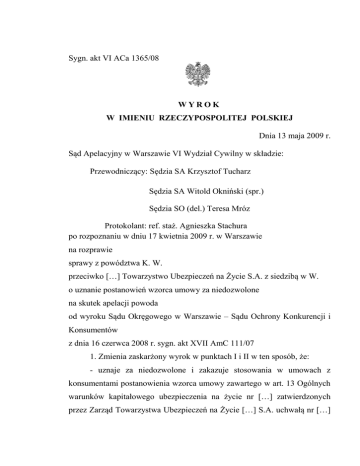 Sygn. akt VI ACa 1365/08 WYROK W IMIENIU RZECZYPOSPOLITEJ POLSKIEJ Dnia 13 maja 2009 r. Sąd Apelacyjny w Warszawie VI Wydział Cywilny w składzie: Przewodniczący: Sędzia SA Krzysztof Tucharz Sędzia SA Witold Okniński (spr.) Sędzia SO (del.) Teresa Mróz Protokolant: ref. staż. Agnieszka Stachura po rozpoznaniu w dniu 17 kwietnia 2009 r. w Warszawie na rozprawie sprawy z powództwa K. W. przeciwko […] Towarzystwo Ubezpieczeń na Życie S.A. z siedzibą w W. o uznanie postanowień wzorca umowy za niedozwolone na skutek apelacji powoda od wyroku Sądu Okręgowego w Warszawie – Sądu Ochrony Konkurencji i Konsumentów z dnia 16 czerwca 2008 r. sygn. akt XVII AmC 111/07 1. Zmienia zaskarżony wyrok w punktach I i II w ten sposób, że: - uznaje za niedozwolone i zakazuje stosowania w umowach z konsumentami postanowienia wzorca umowy zawartego w art. 13 Ogólnych warunków kapitałowego ubezpieczenia na życie nr […] zatwierdzonych przez Zarząd Towarzystwa Ubezpieczeń na Życie […] S.A. uchwałą nr […] 2 z dnia […] 2005 r., wchodzącą w życie z dniem […] 2005 r. następującej treści: „Wartość wykupu jest to procent rezerwy matematycznej przypadającej na daną umowę główną z wyłączeniem rezerwy na świadczenie dodatkowe umowy głównej, zgodnie z poniższą tabelą: Liczba pełnych lat polisowych, za które Wartość wykupu jako procent rezerwy opłacono wszystkie składki całkowite matematycznej przypadającej na daną umowę główną z wyłączeniem rezerwy na świadczenie dodatkowe umowy głównej 2 80% 3 85% 4 90% 5 i więcej 95% Wysokość wartości wykupu oblicza się według stanu rezerwy matematycznej przypadającej na umowę główną z wyłączeniem rezerwy na świadczenie dodatkowe umowy głównej, na wcześniejszy z dni (dalej: dzień wartości wykupu): a) dzień następujący po ostatnim dniu opłaconego okresu, tj. termin płatności składki całkowitej najdawniej wymagalnej albo b) dzień rozwiązania lub wygaśnięcia umowy głównej. Wartość wykupu, obliczona zgodnie z postanowieniami ust. 1 i 2, jest pomniejszana o sumę zaległych składek całkowitych lub powiększana o część opłaconej składki całkowitej należnej za okres, Ubezpieczyciel nie będzie udzielał ochrony ubezpieczeniowej. w jakim 3 Gdy składka za umowę główną została opłacona jednorazowo, Ubezpieczający nabywa prawo do wypłaty wartości wykupu dnia następnego, licząc od dnia rozpoczęcia odpowiedzialności. Wartość wykupu stanowi wtedy 95% rezerwy matematycznej z wyłączeniem rezerwy na świadczenie dodatkowe umowy głównej, przypadającej na daną umowę główną w dniu rozwiązania umowy głównej. Jeżeli dzień wartości wykupu przypada po przekształceniu umowy ubezpieczenia w ubezpieczenie bezskładkowe, to wartość wykupu stanowi 95% rezerwy matematycznej z wyłączeniem rezerwy na świadczenie dodatkowe umowy głównej”.; - nakazuje pobrać od […] Towarzystwa Ubezpieczeń na Życie S.A. z siedzibą w W. na rzecz Skarbu Państwa - Sądu Okręgowego w Warszawie kwotę 600 zł (sześćset złotych) tytułem nieuiszczonej opłaty od pozwu; II. nakazuje pobrać od […] Towarzystwa Ubezpieczeń na Życie S.A. z siedzibą w W. na rzecz Skarbu Państwa - Sądu Okręgowego w Warszawie kwotę 600 zł (sześćset złotych) tytułem nieuiszczonej opłaty od apelacji. 4 VI ACa 1365/08 UZASADNIENIE Powód K. W. wniósł o uznanie za niedozwolone postanowień art. 13 ogólnych warunków kapitałowego ubezpieczenia na życie […] Towarzystwa Ubezpieczeń na życie […] S.A w zakresie, w jakim ustalają wartość wykupu przy użyciu zwrotu „rezerwa matematyczna”. Do pozwu powód dołączył ogólne warunki kapitałowego ubezpieczenia na życie, których zakwestionowany art. 13 miał następującą treść: „1. Gdy składka za umowę główną jest opłacana regularnie, Ubezpieczony nabywa prawo do wypłaty wartości wykupu poczynając od drugiej rocznicy polisy, pod warunkiem opłacenia wszystkich składek całkowitych należnych za dwa lata polisowe. Wartość wykupu jest to procent rezerwy matematycznej przypadającej na dana umowę główną w wyłączeniem rezerwy na świadczenie dodatkowe umowy głównej zgodnie z poniższą tabelą: ________________________________________________________________________ ___ Liczba pełnych lat Wartość wykupu jako procent polisowych, za które opłacono rezerwy matematycznej wszystkie składki całkowite przypadającej na daną umowę główną z wyłączeniem rezerwy na świadczenie dodatkowe umowy głównej ________________________________________________________________________ ___ 2 80% 3 85% 4 90% 5 i więcej 95% ________________________________________________________________________ ___ 2. Wysokość wartości wykupu oblicza się według stanu rezerwy matematycznej przypadającej na umowę główną w wyłączeniem rezerwy na świadczenie dodatkowe umowy głównej, na wcześniejszy z dni (dalej: dzień wartości wykupu): a) dzień następujący po ostatnim dniu opłaconego okresu, tj. termin płatności składki całkowitej najdawniej wymagalnej albo b) dzień rozwiązania lub wygaśnięcia umowy głównej. 3. Do czynników uwzględnionych w metodach kalkulacji rezerw technicznoubezpieczeniowych, które mogą mieć wpływ na wysokość wartości wykupu, zalicza się: a) płeć, wiek Ubezpieczonego oraz wysokość składki za umowę główną w dniu rozpoczęcia odpowiedzialności; 5 b) czas trwania umowy głównej; c) wariant umowy głównej; d) dzień wartości wykupu; e) udział w zysku naliczony zgodnie z zasadami wskazanymi w art. 15; f) wysokość gwarantowanej sumy ubezpieczenia na dzień wartości wykupu. 4. Wartość wykupu, obliczona zgodnie z postanowieniami ust. 1 i 2, jest pomniejszona o sumę zaległych składek całkowitych lub powiększona o część opłaconej składki całkowitej należnej za okres, w jakim Ubezpieczyciel nie będzie udzielał ochrony ubezpieczeniowej. 5. Gdy