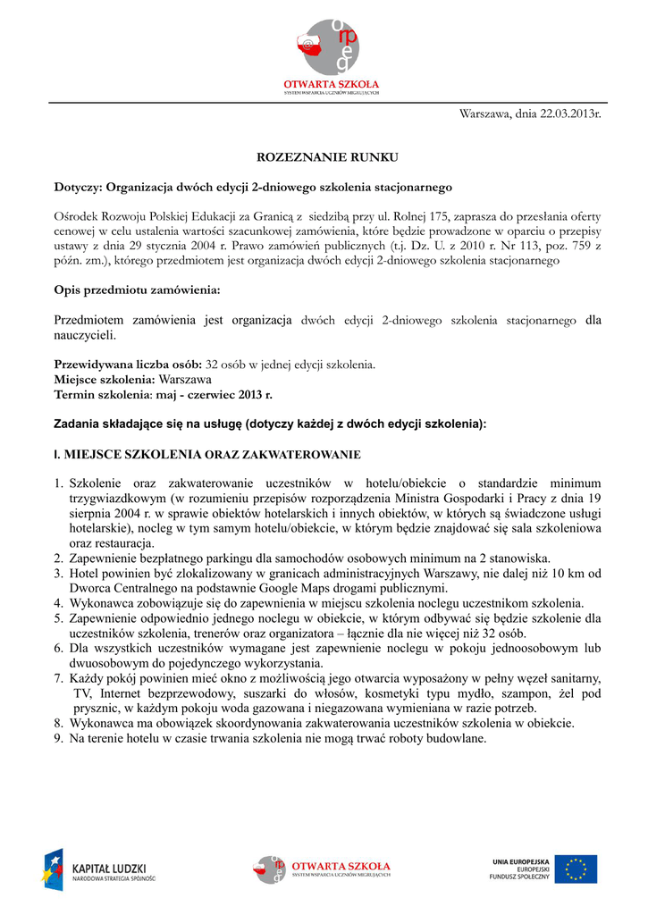 Warszawa, dnia 22.03.2013r. ROZEZNANIE RUNKU Dotyczy: Organizacja dwóch edycji 2-dniowego szkolenia stacjonarnego Ośrodek Rozwoju Polskiej Edukacji za Granicą z siedzibą przy ul. Rolnej 175, zaprasza do przesłania oferty cenowej w celu ustalenia wartości szacunkowej zamówienia, które będzie prowadzone w oparciu o przepisy ustawy z dnia 29 stycznia 2004 r. Prawo zamówień publicznych (t.j. Dz. U. z 2010 r. Nr 113, poz. 759 z późn. zm.), którego przedmiotem jest organizacja dwóch edycji 2-dniowego szkolenia stacjonarnego Opis przedmiotu zamówienia: Przedmiotem zamówienia jest organizacja dwóch edycji 2-dniowego szkolenia stacjonarnego dla nauczycieli. Przewidywana liczba osób: 32 osób w jednej edycji szkolenia. Miejsce szkolenia: Warszawa Termin szkolenia: maj - czerwiec 2013 r. Zadania składające się na usługę (dotyczy każdej z dwóch edycji szkolenia): I. MIEJSCE SZKOLENIA ORAZ ZAKWATEROWANIE 1. Szkolenie oraz zakwaterowanie uczestników w hotelu/obiekcie o standardzie minimum trzygwiazdkowym (w rozumieniu przepisów rozporządzenia Ministra Gospodarki i Pracy z dnia 19 sierpnia 2004 r. w sprawie obiektów hotelarskich i innych obiektów, w których są świadczone usługi hotelarskie), nocleg w tym samym hotelu/obiekcie, w którym będzie znajdować się sala szkoleniowa oraz restauracja. 2. Zapewnienie bezpłatnego parkingu dla samochodów osobowych minimum na 2 stanowiska. 3. Hotel powinien być zlokalizowany w granicach administracyjnych Warszawy, nie dalej niż 10 km od Dworca Centralnego na podstawnie Google Maps drogami publicznymi. 4. Wykonawca zobowiązuje się do zapewnienia w miejscu szkolenia noclegu uczestnikom szkolenia. 5. Zapewnienie odpowiednio jednego noclegu w obiekcie, w którym odbywać się będzie szkolenie dla uczestników szkolenia, trenerów oraz organizatora – łącznie dla nie więcej niż 32 osób. 6. Dla wszystkich uczestników wymagane jest zapewnienie noclegu w pokoju jednoosobowym lub dwuosobowym do pojedynczego wykorzystania. 7. Każdy pokój powinien mieć okno z możliwością jego otwarcia wyposażony w pełny węzeł sanitarny, TV, Internet bezprzewodowy, suszarki do włosów, kosmetyki typu mydło, szampon, żel pod prysznic, w każdym pokoju woda gazowana i niegazowana wymieniana w razie potrzeb. 8. Wykonawca ma obowiązek skoordynowania zakwaterowania uczestników szkolenia w obiekcie. 9. Na terenie hotelu w czasie trwania szkolenia nie mogą trwać roboty budowlane. II. SALA SZKOLENIOWA 1. Wykonawca zobowiązuje się do zapewnienia klimatyzowanej sali szkoleniowej łącznie dla nie więcej niż 30 osób zlokalizowanej w tym samym obiekcie co hotel. 2. Powierzchnia sali powinna być na tyle duża, aby zapewnić swobodny rozstaw krzeseł, stolików oraz wyposażenia sali szkoleniowej. 3. Miejsca siedzące dla każdego uczestnika szkolenia na sali szkoleniowej powinny być w układzie szkolnym, z możliwością wykonywania notatek przez uczestników szkolenia. 4. Zapewnienie obsługi technicznej sali szkoleniowej podczas dwóch edycji szkolenia. 5. W hotelu oraz przed wejściem do sali szkoleniowej powinna znaleźć się informacja na temat szkolenia, logo projektu „Otwarta szkoła- system wsparcia uczniów migrujących” informacja, że szkolenie jest współfinansowane ze środków Europejskiego Funduszu Społecznego Programu Operacyjnego Kapitał Ludzki, logo Unii Europejskiej zgodnie z Księgą Identyfikacji Wizualnej NSS. Wyposażenie sali szkoleniowych 6. Nagłośnienie (głośniki oraz mikrofon bezprzewodowy wraz z zestawem zapasowych baterii), stół minimum 1-osobowy dla trenera wraz z miejscem do siedzenia, rzutnik, oprogramowanie umożliwiające wyświetlenie prezentacji przygotowanej przez trenera, ekran do wyświetlania prezentacji, stoły dla uczestników szkolenia, 7. Laptopy dla 30 uczestników szkolenia z mikrofonem, kamerą oraz oprogramowaniem: Windows 7 lub Vista; MS Office 2007 lub 2010; Adobe Reader XI wersja w języku polskim; przeglądarką Microsoft Internet Explorer (IE), wersja przynajmniej 7.0, Mozilla Firefox. Wykorzystywana przeglądarka powinna mieć: włączona obsługa skryptów języka JavaScript, włączona obsługa kaskadowych arkuszy stylów (CSS), włączona obsługa plików cookie, wyłączone blokowanie wyskakujących okien dla witryny serwera LMS, włączona obsługa protokołu SSL w wersji przynajmniej SSL 3. Dodatkowo wymagane jest następujące oprogramowanie: Adobe Flash Player, wersja przynajmniej 9, Java Runtime Environment. 8. Zapewnienie dostępu do prądu i możliwości ładowania laptopów w trakcie szkolenia np. wyposażenie w przedłużacze. 9. Zapewnienie ciągłego dostępu do Internetu szerokopasmowego bezprzewodowego. 10. Sala szkoleniowa musi posiadać dostęp do światła dziennego. III. PRZYGOTOWANIE I ORGANIZACJA SZKOLENIA 1. Przygotowanie identyfikatorów wszystkim uczestnikom szkolenia zgłoszonym w terminie określonym przez Zamawiającego, zgodnie z wytycznymi Zamawiającego. 2. Najpóźniej w przeddzień szkolenia Wykonawca odbierze z siedziby Zamawiającego w Warszawie materiały szkoleniowe, publikacje oraz akcesoria szkoleniowe (w tym również wizualizacji typu: roll-upy, plakaty, ulotki) z miejsca wskazanego przez Zamawiającego oraz dostarczy je na miejsce szkolenia. Wykonawca zapewni załadunek oraz rozładunek w/w akcesoriów, w momencie udostępnienia obiektu szkoleniowego Wykonawca jest odpowiedzialny za ustawienie, wizualizacji w sali szkoleniowej. 3. Załadowanie i odwiezienie, po zakończeniu wydarzenia, na miejsce wskazane przez Zamawiającego wszystkich elementów wystawy, wizualizacji (roll-upy i inne) przeznaczonych do zagospodarowania sali szkoleniowych a następnie ich rozładowanie w siedzibie Zamawiającego w Warszawie. IV. OBSŁUGA SZKOLENIA 1. Wykonawca jest zobowiązany do ścisłej współpracy z Zamawiającym przy obsłudze szkolenia 2. Wykonawca jest zobowiązany do: 1) Rejestracji uczestników, dystrybucji materiałów szkoleni