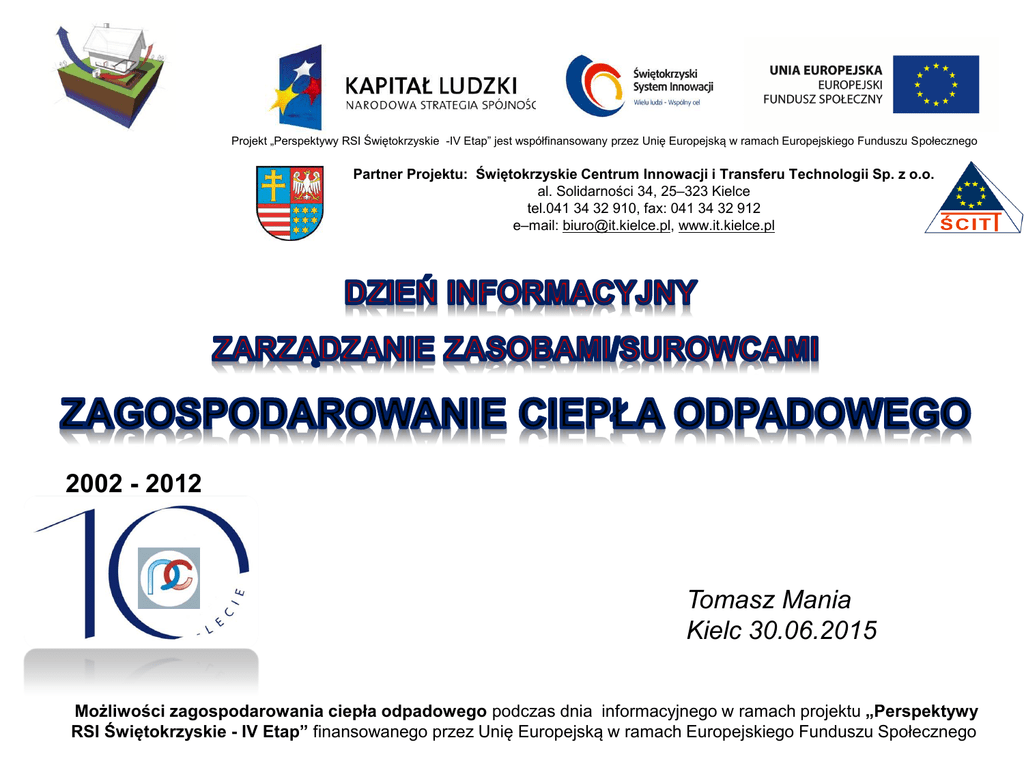Projekt „Perspektywy RSI Świętokrzyskie -IV Etap” jest współfinansowany przez Unię Europejską w ramach Europejskiego Funduszu Społecznego Partner Projektu: Świętokrzyskie Centrum Innowacji i Transferu Technologii Sp. z o.o. al. Solidarności 34, 25–323 Kielce tel.041 34 32 910, fax: 041 34 32 912 e–mail: [email protected], www.it.kielce.pl 2002 - 2012 Tomasz Mania Kielc 30.06.2015 Możliwości zagospodarowania ciepła odpadowego podczas dnia informacyjnego w ramach projektu „Perspektywy RSI Świętokrzyskie - IV Etap” finansowanego przez Unię Europejską w ramach Europejskiego Funduszu Społecznego Tomasz Mania PREZES ZARZĄDU Polskiego Stowarzyszenia Pomp Ciepła Uniwersytet Technologiczno - Przyrodniczy Bydgoszcz Sopocka Szkoła Wyższa SOPOT e-mail: [email protected]; tel.506-792-051 Możliwości zagospodarowania ciepła odpadowego podczas dnia informacyjnego w ramach projektu „Perspektywy RSI Świętokrzyskie - IV Etap” finansowanego przez Unię Europejską w ramach Europejskiego Funduszu Społecznego Wstęp - podstawy odzysku i sposoby wykorzystania energii cieplnej odpadowej - ocena zasobów energii odpadowej - wskaźniki jakościowe i ilościowe - źródła ciepła odpadowego - instalacje grzewcze - chłodnicze i klimatyzacyjne itp. - instalacje odzysku ciepła - przykłady wykorzystania ciepła odpadowego - podsumowanie Możliwości zagospodarowania ciepła odpadowego podczas dnia informacyjnego w ramach projektu „Perspektywy RSI Świętokrzyskie - IV Etap” finansowanego przez Unię Europejską w ramach Europejskiego Funduszu Społecznego Literatura Możliwości zagospodarowania ciepła odpadowego podczas dnia informacyjnego w ramach projektu „Perspektywy RSI Świętokrzyskie - IV Etap” finansowanego przez Unię Europejską w ramach Europejskiego Funduszu Społecznego Literatura Możliwości zagospodarowania ciepła odpadowego podczas dnia informacyjnego w ramach projektu „Perspektywy RSI Świętokrzyskie - IV Etap” finansowanego przez Unię Europejską w ramach Europejskiego Funduszu Społecznego Literatura Możliwości zagospodarowania ciepła odpadowego podczas dnia informacyjnego w ramach projektu „Perspektywy RSI Świętokrzyskie - IV Etap” finansowanego przez Unię Europejską w ramach Europejskiego Funduszu Społecznego Pojęcie Energii Nazwa pochodzi od T. Younga (1807r). ENERGIA (jedna z podstawowych wielkości fizycznych) – jest skalarną wielkością charakteryzującą stan układu; służy do ilościowego określenia różnych rodzajów ruchu i wzajemnego oddziaływania układów fizycznych (ciał, układów ciał, pól fizycznych). (W myśl Dyrektywy 2012/27/UE energia oznacza wszelkie formy nośników energii, paliwa, energię cieplną, energię ze źródeł odnawialnych, energię elektryczną lub każdą inną formę energii) Zasada zachowania energii: w odosobnionym układzie ciał całkowita energia w nim zawarta jest wielkością niezmienną. Energia nie może powstać z niczego, ani całkowicie zniknąć. Może przepływać z układu do otoczenia lub na odwrót. Może podlegać konwersji z jednej postaci w drugą. Sposoby doprowadzania i wyprowadzania energii w urządzeniach technicznych: - za pomocą prądu elektrycznego, - przez wykonanie pracy mechanicznej, - przez przepływ ciepła, - za pomocą strumienia czynnika. Energia i nośniki energii Przemiany energii: -przetwarzanie energii z jednej postaci w inną -zmiana parametrów nośnika energii: - transformacja, tzn. zmiana parametrów tego samego nośnika (wymiennik ciepła, transformator) konwersja, tzn. zmiana rodzaju nośnika (kocioł: en.chem. paliwa en. spalin en. pary wodnej) (turbozespół: en. pary wodnej en. mech. en.elektrycz.) Przetwórnie energii: -elektrownie: cieplne (kondensacyjne, spalinowe, geotermalne), wodne, wiatrowe, -elektrociepłownie i ciepłownie, -gazownie, koksownie, -rafinerie. Energia i nośniki energii Podział energii: -proste zjawiska fizyczne – energia mechaniczna, elektromagnetyczna, grawitacyjna, chemiczna, jądrowa -układy ciał makroskopowych (domena termodynamiki): energia zewnętrzna: - en. kinetyczna ruchu makroskopowego układu (ruch postępowy, obrotowy, płaski) - en. potencjalna układu w zewnętrznym polu sił energia wewnętrzna: - en. ruchu postępowego i obrotowego cząsteczek - en. ruchu drgającego (oscylacji) atomów w cząsteczkach - en. potencjalna sił międzycząsteczkowych - en. stanów elektronowych w atomach i cząsteczkach - en. chemiczna, związana ze zmianami budowy chemicznej cząsteczek - en. jądrowa, związana ze zmianami budowy jąder atomów Energia i nośniki energii Poziomy wykorzystania energii: energia pierwotna (nie podlegała żadnej przemianie) = nieodnawialne zasoby pierwotnych paliw organicznych (węgiel kamienny i brunatny, drewno, torf, ropa naftowa, gaz), energia wtórna (uzyskana w wyniku przemian dokonanych na energii pierwotnej lub innej wtórnej) energia elektryczna, energia cieplna, paliwa wtórne: stałe, ciekłe i gazowe (koks, benzyna, olej opałowy, LPG itd.) nośniki energii: woda, para wodna, wodór, sprężone powietrze itd. Energia wtórna: -en. bezpośrednia (do przesyłania), -en. użyteczna (dopasowana do odbiorników): en. świetlna – lampy (prawie wyłącznie en. elektryczna), en. mechaniczna – silniki en. cieplna nisko-, średnio- i wysokotemperaturowa – grzejniki, termy, piece, reaktory en. chemiczna – reaktory chemiczne (przemysłowe procesy technologiczne) Ciepło Ciepło to forma transportu energii termicznej (składowej energii wewnętrznej); transport ten odbywa się w sposób samorzutny od jednego ciała do drugiego na skutek istniejącej między nimi różnicy temperatury (gradientu temperatury) promieniowanie Zgodnie z drugą zasadą termodynamiki następuje zatem wymiana energii, przy czym część układu czy też układ o temperaturze wyższej oddaje energię układowi o temperaturze niższej. Związki ilościowe określające ilości wymienian