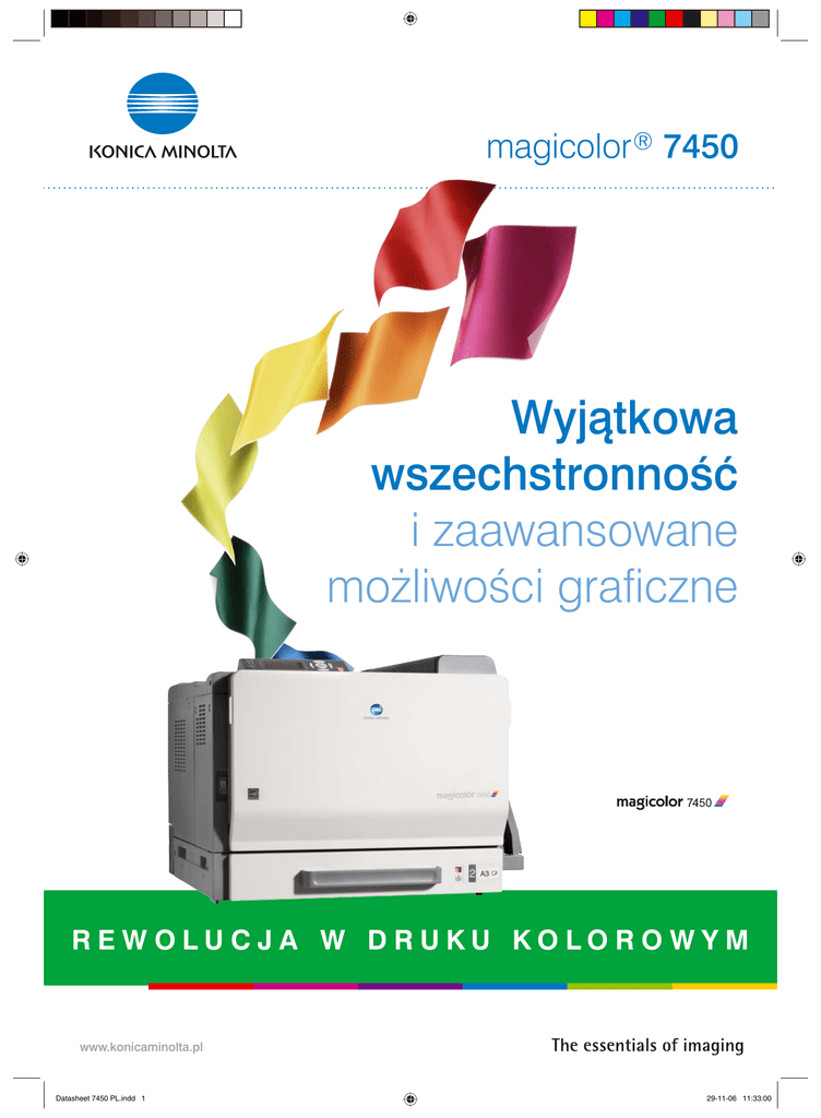magicolor ® 7450 Wyjàtkowa wszechstronnoÊç i zaawansowane mo˝liwoÊci graficzne REWOLUCJA W DRUKU KOLOROWYM www.konicaminolta.pl Datasheet 7450 PL.indd 1 29-11-06 11:33:00 Wyjàtkowa wszechstronnoÊç i zaawansowane mo˝liwoÊci graficzne Je˝eli poszukujesz drukarki, która zapewni optymalnà jakoÊç, moc, pr´dkoÊç i wszechstronnoÊç, to nie dokonasz lepszego wyboru. magicolor® 7450 firmy Konica Minolta - drukarka z górnej pó∏ki. Mo˝e ona drukowaç du˝e iloÊci dokumentów na raz, a tak˝e arkusze grafiki o du˝ym obszarze pokrycia, wykonujàc wszystkie zadania w rekordowo krótkim czasie. Wszechstronna obs∏uga mediów i du˝a wydajnoÊç materia∏ów eksploatacyjnych ograniczajà zakres niezb´dnych czynnoÊci serwisowych i konserwacyjnych do minimum, dzi´ki czemu ta drukarka mo˝e spe∏niç wymagania ka˝dego u˝ytkownika. Obs∏uga wszystkich scenariuszy drukowania We wspó∏czesnym biurze, pr´dkoÊç ma zasadnicze znaczenie. Druk z pr´dkoÊcià 25 stron/min w formacie A4 oraz 13 stron/min. w formacie A3 (pierwszy wydruk ju˝ po 10 sekundach) powoduje, ˝e ta maszyna nie b´dzie marnowaç Twojego czasu. Nie obcià˝à jej tak˝e wysokiej jakoÊci wydruki kolorowe - nadruki w formacie A3+ i bannery o d∏ugoÊci do 1,2 metra sà wykonywane szybko i sprawnie. ElastycznoÊç to podstawowa cecha magicolor® 7450. Mo˝liwoÊç druku na mediach o gramaturze do 256 g/m2 oraz do 210 g/m2 w przypadku druku dwustronnego pozwoli Ci otrzymaç raporty, broszury i ulotki o profesjonalnej jakoÊci. Co wi´cej, wymiana kaset z tonerem nie jest nadmiernie cz´sta - zapewniajà to wysokowydajne materia∏y eksploatacyjne. RozdzielczoÊç 600 x 600 x 4 bity Photo ART™ contone zapewnia wierne odwzorowanie kolorów, dzi´ki czemu uzyskujesz niezwykle precyzyjnà grafik´ i tekst. Skuteczne po∏àczenie mocy i pr´dkoÊci Zaawansowany sterownik Emperon™, stosowany wy∏àczenie w urzàdzeniach Konica Minolta, zapewnia magicolor® 7450 imponujàcà moc. Emulacja PostScript 3, PCL XL2.1 i PCL 5e/c umo˝liwia jednoczesny druk z ró˝nych grup roboczych i aplikacji - wydruk 25 stron kolorowych lub czarno-bia∏ych formatu A4 lub 13 stron formatu A3 trwa zaledwie jednà minut´. Przetwarzajàc dokumenty z niewiarygodnà szybkoÊcià, Emperon zapewnia niespotykany dotàd poziom wydajnoÊci dla wymagajàcych Êrodowisk sieciowych poprzez niemal ca∏kowite wyeliminowanie czasu czekania na realizacj´ zadania przez drukark´. Datasheet 7450 PL.indd 2 29-11-06 11:33:02 magicolor ® 7450 Bezkompromisowa jakoÊç kolorów Znakomita rozdzielczoÊç 600 x 600 x 4 bity Photo ART™ contone zapewnia najwy˝szà jakoÊç wydruków wykonywanych przez magicolor® 7450. Fotograficzne szczegó∏y i skale szaroÊci sà odwzorowywane p∏ynnie i dok∏adnie - zarówno w przypadku druku kolorowego, jak i monochromatycznego. Na jeden piksel przypadajà a˝ cztery bity (16 poziomów), podczas gdy wi´kszoÊç drukarek zapewnia tylko jeden bit (dwa poziomy) na piksel. Zaawansowana technologia tonerów zapewnia profesjonalnà jakoÊç druku Simitri™ to opracowany przez firm´ Konica Minolta unikalny toner polimeryzowany nowej generacji. Niezwykle precyzyjny i jednolity kszta∏t i Êrednica czàstek zapewniajà oszcz´dne i wyjàtkowo dok∏adne drukowanie obrazów cyfrowych wysokiej jakoÊci. W po∏àczeniu z unikalnym systemem zarzàdzania kolorami magicolor® 7450, gwarantuje to idealne odwzorowanie cienkich linii i ma∏ych liter, podczas gdy fotografie i ilustracje wyglàdajà bardziej naturalnie dzi´ki lepszemu nanoszeniu pó∏tonów. Rozmiar i kszta∏t czàstek tonera zwi´ksza przestrzeƒ koloru i poprawia ostroÊç druku. JednoczeÊnie Simitri™ zapewnia bardziej równomierne pokrycie, dzi´ki czemu koszt na stron´ jest ni˝szy. A poniewa˝ nie ma ˝adnego oleju do wymiany, ˝ywotnoÊç b´bna Êwiat∏oczu∏ego drukarki jest d∏u˝sza. W ostatecznym rozrachunku przek∏ada si´ to na ni˝szy koszt eksploatacji. Konwencjonalny toner Toner polimeryzowany Simitri Funkcja bezpoÊredniego drukowania zdj´ç (Direct PhotoPrint) Drukarka magicolor® 7450 obs∏uguje wydruk zdj´ç bezpoÊrednio z aparatów cyfrowych zgodnych ze standardem PictBridge. Ca∏y proces jest szybki i prosty, a ponadto nie wymaga u˝ycia komputera. Korzystajàc z druku indeksowego, na poczàtku mo˝na wydrukowaç arkusz sprawdzajàcy ∏àcznoÊç urzàdzeƒ. Co wi´cej, mo˝liwoÊç skalowania i obracania obrazów zwi´ksza wygod´ zarzàdzania i edytowania zdj´ç – wszystko z poziomu aparatu. Datasheet 7450 PL.indd 3 29-11-06 11:33:12 magicolor ® 7450 DANE TECHNICZNE Proces druku Metoda druku: elektrofotograficzna SzybkoÊç drukowania A4: do 25 str./min kolorowy i czarno-bia∏y SzybkoÊç drukowania A3: do 13 str./min kolorowy i czarno-bia∏y Wydruk pierwszej strony: 9,5 sek. (mono), 11,5 sek. (kolor) Czas nagrzewania: 99 sekund. RozdzielczoÊç: 600 x 600 x 4-bit Photo ART™ contone (tony ciàg∏e) Sugerowane obcià˝enie: 120 000 stron miesi´cznie Dane fizyczne Wymiary: (szer. x gł. x wys.) 606 x 648 x 477 mm Masa: 51 kg bez mat. eksploatacyjnych, ok. 80 kg z mat. eksploatacyjnymi WłaÊciwoÊci sprz´towe i programowe Procesor: Freescale PowerPC, 7447A (733 MHz) Pami´ç RAM: 256 MB (maks. 1024 MB) J´zyki opisu strony: PostScript 3, PCL XL 2,1, PCL 5e/c Druk bezpoÊredni: PDF (wersja 1.4), JPEG, TIFF (wymagany jest dysk twardy lub karta CompactFlash) Gniazdo karty CF Zarzàdzanie drukarkà: PageScope™ NetCare, PageScope™ Web Connection, PageScope™ Network Setup, PageScope™ Peer to Peer Printing Tool, PageScope™ EMS plug-in, PageScope™ Web Jet Admin plug-in, PageScope™ Plug and Print, PageScope™ NDPS Gateway, download manager, monitor druku, monitor stanu Warunki otoczenia Temperatura: w czasie druku 10 do 35OC, w stanie spoczynku 0 do 35OC WilgotnoÊç: w czasie druku 15% do 85% RH, w stanie spoczynku 10% do 85% RH Poziom hałasu: w czasie druku <52 dB(A), w stanie spoczynku <40 