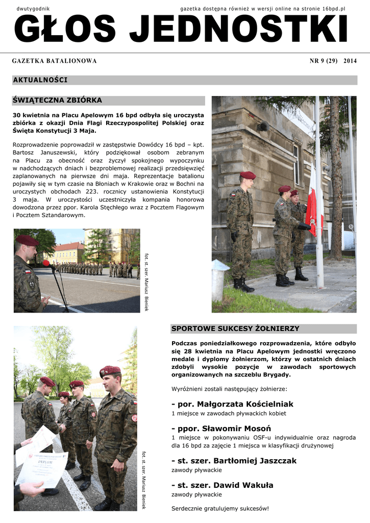 GŁOS JEDNOSTKI dwuty god nik gazetk a dostęp na ró w ni eż w wers ji o nl ine na s tro ni e 16bpd .pl GAZETKA BATALIONOWA NR 9 (29) 2014 AKTUALNOŚCI ŚWIĄTECZNA ZBIÓRKA 30 kwietnia na Placu Apelowym 16 bpd odbyła się uroczysta zbiórka z okazji Dnia Flagi Rzeczypospolitej Polskiej oraz Święta Konstytucji 3 Maja. Rozprowadzenie poprowadził w zastępstwie Dowódcy 16 bpd – kpt. Bartosz Januszewski, który podziękował osobom zebranym na Placu za obecność oraz życzył spokojnego wypoczynku w nadchodzących dniach i bezproblemowej realizacji przedsięwzięć zaplanowanych na pierwsze dni maja. Reprezentacje batalionu pojawiły się w tym czasie na Błoniach w Krakowie oraz w Bochni na uroczystych obchodach 223. rocznicy ustanowienia Konstytucji 3 maja. W uroczystości uczestniczyła kompania honorowa dowodzona przez ppor. Karola Stęchłego wraz z Pocztem Flagowym i Pocztem Sztandarowym. fot. st. szer. Mariusz Bieniek SPORTOWE SUKCESY ŻOŁNIERZY Podczas poniedziałkowego rozprowadzenia, które odbyło się 28 kwietnia na Placu Apelowym jednostki wręczono medale i dyplomy żołnierzom, którzy w ostatnich dniach zdobyli wysokie pozycje w zawodach sportowych organizowanych na szczeblu Brygady. Wyróżnieni zostali następujący żołnierze: - por. Małgorzata Kościelniak 1 miejsce w zawodach pływackich kobiet - ppor. Sławomir Mosoń 1 miejsce w pokonywaniu OSF-u indywidualnie oraz nagroda dla 16 bpd za zajęcie 1 miejsca w klasyfikacji drużynowej fot. st. szer. Mariusz Bieniek - st. szer. Bartłomiej Jaszczak zawody pływackie - st. szer. Dawid Wakuła zawody pływackie Serdecznie gratulujemy sukcesów! 2 AKTUALNOŚCI C. D. SZESNASTKA W MEMORIALE PROMOCJA WOJSKA W BOCHNI 6 kwietnia w Krakowie odbył się II Memoriał im. gen. brygady Włodzimierza Potasińskiego. Żołnierze 16 bpd zajęli w nim II miejsce. 3 maja delegacja składająca się z żołnierzy oraz pracowników 16 bpd wzięła udział w bocheńskich uroczystych obchodach 223. rocznicy uchwalenia Konstytucji 3 Maja. Memoriał organizowany jest dla uczczenia pamięci dowódcy wojsk specjalnych – gen. brygady Włodzimierza Potasińskiego, który zginął w katastrofie smoleńskiej. Z tej okazji jednostka przygotowała pokaz sprzętu wojskowego i wyposażenia żołnierzy oraz punkt promocyjnoinformacyjny. Żołnierze (oraz uczniowie szkół) rywalizowali w trzech konkurencjach: strzelanie, pływanie i bieg przełajowy. Klasyfikacja generalna – zespoły wojskowe: 1. 2. 3. Jednostka Wojskowa FORMOZA Gdynia 16 bpd Jednostka Wojskowa Komandosów Lubliniec Klasyfikacja generalna – żołnierze indywidualnie 1. 2. 3. Sławomir Maczański (FORMOZA) St. szer. Wojciech Bardzyński (16 bpd) Adam Sadowski (FORMOZA) fot. Kamila Krukowska WIZYTA SZKOŁY 25 kwietnia 2014 r. koszary 16 bpd odwiedzili uczniowie CXXV Liceum Ogólnokształcącego z Zespołu Szkół nr 7 w Warszawie. Celem wizyty było zapoznanie młodzieży z klas o profilu wojskowym z wyposażeniem żołnierzy 16 bpd. Do każdego stanowiska został wyznaczony instruktor, który szczegółowo opisywał prezentowany sprzęt. Uczniowie zostali również zapoznani ze sprzętem spadochronowym i transportowym (motor i kład). fot. st. szer. Mariusz Bieniek 3 WYWIAD UCHWYCONY W BIEGU WYWIAD Z PPOR. SŁAWOMIREM MOSONIEM Z 1 KSZ – PRZEPROWADZIŁA BARBARA FABIŚ – STARSZY INSTRUKTOR KLUBU 16 bpd KLUB: Od kiedy jest Pan żołnierzem wcześniej służył Pan w innej jednostce? szesnastki? Czy PPOR. SŁAWOMIR MOSOŃ: Żołnierzem szesnastki jestem od 14 sierpnia 2013 r. Zaraz po ukończeniu Szkoły Oficerskiej we Wrocławiu trafiłem do tej jednostki na stanowisko dowódcy plutonu. Zanim rozpocząłem studia we Wrocławiu, chodziłem w liceum do klasy o profilu wojskowym. Naszym „patronem” był wówczas 6 batalion dowodzenia, przez co można powiedzieć, że bordowy beret nosiłem już zanim poszedłem do szkoły oficerskiej. K: Obecnie jest Pan aktywnym żołnierzem 1 ksz. Proszę uzasadnić to stwierdzenie. SM: Robię to, co do mnie należy. Staram się wykonywać obowiązki wynikające z mojego stanowiska najlepiej jak potrafię. Poza tym, dużo czasu poświęcam na WF, który jest ważnym elementem funkcjonowania w szesnastce. Działam też poza jednostką. Razem z kolegą, ppor. Grabowskim wpadliśmy na pomysł zorganizowania drużyny do gry w piłkę nożną w ramach ligi amatorskiej na terenie Krakowa. K: Właśnie, jest Pan piłkarzem Futbolowej Ligi Szóstek. Proszę powiedzieć coś więcej na ten temat – skąd ta inicjatywa? Dlaczego akurat piłka nożna? SM: W piłkę gram od zawsze. Będąc 5 lat we Wrocławiu grałem w drużynie reprezentującej WSO we WrocBal-u (odpowiednik FLS-u, czyli ligi amatorskiej tutaj w Krakowie). Reprezentując barwy uczelni mogliśmy po prostu robić to, co lubimy – dobrze się przy tym bawiąc. I taki cel ma też ekipa reprezentująca 16 bpd. Sukcesy z Wrocławia nakręcały do dalszej aktywności na arenie Wrocławia, ale nastał czas, kiedy to drużyna w postaci kilkunastu podporuczników rozjechała się po kraju do swoich jednostek. Stąd też pomysł na to, aby stworzyć reprezentację 16 bpd i równie dobrze się bawić. Pierwsze sukcesy mamy za sobą. Teraz kolejne 3 punkty w każdym ligowym meczu przybliżają nas do kolejnego sukcesu itd. Ligę Szóstek traktujemy też jako przygotowanie się do zawodów mających wyższą rangę np. Mistrzostw Polski Służb Mundurowych, które już niebawem. K: Czy mógłby Pan krótko opisać swoją przygodę z Ośrodkiem Sprawności Fizycznej oraz zrelacjonować ostatnie zawody na szczeblu Brygady? SM: Długo mógłbym mówić na ten temat Już od pierwszego roku studiów uczestniczyłem w Mistrzostwach Wojska Polskiego właśnie w pokonywaniu OSF-u. Zawody zawsze kończyłem w pierwszej dziesiątce na szczeblu Wojska Polskiego, co dla mnie było dużym sukcesem. Stąd też wzięła się moja delegacja na ostatnie zawody w Brygadzie. Wystartowaliśmy tam w jednym biegu,