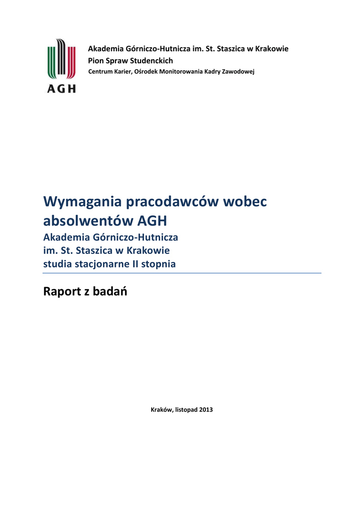 Akademia Górniczo-Hutnicza im. St. Staszica w Krakowie Pion Spraw Studenckich Centrum Karier, Ośrodek Monitorowania Kadry Zawodowej Wymagania pracodawców wobec absolwentów AGH Akademia Górniczo-Hutnicza im. St. Staszica w Krakowie studia stacjonarne II stopnia Raport z badań Kraków, listopad 2013 METODYKA BADANIA Badania wśród pracodawców są prowadzone przez Centrum Karier od 2002 roku w odstępach co trzy lata, ostanie w 2013 roku. Uzupełnieniem badań ilościowych są badania jakościowe (wywiady pogłębione). Z przeprowadzonych sondaży (konferencje, seminaria, spotkania) wynika że AGH jest jedyną uczelnią w Polsce, która prowadzi tego typu badania. Celem badań jest m.in. uzyskanie danych na temat: informacji o obecnie zatrudnianych absolwentach AGH, wpływu doświadczenia zawodowego nabytego w trakcie studiów (praktyki, staże, wymiany zagraniczne i inne) na wybór kandydata do pracy, planów praktyk i programów adresowanych do studentów AGH, wymagań wobec kandydatów do pracy, preferencji pracodawców z uwagi na ukończony stopień studiów, średnią ocen i innych czynników, planów zatrudnienia w perspektywie trzech lat , zatrudniania osób niepełnosprawnych na otwartym rynku pracy. Badana grupa Dobór grupy: Pracodawcy z całej Polski współpracujący z AGH i zatrudniający absolwentów AGH. Kluczem takiego doboru była m.in.: możliwość wyrażenia przez pracodawców opinii na temat absolwentów AGH, większa gotowość pracodawców do wypełnienia kwestionariusza ankiety. Dobór branżowy firm reprezentował wszystkie kierunki kształcenia w AGH. Wielkość firmy nie miała znaczenia. Narzędzie badawcze: kwestionariusz ankiety (pytania zamknięte i otwarte). Czas przeprowadzenia badań: Badania ilościowe: kwestionariusz ankiety został rozesłany w styczniu 2013 do wszystkich (569) firm objętych badaniem. Ankietowanie pracodawców trwało włącznie do października 2013. Tak duża rozpiętość czasowa wynikała z braku zwrotu (pomimo kilkakrotnych monitów) wypełnionych praz pracodawców kwestionariuszy. Podsumowania wyników dokonano w listopadzie 2013. Badania jakościowe: marzec – wrzesień 2013 Sposób pozyskiwania danych do badań: badania ilościowe – Internet (CAWI) badania jakościowe - rozmowy bezpośrednie (wywiady z pracodawcami na temat aktualnych wymagań prowadzone są na bieżąco niezależnie od prowadzonych badań) Pracodawcy 2013 2 Responsywność badania: Liczba wysłanych ankiet: 569 Liczba zwróconych i wypełnionych ankiet: 124 Liczba częściowo wypełnionych ankiet: 133 Wywiady pogłębione: 37 1. Rynek pracy/ zatrudnienie absolwentów AGH Spośród 124 pracodawców, którzy odesłali wypełniony kwestionariusz ankiety – 104 zatrudniło absolwentów AGH w ramach rekrutacji prowadzonych w 2012 roku (Tabela 1). Pracodawcy, którzy nie zatrudnili absolwentów AGH twierdzili (wywiady), iż pomimo zamieszczanych ofert pracy nie było odzewu ze strony absolwentów AGH. We wszystkich ankietowanych firmach pracowali absolwenci AGH z dłuższym lub krótszym stażem zawodowym, a w 112 firmach byli najliczniej reprezentowaną grupą (Tabela 2). Tabela 1. Zatrudnienie absolwentów AGH w roku 2012. Badania pracodawców 2013. Zatrudnienie absolwentów AGH w 2012 roku Wybór odpowiedzi Tak Nie Brak danych Razem Liczba wskazań pracodawców 104 10 10 124 %N=124 83,9% 8,1% 8,1% 100,0% Tabela 2. Uczelnie, po których absolwenci są najliczniej reprezentowani. Badania pracodawców 2013. Uczelnie po których absolwenci są najliczniej reprezentowani Wybór odpowiedzi AGH Politechnika Krakowska Politechnika Śląska Politechnika Warszawska Uniwersytet Ekonomiczny w Krakowie Uniwersytet Jagielloński Politechnika Poznańska Politechnika Wrocławska Szkoła Główna Handlowa Politechnika Lubelska Liczba wskazań %N=124 112 24 13 10 9 9 6 6 6 3 90,3% 19,4% 10,5% 8,1% 7,3% 7,3% 4,8% 4,8% 4,8% 2,4% 2. Praktyki, staże, programy adresowane do studentów. 80,6% firm zapewniało praktyki dla studentów AGH (Tabela 3). Pracodawcy najchętniej organizują praktyki dla studentów po trzecim i czwartym roku w okresie wakacyjnym, a nieliczni w trakcie roku Pracodawcy 2013 3 akademickiego. Najwięcej firm organizujących praktyki jest zlokalizowana na terenie woj. małopolskiego, następnie mazowieckiego i śląskiego. 83 pracodawców przyjmujących praktykantów nie przewidywało dofinansowania praktyk dla studentów po 3 roku studiów. Natomiast w przypadku studentów po 4 roku studiów, 38 pracodawców w ramach praktyki podpisywało ze studentami umowę zlecenie. 24 pracodawców planowała, bądź już organizowała praktyki (staże studenckie) w trakcie roku akademickiego. Wg pracodawców program tych praktyk lub staży nie koliduje z zajęciami w trybie studiów stacjonarnych i jest dostosowany do indywidualnego planu zajęć studenta. Firmy, które nie wyrażały zainteresowania organizacją praktyk tłumaczyły to brakiem (szczególnie w okresie wakacyjnym) odpowiedniej kadry, która mogłaby być delegowana do opieki nad praktykantami. Z kolei większość tych pracodawców wskazywała na doświadczenie zawodowe jako atut kandydata przy ubieganiu się o przyjęcie do pracy. 38 pracodawców organizowała programy adresowane do studentów (programy stażowe, konkursy, nieodpłatne kursy na terenie firmy lub AGH, wykłady otwarte i inne). Tabela 3. Możliwość odbycia praktyk i staży studenckich. Badania pracodawców 2013. Praktyki/staże studenckie Wybór odpowiedzi Tak Nie Brak danych Razem Liczba wskazań %N=124 100 8 16 124 80,6% 6,5% 12,9% 100,0% Tabela 4. Programy adresowane do studentów. Badania pracodawców 2013. Programy adresowane do studentów Wybór odpowiedzi Tak Nie Są planowane Brak danych Razem Liczba wskazań %N=124 38 30 40 16 124 30,6% 24,2% 32,3% 12,9% 100,0% 3. Wymagania wobec kandydatów do pracy Umiejętności zawodowe. Ukończony kierunek studiów. Kapitałem wyjściowym absolwentów AGH są umiejętności zawodowe (8