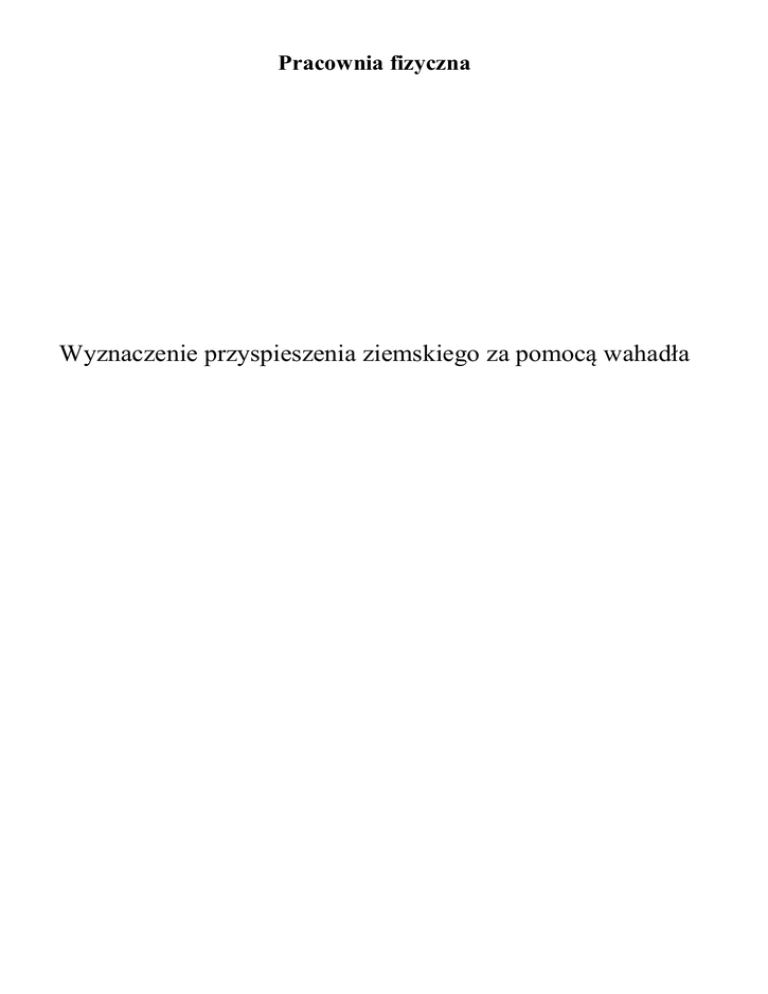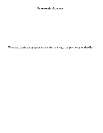 Pracownia fizyczna Wyznaczenie przyspieszenia ziemskiego za pomocą wahadła Teoria: - masa i ciężar ciała, przyspieszenie grawitacyjne, - ruch drgający -okres oraz częstotliwość drgań, - wahadło matematyczne Cel ćwiczenia: - zapoznanie się z metodami wyznaczania przyspieszenia ziemskiego, - pomiar wartości przyspieszenia ziemskiego, - zbadanie zależności okresu drgań wahadła matematycznego od kąta wychylenia oraz długości wahadła, - zapoznanie się z metodą pomiaru krótkich odcinków czasu. Przebieg ćwiczenia: 1. wykonać wahadło (przywiązać nitkę do kulki), 2. pomiar długości wahadła oraz średnicy kulki (kilkakrotnie), 3. wyznaczyć długość wahadła oraz niepewność wyznaczenia długości za pomocą wzorów na średnią arytmetyczną oraz średnie odchylenie standardowe: 1 x śr N N xi i 1 x 1 N x xi N i1 2 x X N 4. odchylić wahadło o około 100 od pionu i puścić swobodnie, wahadło wykonuje drgania, 5. stoperem zmierzyć czas 20 pełnych wahnięć, 6. pomiary powtórzyć pięciokrotnie, wyznaczyć wartość średnią z otrzymanych pomiarów oraz niepewność pomiaru czasu jednego okresu (założyć, że czas reakcji w czasie pomiaru wynosi 0,5 s przy starcie oraz przy wyłączeniu stopera), T t 20 T T 20 7. wyznaczyć wartość przyspieszenia ziemskiego g ze wzoru: 4 2 l g 2 T 8. otrzymaną wartość porównać z oczekiwaną (tablicową), 9. oszacować niepewność pomiarów metoda logarytmiczną: g l T 2 g l T 10.wyznaczyć zależność okresu drgań od wartości kąta wychylenia wahadła od pionu (dla kątów od 10 do 500 w odstępach co 100), 11.wyznaczyć wartość okresu drgań ze wzoru: T 2 12. sporządzić wykres zależności T(). Literatura: Szczeniowski Sz. Fizyka doświadczalna, Dryński T. Ćwiczenia laboratoryjne z fizyki, l g