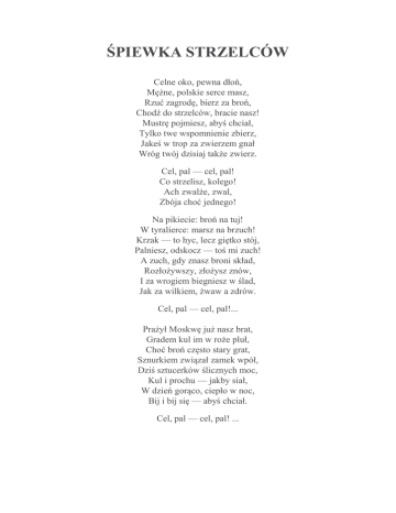 ŚPIEWKA STRZELCÓW Celne oko, pewna dłoń, Mężne, polskie serce masz, Rzuć zagrodę, bierz za broń, Chodź dо strzelców, bracie nasz! Mustrę pojmiesz, abyś chciał, Tylko twe wspomnienie zbierz, Jakeś w trop za zwierzem gnał Wróg twój dzisiaj także zwierz. Cel, pal — cel, pal! Co strzelisz, kolego! Ach zwalże, zwal, Zbója choć jednego! Na pikiecie: broń na tuj! W tyralierce: marsz na brzuch! Krzak — to hyc, lecz giętko stój, Palniesz, odskocz — toś mi zuch! А zuch, gdy znasz broni skład, Rozłożywszy, złożysz znów, I za wrogiem biegniesz w ślad, Jak za wilkiem, żwaw а zdrów. Cel, pal — cel, pal!... Prażył Moskwę już nasz brat, Gradem kul im w roże pluł, Choć broń często stary grat, Sznurkiem związał zamek wpół, Dziś sztucerków ślicznych moc, Kul i prochu — jakby siał, W dzień gorąco, ciepło w nос, Вij i bij się — abyś chciał. Cel, pal — cel, pal! ... Jużto odkąd lejem krew Za wolności święty chrzest, Strzelcy zawsze marszczą brew, Że walk takich nie dość jest. Wróg nasz jakby lis lub wąż, Frant, na kule czuły zwierz, Trza go trapić wciąż, Wtedy kichnie. Strzelcom wierz! Cel, pal — cel, pal! ... I wierz strzelcze, w siebie też, Jak w twe oko, dłoń i słuch, Tak w twe poświęcenie wierz, Ву cię przejął wolny duch. Вуś choć w mieście trwonił czas, Lecz ше piecuch, ani pan, Wnet pokochał pole las. Bój i nasz żołnierski stan. Cel, pal — cel, pal! Co strzelisz, kolego! Ach zwalże, zwal, Zbója choć jednego!