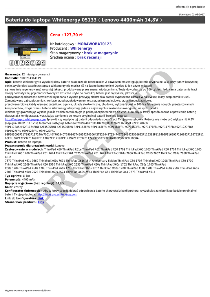 Informacje o produkcie Utworzono 02-03-2017 Bateria do laptopa Whitenergy 05133 ( Lenovo 4400mAh 14,8V ) Cena : 127,70 zł Nr katalogowy : MOB4WOBAT0123 Producent : Whitenergy Stan magazynowy : brak w magazynie Średnia ocena : brak recenzji PR O G -I N FO Gwarancja: 12 miesięcy gwarancji Kod EAN:: 5908214314119 Opis: Baterie Whitenergy to wysokiej klasy baterie zastępcze do notebooków. Z powodzeniem zastępują baterie oryginalne, a są przy tym w korzystnej cenie.Wybierając baterię zastępczą Whitenergy nie musisz iść na żadne kompromisy! Ogniwa Li-lon użyte w baterii są nowe (nie regenerowane) wysokiej jakości, produkowane przez znane, wiodące firmy. Testy dowodzą, że po 100 cyklach ładowania bateria nie traci swojej normatywnej pojemności.Tworzywo sztuczne użyte do produkcji baterii jest najwyższej jakości, o podwyższonej odporności termicznej.Wykonana z wysoką precyzją elektronika baterii wyposażona została w najwyższej klasy bezpiecznik (Fuse). Zamontowano zabezpieczenia chroniące przed przeładowaniem oraz przeciwprzepięciowe, przeciwprzeciążeniowe, przeciwzwarciowe.Każdy element baterii jak: ogniwa, układy elektroniczne, obudowa, wykonany jest w 100% z fabrycznie nowych, przetestowanych komponentów, dzięki czemu baterie Whitenergy utrzymują jeden z najniższych wskaźników awaryjności na rynku!Marka Whitenergy gwarantując wysoką jakość swoich baterii objęła je polisą ubezpieczeniową do 2tys. euro.Aby w łatwy sposób dobrać odpowiednią baterię skorzystaj z konfiguratora, wyszukując zamiennik po kodzie oryginalnej baterii Twojego laptopa: http://finderpro.whitenergy.com Sprawdź czy napięcie tej baterii odpowiada specyfikacji Twojego notebooka. Różnica nie może być większa niż 0,5V (napięcia 10.8V i 11.1V są tożsame).Zastępuje baterie40Y699940Y700140Y7003ASM 92P1168ASM 92P1170ASM 92P1172ASM 92P1174FRU 42T4505FRU 42T4506FRU 92P1163FRU 92P1165FRU 92P1167FRU 92P1169FRU 92P1171FRU 92P1173FRU 92P1227FRU 93P5027FRU 93P5028FRU 93P5029FRU 93P503092P117392P117140Y700140Y700540Y790342T450542T450642T522442T524742T524942T526692P116392P116492P116592P116692P116792P11 68FRU 92P122792P116992P117092P117192P117292P117392P117493P502793P502893P5029CBI1060A Produkt: Bateria do laptopa Przeznaczenie dla urządzeń marki: Lenovo Zastosowanie w modelach: ThinkPad X60 ThinkPad R61e ThinkPad R61 ThinkPad X60 1702 ThinkPad X60 1703 ThinkPad X60 1704 ThinkPad X60 1705 ThinkPad X60 1706 ThinkPad X61 7674 ThinkPad X61 7675 ThinkPad X61 7679 ThinkPad X61s 7666 ThinkPad X61S 7667 ThinkPad X61s 7668 ThinkPad X61s 7670 ThinkPad X61s 7669 ThinkPad X61s 7671 ThinkPad X61s 15th Anniversary Edition ThinkPad X60 1707 ThinkPad X60 1708 ThinkPad X60 1709 ThinkPad X60 2509 ThinkPad X60 2510 ThinkPad X60 2533 ThinkPad X60s ThinkPad X60s 1702 ThinkPad X60s 1703 ThinkPad X60s 1704 ThinkPad X60s 1705 ThinkPad X60s 1706 ThinkPad X60s 1707 ThinkPad X60s 1708 ThinkPad X60s 1709 ThinkPad X60s 2507 ThinkPad X60s 2508 ThinkPad X60s 2522 ThinkPad X60s 2524 ThinkPad X60s 2533 ThinkPad X61 ThinkPad X61 7673 ThinkPad X61s Typ ogniwa: Li-ion Pojemność: 4400 mAh Napięcie wyjściowe (bez regulacji): 14,8 V Kolor: czarny Konfigurator (informacje): Aby w łatwy sposób dobrać odpowiednią baterię skorzystaj z konfiguratora, wyszukując zamiennik po kodzie oryginalnej baterii Twojego laptopa: http://finderpro.whitenergy.com Link do konfiguratora: Link Strona www produktu: Link Wygenerowano w programie www.oscGold.com