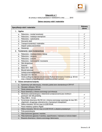 Załącznik nr 1 do umowy o roboty budowlane nr 00/00/2010 z dnia ……… 2010 Zakres rzeczowy robót i materiałów Specyfikacja robót i materiałów Wybrany zakres 1. Ogólne a. b. c. d. e. f. g. Robocizna – montaż konstrukcji Robocizna – instalacje wewnętrzne wewnę Robocizna – wykończenia ńczenia Kierownik robót Transport konstrukcji i materiałów Dojazd i pobyt pracowników Gwarancje 2. Fundamenty i płyta fundamentowa a. b. c. d. e. f. g. h. i. j. k. Robocizna – niwelacja terenu i wykop Robocizna – zbrojenie Robocizna – szalunki Robocizna – betonowanie i murowanie Stal zbrojeniowa Szalunki Beton B15 – B20 Bloczki betonowe Izolacja przeciwwilgociowa Styropian min.100 mm Deska podłogowa dębowa ębowa lub jesionowa Rustical lakierowana 3 krotnie gr. 28 mm wraz z listwami przypodłogowymi w pomieszczeniach suchych 3. Ś Ściana zewnętrzna ętrzna budynku a. b. c. d. e. f. g. h. i. j. k. l. m. n. Systemowy tynk dekoracyjny, mineralny paleta barw standardowych DRYVIT Styropian ryflowany 100 mm Deska elewacyjna sosnowa Ruszt drewniany z drewna sosnowego pod elewacje Membrana wiatroizolacyjna o właściwości przepuszczania pary wodnej w granicach 120-160 160 g/m2/24g Płyta OSB 3 - 12 mm Konstrukcja drewnianaa 40x150 40 mm z drewna sosnowego suszonego do max.18% wilgotności, ści, struganego czterostronnie z fazowanymi krawę krawędziami Wełna mineralna 150 50 mm m max.U=0,039 W/mK Ruszt metalowy systemu Rigistil Wełna mineralna 100 00 mm max.U=0,039 W/mK w układzie przestawnym Folia paraizolacyjna Płyta kartonowo-gipsowa gipsowa I warstwa Płyta kartonowo-gipsowa gipsowa II warstwa, szpachlowana i malowana w kolorze białym Boazeria drewniana z drewna sosnowego lakierowana Strona 1 z 3 4. Ś Ściana wewnętrzna ętrzna budynku a. b. c. d. Płyta kartonowo-gipsowa gipsowa I warstwa Płyta kartonowo-gipsowa gipsowa II warstwa, szpachlowana i malowana w kolorze białym Boazeria drewniana z drewna sosnowego lakierowana Konstrukcja drewniana 40x100 mm z drewna sosnowego suszonego do max.18% wilgotności, ści, struganego czterostronnie z fazowanymi krawę krawędziami e. Wełna mineralna 100 mm max.U=0,039 W/mK f. Płyta kartonowo-gipsowa gipsowa I warstwa g. Płyta kartonowo-gipsowa gipsowa II warstwa, szpachlowana i malowana w kolorze białym h. Boazeria drewniana z drewna sosnowego lakierowana 5. Strop w budynku z poddaszem użytkowym uż a. Deska podłogowa sosnowa Rustical lakierowana 3 krotnie gr. 28 mm wraz z listwami przypodłogowymi b. Płyta OSB 22 mm c. Konstrukcja drewnianaa stropu z belek 40x200-240 40 mm z drewna sosnowego suszonego do max.18% wilgotności, wilgotnośści, struganego czterostronnie z fazowanymi krawędziami d. Wełna mineralna 100 00 mm max.U=0,039 W/mK e. Ruszt metalowy systemu Rigistil lub drewniany f. Folia paraizolacyjna g. Płyta kartonowo-gipsowa gipsowa I warstwa h. Płyta kartonowo-gipsowa gipsowa II warstwa, szpachlowana i malowana w kolorze białym i. Boazeria drewniana z drewna sosnowego lakierowana 6. Dach a. Dachówka bitumiczna Owens Corning Duration® AR kolory podstawowe b. Blachodachówka z posypka mineralną AFI Roofing Gerard Classic lub Corona DOPŁATA 30,00 zł /m m2 dachu c. Płyta OSB 22 mm d. Łaty drewniane e. Membrana dachowa wysoce para przepuszczalna f. Konstrukcja drewnianaa dachu 40x150-200 mm z drewna sosnowego suszonego do max.18% wilgotności, śści, struganego czterostronnie z fazowanymi krawę krawędziami ędziami g. Wełna mineralna 1500 mm max.U=0,039 W/mK h. Ruszt metalowy systemu Rigistil lub drewniany i. Folia paraizolacyjna j. Płyta kartonowo-gipsowa gipsowa I warstwa k. Płyta kartonowo-gipsowa gipsowa II warstwa, szpachlowana i malowana w kolorze białym l. Boazeria drewniana z drewna sosnowego lakierowana m. Kompletny system orynnowania PCV w kolorze podstawowym n. Podbitka drewniana impregnowana o. Obróbki blacharskie Strona 2 z 3 7. Stolarka a. Okna z drewna sosnowego klejonego z okuciami ROTO, szyba zespolona U=1,1 1,1 W/mK w kolorze lazur z palety podstawowej SIKKENS b. Obróbki drewniane okien c. Parapety zewnętrzne ętrzne drewniane, metalowe lub PCV d. Parapety wewnętrzne ętrzne drewniane lub PCV e. Drzwi zewnętrzne ętrzne z drewna sosnowego z okuciami, ocieplone w kolorze lazur z palety podstawowej SIKKENS model Majstersztyk f. Obróbki drewniane drzwi zewnętrznych zewnę g. Drzwi wewnętrzne ętrzne z drewna sosnowego z okuciami, w kolorze lazur z palety podstawowej SIKKENS model Majstersztyk h. Obróbki drewniane drzwi wewnętrznych wewnę i. Schody ażurowe żurowe z drewna jesionowego lub dę dębowego w kolorze lazur z palety podstawowej SIKKENS model Majstersztyk 8. Instalacje a. Instalacja kominowa systemowa (komin dymowy wraz z kanałami wentylacyjnymi zgodnie z projektem) b. Instalacja acja centralnej wody użytkowej, uż system zgrzewanych rur typu PE (bez przyłącza zewnętrznego) ętrznego) c. Instalacja centralnego ogrzewania, ogrzewania system rozdzielaczowy oparty o rury typu PEX (bez pieca CO) d. Grzejniki PURMO w kolorze białym zgodnie z zapotrzebowaniem energetycznym e. Instalacja elektryczna wraz z rozdzielnią elektrycznąą i osprzętem ętem typu BERKER Kwadrat lub odpowiednim, ok. 1 punkt na 2,5m2 podłogi (bez przyłącza zewnętrznego, ętrznego, oprawy oś oświetleniowe dostarcza inwestor) f. Instalacja kanalizacyjna z rur typu PE g. Instalacja przewodów pod p system alarmowy h. Instalacja antenowa tele lewizji naziemnej 9. Prace wykończeniowe a. Malowanie trzykrotne ścian farbą emulsyjnąą w kolorze białym lub farbąą w kolorze, dostarczonąą przez inwestora b. Montażż terakoty, gresu i glazury, materiały dostarcza Inwestor c. Montażż armatury sanitarnej, materiały dostarcza Inwestor 10. INNE ustalenia a. ………………………………………………………………………………………………. ………………………………………………………………………………………………. …