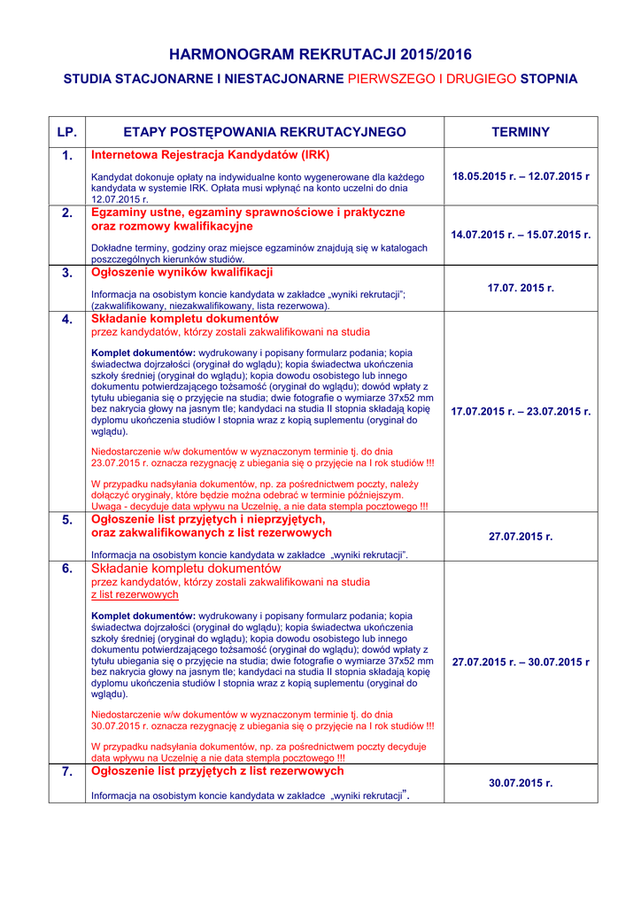 HARMONOGRAM REKRUTACJI 2015/2016 STUDIA STACJONARNE I NIESTACJONARNE PIERWSZEGO I DRUGIEGO STOPNIA LP. 1. ETAPY POSTĘPOWANIA REKRUTACYJNEGO Internetowa Rejestracja Kandydatów (IRK) Kandydat dokonuje opłaty na indywidualne konto wygenerowane dla kaŜdego kandydata w systemie IRK. Opłata musi wpłynąć na konto uczelni do dnia 12.07.2015 r. 2. TERMINY Egzaminy ustne, egzaminy sprawnościowe i praktyczne oraz rozmowy kwalifikacyjne 18.05.2015 r. – 12.07.2015 r 14.07.2015 r. – 15.07.2015 r. Dokładne terminy, godziny oraz miejsce egzaminów znajdują się w katalogach poszczególnych kierunków studiów. 3. Ogłoszenie wyników kwalifikacji Informacja na osobistym koncie kandydata w zakładce „wyniki rekrutacji”; (zakwalifikowany, niezakwalifikowany, lista rezerwowa). 4. 17.07. 2015 r. Składanie kompletu dokumentów przez kandydatów, którzy zostali zakwalifikowani na studia Komplet dokumentów: wydrukowany i popisany formularz podania; kopia świadectwa dojrzałości (oryginał do wglądu); kopia świadectwa ukończenia szkoły średniej (oryginał do wglądu); kopia dowodu osobistego lub innego dokumentu potwierdzającego toŜsamość (oryginał do wglądu); dowód wpłaty z tytułu ubiegania się o przyjęcie na studia; dwie fotografie o wymiarze 37x52 mm bez nakrycia głowy na jasnym tle; kandydaci na studia II stopnia składają kopię dyplomu ukończenia studiów I stopnia wraz z kopią suplementu (oryginał do wglądu). 17.07.2015 r. – 23.07.2015 r. Niedostarczenie w/w dokumentów w wyznaczonym terminie tj. do dnia 23.07.2015 r. oznacza rezygnację z ubiegania się o przyjęcie na I rok studiów !!! W przypadku nadsyłania dokumentów, np. za pośrednictwem poczty, naleŜy dołączyć oryginały, które będzie moŜna odebrać w terminie późniejszym. Uwaga - decyduje data wpływu na Uczelnię, a nie data stempla pocztowego !!! 5. Ogłoszenie list przyjętych i nieprzyjętych, oraz zakwalifikowanych z list rezerwowych 27.07.2015 r. Informacja na osobistym koncie kandydata w zakładce „wyniki rekrutacji”. 6. Składanie kompletu dokumentów przez kandydatów, którzy zostali zakwalifikowani na studia z list rezerwowych Komplet dokumentów: wydrukowany i popisany formularz podania; kopia świadectwa dojrzałości (oryginał do wglądu); kopia świadectwa ukończenia szkoły średniej (oryginał do wglądu); kopia dowodu osobistego lub innego dokumentu potwierdzającego toŜsamość (oryginał do wglądu); dowód wpłaty z tytułu ubiegania się o przyjęcie na studia; dwie fotografie o wymiarze 37x52 mm bez nakrycia głowy na jasnym tle; kandydaci na studia II stopnia składają kopię dyplomu ukończenia studiów I stopnia wraz z kopią suplementu (oryginał do wglądu). 27.07.2015 r. – 30.07.2015 r Niedostarczenie w/w dokumentów w wyznaczonym terminie tj. do dnia 30.07.2015 r. oznacza rezygnację z ubiegania się o przyjęcie na I rok studiów !!! W przypadku nadsyłania dokumentów, np. za pośrednictwem poczty decyduje data wpływu na Uczelnię a nie data stempla pocztowego !!! 7. Ogłoszenie list przyjętych z list rezerwowych 30.07.2015 r. Informacja na osobistym koncie kandydata w zakładce „wyniki rekrutacji”. HARMONOGRAM REKRUTACJI 2015/2016 STUDIA STACJONARNE I NIESTACJONARNE TRZECIEGO STOPNIA LP. 1. ETAPY POSTĘPOWANIA REKRUTACYJNEGO Internetowa Rejestracja Kandydatów (IRK) Składanie dokumentów Kandydat składa wymagane dokumenty tj: wydrukowany i popisany formularz podania; Ŝyciorys, kopię dyplomu ukończenia jednolitych studiów magisterskich lub studiów II stopnia (oryginał do wglądu); rekomendacja (z bieŜącego roku) samodzielnego pracownika naukowego, kopię dowodu osobistego lub innego dokumentu potwierdzającego toŜsamość (oryginał do wglądu); dwie fotografie: jedną o wymiarze 45x65 mm, drugą o wymiarze 37x52 mm bez nakrycia głowy na jasnym tle. 2. TERMINY 18.05.2015 r. – 12.07.2015 r Rozmowa kwalifikacyjna Wydział Matematyczno-Przyrodniczy 15.07.2015 r. 00 godz. 10 Wydział Filologiczno-Historyczny 15.07.2015 r. 00 godz. 10 3. Ogłoszenie listy przyjętych i nieprzyjętych 17.07. 2015 r.