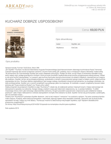 Dobra28 sp zoo. księgarnia wysyłkowa arkady.info ul. Dobra 28, Warszawa +48 22 444 86 97 KUCHARZ DOBRZE USPOSOBIONY Cena: 69,00 PLN Opis słownikowy Autor Szyttler Jan Wydawca Graf_ika Opis produktu Oprawa twarda, Format 13x22,5cm, Stron 299 Jan Szyttler ? Kucharz na dworze Stanisława Augusta Poniatowskiego (pod kierownictwem sławnego kuchmistrza Paula Tremona). Czerpał inspiracje dla swoich przepisów zarówno z kuchni francuskiej, jak i polskiej, oraz w mniejszym stopniu litewskiej i białoruskiej. "W porównaniu do Czernieckiego Szyttler jest wręcz diabelsko precyzyjny. Podaje nie dość, że typ mięsa, to konkretny kawałek tuszy, który należy użyć, podaje gramaturę w funtach i krok po kroku prowadzi użytkownika przez proces przygotowania danej potrawy. Widać tu też echo kuchni staropolskiej ? w czasach, gdy kuchnia francuska zaczyna dominować na stołach miejskich, niewiele jest już miejsca dla szafranu. Szyttler nie boi się tej drogiej przyprawy, aczkolwiek w ramach nowoczesności gotuje mięso w białym winie, czego kuchnia staropolska nie zna. ?Kucharz dobrze usposobiony? jest swego rodzaju manifestem otwarcia się kulinariów na zwykłego człowieka, nie tylko profesjonalistę. Szyttler już w swoich projektach zup pokazuje, jakie ma inspiracje. W rozdziale o zupach znajdziemy bowiem takie potrawy jak ?Zupa wiosenna Ruska? czy ?Zupa ucha ruska?. Gdyby przyjrzeć się przepisom Szyttlera w jego ?Kucharzu??, okaże się, że większość potraw mięsnych (czyli z mięsa czerwonego lub dziczyzny) to sposoby na wołowinę. Swego rodzaju znakiem czasu jest obecność wieprzowiny, np. w postaci kotletów. To efekt masowego chowu świń, jako tańszego odpowiednika wołowiny. Drugim powodem popularności wieprzowiny jest osłabienie tradycji postnych ? jako mięso niekoszerne w okresie staropolskim nie była mile widziana na stole. Szyttler nie boi się już korzystać z potencjału, jaki ma świńskie mięso. Osobny tom ?Kucharza?? poświęca Szyttler deserom. Jest to też miejsce ? wreszcie ? na rozdział o spiżarni. Tej autor poświęca bardzo mało miejsca. Przepisy, które dotyczą kompotów i marmolad, zajmują raptem dwa niewielkie rozdziały. Otoczone zaś są dużą liczbą sposobów na lody, ciasta czy inne desery. Tłumaczyć można to obecnością innej książki Szyttlera, czyli ?Spiżarni dostatecznie i przezornie urządzonej(?)?. Ze strony: http://kuchniacyniczna.pl/2014/09/10/sposob-na-romantyka-o-kuchni-jana-szyttlera/ Rok wydania 2015 Plik wygenerowano: 02-03-2017 Powered by TCPDF (www.tcpdf.org) Oprogramowanie sklepu: AptusShop