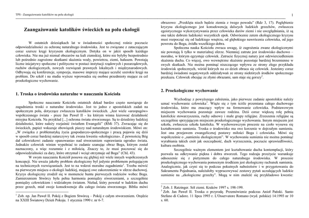TPS - Zaangażowanie katolików na polu ekologii 1 ----------------------------------------------------------------------------------------------------------------------------------------------------------------------------------------------------------------------------obrazowo: „Przeklęta niech będzie ziemia z twego powodu” (Rdz 3, 17). Pogłębienie kryzysu ekologicznego jest konsekwencją dalszych ludzkich grzechów, zwłaszcza Zaangażowanie katolików świeckich na polu ekologii egoistycznego wykorzystywania przez człowieka darów ziemi i nie uwzględniania, iż są one także dobrem ludzkości wszystkich epok. Odwrócenie zatem ekologicznego kryzysu musi rozpocząć się od ludzkiego wnętrza, od głębokiego nawrócenia człowieka, od jego W ostatnich dziesiątkach lat w świadomości społecznej rośnie poczucie powrotu do Boga, źródła wszelkiego dobra. odpowiedzialności za ochronę naturalnego środowiska. Jest to związane z zataczającym Społeczna nauka Kościoła zwraca uwagę, iż zagrożenia zwane ekologicznymi coraz szersze kręgi kryzysem ekologicznym. Dotyka on w jakiś sposób każdego nie powstają li tylko w materialnej sferze. Niemniej zatrute jest środowisko duchowo – człowieka. Nie ma już niemal obszarów na kuli ziemskiej, które nie byłyby bezpośrednio moralne, w którym egzystuje człowiek. Zatrucie fizycznej natury jest odzwierciedleniem lub pośrednio zagrożone skutkami skażenia wody, powietrza, ziemi, hałasem. Powstają skażenia ducha. Co więcej, owo wewnętrzne skażenie pozostaje bardziej brzemienne w liczne inicjatywy społeczne i polityczne w postaci instytucji rządowych i pozarządowych, swych skutkach. Nie można pominąć niszczącego wpływu ze strony złego przykładu ruchów ekologicznych, nowych rozwiązań prawnych lokalnych i międzynarodowych. środowisk społecznych, wśród których na co dzień obraca się człowiek. Jesteśmy coraz Odbywają się konferencje, sympozja, masowe imprezy mające uczulić szerokie kręgi na bardziej świadomi negatywnych oddziaływań ze strony niektórych środków społecznego problem. Do szkół i na studia wyższe wprowadza się osobne przedmioty mające za cel przekazu. Człowiek obcując ze złymi obrazami, sam staje się gorszy2. proekologiczne wychowanie. 1. Troska o środowisko naturalne w nauczaniu Kościoła Społeczne nauczanie Kościoła ostatnich dekad bardzo często nawiązuje do zagadnienia troski o naturalne środowisko. Jest to jedno z apostolskich zadań na społecznym polu, dotyczące zwłaszcza katolików świeckich. „Jest wiele «areopagów» współczesnego świata - pisze Jan Paweł II - ku którym winna kierować działalność misyjna Kościoła. Na przykład [...] ochrona świata stworzonego. Są to dziedziny ludzkiej działalności, które należy rozjaśnić światłem Ewangelii” (RMi 37). Zwracając się do świeckich, papież wskazuje obowiązek pieczy nad naturalnym środowiskiem. Mówi on: „W związku z problematyką życia gospodarczo-społecznego i pracą pojawia się dziś w sposób coraz bardziej natarczywy tak zwana kwestia «ekologiczna». Z pewnością Bóg dał człowiekowi zadanie «panowania» nad stworzeniem «uprawiania ogrodu» świata. Jednakże człowiek winien wypełniać to zadanie szanując obraz Boga, którym został naznaczony, a więc rozumnie i z miłością. Znaczy to, że musi poczuwać się do odpowiedzialności za dary, które otrzymał i wciąż otrzymuje od Boga” (ChL 43). W swym nauczaniu Kościół posuwa się głębiej niż wiele innych współczesnych koncepcji. Nie uważa jakoby problem ekologiczny był jedynie problemem polegającym na technicznych rozwiązaniach. Jest to na wskroś moralne zagadnienie1. Trzeba mówić na pierwszym miejscu o ekologii ludzkiej, mającej swe zakorzenienie w sferze duchowej. Kryzys ekologiczny zrodził się w momencie buntu pierwszych rodziców wobec Boga. Zamierzeniem Stwórcy była pełna harmonia pomiędzy stworzeniami, a szczególnie pomiędzy człowiekiem i widzialnym światem. Nieład, który powstał w ludzkim duchu przez grzech, miał swoje konsekwencje dla całego świata stworzonego. Biblia mówi 2. Proekologiczne wychowanie Wychodząc z powyższego założenia, jako pierwsze zadanie apostolskie należy uznać wychowanie człowieka3. Wiąże się z tym ściśle przemiana całego duchowego środowiska, które ma znaczący wpływ na formowanie człowieka. Podstawowym miejscem wychowania pozostaje zawsze rodzina. Dziś coraz większą rolę pełnią katolickie stowarzyszenia, ruchy odnowy i małe grupy religijne. Zrzeszenia religijne są szczególnie sprzyjającym miejscem proekologicznego wychowania. Innym miejscem jest szkoła, zwłaszcza szkoła katolicka. W wychowawczym procesie na czoło wysuwa się kształtowanie sumienia. Troska o środowisko ma swe korzenie w dojrzałym sumieniu. Jest ona przejawem ewangelicznej postawy miłości Boga i człowieka. Mówi się współcześnie o „sumieniu ekologicznym”. W wychowaniu sumienia nie można pominąć wyrabiania takich cnót jak oszczędność, duch wyrzeczenia, poczucie sprawiedliwości, kultura osobista. Szczególnie ważnym elementem jest kształtowanie ducha kontemplacji, który pozwala na odkrywanie piękna i dobra stworzeń. Tego rodzaju przeżycie warunkuje odnoszenie się z pietyzmem do całego naturalnego środowiska. W procesie proekologicznego wychowania pomocnym środkiem jest ekologiczny rachunek sumienia. Analogicznie, jak czyni się to podczas pokutnych nabożeństw i w przygotowaniu do Sakramentu Pojednania, należałoby wypracowywać zestawy pytań uczulających ludzkie sumienie na „ekologiczne grzechy”. Mogą w nim znaleźć się przykładowo kwestie: 2 Zob. J. Ratzinger. Sól ziemi. Kraków 1997 s. 198-199. Zob. Jan Paweł II. Troska o przyrodę. Przemówienie podczas Anioł Pański. Santo Stefano di Cadore. 11 lipca 1993 r. L'Osservatore Romano (wyd. polskie) 14:1993 nr 10 s. 60. 3 1 Zob. np. Jan Pa