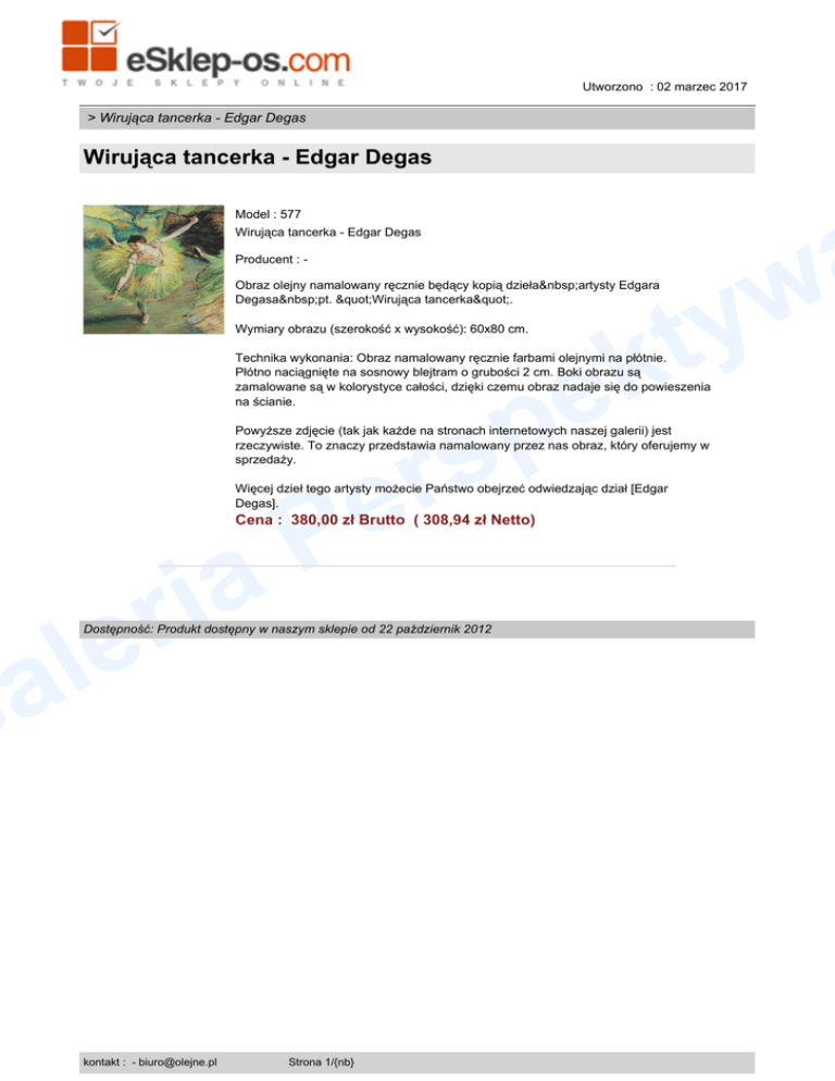 Utworzono : 02 marzec 2017 > Wirująca tancerka - Edgar Degas Wirująca tancerka - Edgar Degas Model : 577 Wirująca tancerka - Edgar Degas w y t Producent : Obraz olejny namalowany ręcznie będący kopią dzieła artysty Edgara Degasa pt. "Wirująca tancerka". k e Wymiary obrazu (szerokość x wysokość): 60x80 cm. Technika wykonania: Obraz namalowany ręcznie farbami olejnymi na płótnie. Płótno naciągnięte na sosnowy blejtram o grubości 2 cm. Boki obrazu są zamalowane są w kolorystyce całości, dzięki czemu obraz nadaje się do powieszenia na ścianie. p rs Powyższe zdjęcie (tak jak każde na stronach internetowych naszej galerii) jest rzeczywiste. To znaczy przedstawia namalowany przez nas obraz, który oferujemy w sprzedaży. e P a Więcej dzieł tego artysty możecie Państwo obejrzeć odwiedzając dział [Edgar Degas]. Cena : 380,00 zł Brutto ( 308,94 zł Netto) i r e l a G Dostępność: Produkt dostępny w naszym sklepie od 22 październik 2012 kontakt : - [email protected] Strona 1/{nb}