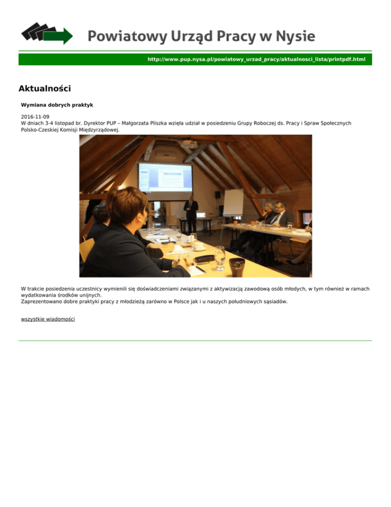 http://www.pup.nysa.pl/powiatowy_urzad_pracy/aktualnosci_lista/printpdf.html Aktualności Wymiana dobrych praktyk 2016-11-09 W dniach 3-4 listopad br. Dyrektor PUP – Małgorzata Pliszka wzięła udział w posiedzeniu Grupy Roboczej ds. Pracy i Spraw Społecznych Polsko-Czeskiej Komisji Międzyrządowej. W trakcie posiedzenia uczestnicy wymienili się doświadczeniami związanymi z aktywizacją zawodową osób młodych, w tym również w ramach wydatkowania środków unijnych. Zaprezentowano dobre praktyki pracy z młodzieżą zarówno w Polsce jak i u naszych południowych sąsiadów. wszystkie wiadomości