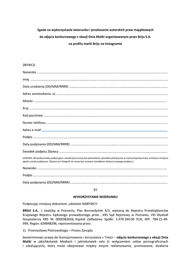 Zgoda na wykorzystanie wizerunku i przekazanie autorskich praw majątkowych do zdjęcia konkursowego z okazji Dnia Matki organizowanym przez Briju S.A. na profilu marki Briju na Instagramie ZBYWCA Nazwisko …………………………………………………………………………………………………………………………………………….. Imię ………………………………………………………………………………………………………………..………………………………….. Data urodzenia (DD/MM/RRRR) ……………………………………………………………………………………..………………….. Adres zamieszkania: ul. …………………………………………………………………………………..…………………………………… Miasto ………………………………………………………………………………………………………………………………………………… Kraj ………………………………………………………………………………………………………………………………………..……………. Kod pocztowy ………………………………………………………………………………………………………………………..……………. Numer telefonu ……………………………………………………………………………………………………………………….…………. Adres e-mail ………………………………………………………………………………………………………………….……………………. Podpis …………………………………………………………………………………………………………….…………………………………… Data podpisania (DD/MM/RRRR) ………………………………………………………………………………………………………… Świadek podpisu Zbywcy ……………………………….…………………………………………………………………………………… (UWAGA: Wszystkie osoby podpisujące i świadczące muszą być pełnoletnie i posiadać pełnię praw w myśl przepisów kraju, w którym niniejsza zgoda została podpisana. Zbywca ani fotograf nie może być zarazem świadkiem złożenia swojego podpisu.) Nazwisko ……………………………………………………………………………………………………………………………………………. Podpis …………………………………………………………………………………………………………………………………………………. Data podpisania (DD/MM/RRRR) ………………………………………………………………………………………………………… §1 WYKORZYSTANIE WIZERUNKU Podpisując niniejszy dokument, udzielam NABYWCY: BRIJU S.A., z siedzibą w Poznaniu, Plac Bernardyński 4/3, wpisaną do Rejestru Przedsiębiorców Krajowego Rejestru Sądowego prowadzonego przez , KRS Sąd Rejonowy w Poznaniu, VIII Wydział Gospodarczy KRS Nr 0000382656, Kapitał Zakładowy Spółki: 5 978 260.00 PLN, NIP: 784-21-49999, Regon: 639848296, reprezentowana przez: 1). Przemysława Piotrowskiego – Prezes Zarządu bezterminowo prawa do licencjonowania i korzystania z Treści – zdjęcia konkursowego z okazji Dnia Matki w jakichkolwiek Mediach i jakimkolwiek celu (z wyłączeniem celów pornograficznych i szkalujących), który może obejmować między innymi reklamowanie, promowanie, działania marketingowe i opakowanie jakiegokolwiek produktu lub usług. Wyrażam zgodę na łączenie Treści z innymi obrazami, tekstem, grafiką, filmami, dźwiękiem, materiałami audiowizualnymi oraz na kadrowanie, zmianę i modyfikację Treści. Potwierdzam i wyrażam zgodę na publikację mojej tożsamości etnicznej określonej poniżej, jak również na to, że inna tożsamość etniczna może zostać przypisana do mojej osoby przez Fotografa /Filmowca i/lub następców Prawnych dla celów opisowych. Niniejszym potwierdzam, ze nie mam jakichkolwiek praw do Treści i uznaję, że wszelkie prawa do Treści znajdują się w posiadaniu firmy Briju S.A. Oświadczam, że nie mam praw do wynagrodzenia i że nie będę wysuwać jakichkolwiek dalszych roszczeń w stosunku do firmy Briju S.A. lub beneficjentów. Oświadczam, iż osoby niepełnoletnie będące uczestnikami utworu (występujące na zdjęciu) reprezentuję jako opiekun prawny i tym samym przekazuję wszelkie prawa autorskie oraz prawa do wizerunku tych osób. Oświadczam, że niniejsza zgoda jest wiążąca również dla moich spadkobierców i następców prawnych. Oświadczam, że niniejsza zgoda jest nieodwołalna, obowiązująca na całym świecie i nieograniczona w czasie oraz, że podlega przepisom prawa polskiego. Uzgodniono, że moje dane osobowe nie będą udostępnione publicznie, natomiast będą mogły być wykorzystane wyłącznie bezpośrednio w odniesieniu do licencjonowania Materiałów, gdy będzie to potrzebne (np. w celu dochodzenia roszczeń, ochrony praw bądź powiadamiania organizacji zbiorowego zarządzania), i mogą być przechowywane tak długo, jak długo wymagać będzie tego realizacja danego celu, co obejmuje udostępnianie oraz przesyłanie ich do krajów o innym prawodawstwie związanym z ochroną danych i prywatności, gdzie mogą być przechowywane, przeglądane i wykorzystywane. Oświadczam i gwarantuję, że mam ukończone 18 lat i posiadam pełną zdolność prawną potrzebną do udzielenia niniejszej zgody. PRAWA AUTORSKIE 1. Zbywca oświadcza, że jest wyłącznym właścicielem majątkowych praw autorskich do Projektu opisanego §1 oraz oświadcza, że prawa te wolne są od praw osób trzecich. 2. Nabywca nabywa autorskie prawa majątkowe do Projektu opisanego §1: a. Zbywca przeno