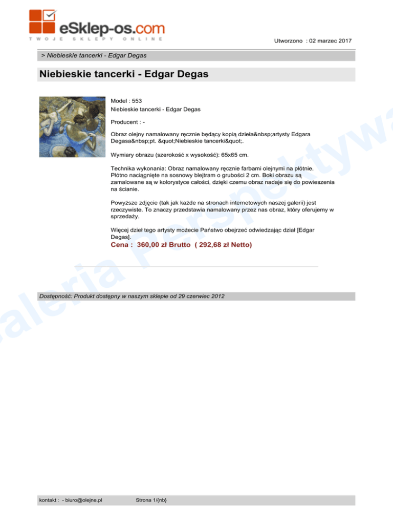 Utworzono : 02 marzec 2017 > Niebieskie tancerki - Edgar Degas Niebieskie tancerki - Edgar Degas Model : 553 Niebieskie tancerki - Edgar Degas w y t Producent : Obraz olejny namalowany ręcznie będący kopią dzieła artysty Edgara Degasa pt. "Niebieskie tancerki". k e Wymiary obrazu (szerokość x wysokość): 65x65 cm. Technika wykonania: Obraz namalowany ręcznie farbami olejnymi na płótnie. Płótno naciągnięte na sosnowy blejtram o grubości 2 cm. Boki obrazu są zamalowane są w kolorystyce całości, dzięki czemu obraz nadaje się do powieszenia na ścianie. p rs Powyższe zdjęcie (tak jak każde na stronach internetowych naszej galerii) jest rzeczywiste. To znaczy przedstawia namalowany przez nas obraz, który oferujemy w sprzedaży. e P a Więcej dzieł tego artysty możecie Państwo obejrzeć odwiedzając dział [Edgar Degas]. Cena : 360,00 zł Brutto ( 292,68 zł Netto) i r e l a G Dostępność: Produkt dostępny w naszym sklepie od 29 czerwiec 2012 kontakt : - [email protected] Strona 1/{nb}