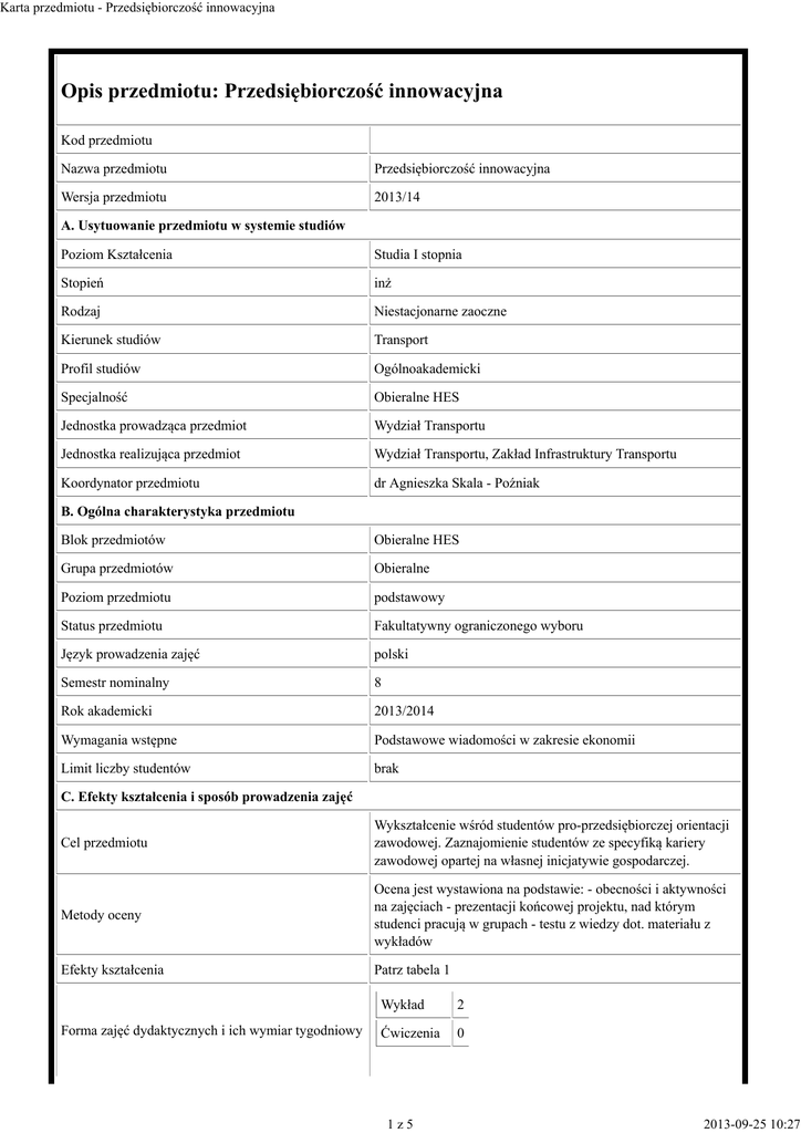 Karta przedmiotu - Przedsiębiorczość innowacyjna Opis przedmiotu: Przedsiębiorczość innowacyjna Kod przedmiotu Nazwa przedmiotu Przedsiębiorczość innowacyjna Wersja przedmiotu 2013/14 A. Usytuowanie przedmiotu w systemie studiów Poziom Kształcenia Studia I stopnia Stopień inż Rodzaj Niestacjonarne zaoczne Kierunek studiów Transport Profil studiów Ogólnoakademicki Specjalność Obieralne HES Jednostka prowadząca przedmiot Wydział Transportu Jednostka realizująca przedmiot Wydział Transportu, Zakład Infrastruktury Transportu Koordynator przedmiotu dr Agnieszka Skala - Poźniak B. Ogólna charakterystyka przedmiotu Blok przedmiotów Obieralne HES Grupa przedmiotów Obieralne Poziom przedmiotu podstawowy Status przedmiotu Fakultatywny ograniczonego wyboru Język prowadzenia zajęć polski Semestr nominalny 8 Rok akademicki 2013/2014 Wymagania wstępne Podstawowe wiadomości w zakresie ekonomii Limit liczby studentów brak C. Efekty kształcenia i sposób prowadzenia zajęć Cel przedmiotu Wykształcenie wśród studentów pro-przedsiębiorczej orientacji zawodowej. Zaznajomienie studentów ze specyfiką kariery zawodowej opartej na własnej inicjatywie gospodarczej. Metody oceny Ocena jest wystawiona na podstawie: - obecności i aktywności na zajęciach - prezentacji końcowej projektu, nad którym studenci pracują w grupach - testu z wiedzy dot. materiału z wykładów Efekty kształcenia Patrz tabela 1 Forma zajęć dydaktycznych i ich wymiar tygodniowy Wykład 2 Ćwiczenia 0 1z5 2013-09-25 10:27 Karta przedmiotu - Przedsiębiorczość innowacyjna Laboratoria 0 Projekty Treści kształcenia 0 Przedsiębiorczość na świecie na przełomie XX i XXI w. Zmiany w sferze technologii, przełomowe rozwiązania organizacyjne, zmiany preferencji konsumentów, skutki globalizacji i konkurencji międzynarodowej. Przedsiębiorczość w Polsce na tle międzynarodowym. Własny biznes jako opcja kariery zawodowej po studiach . Przedsiębiorczy styl zarządzania. Cechy operacyjne skutecznych liderów nowego biznesu. Sytuacja młodych kandydatów na przedsiębiorców. Doskonalenie podstawowych umiejętności w prowadzeniu biznesu przed jego uruchomieniem. Pomysł a koncepcja biznesu. Jak zidentyfikować dobry pomysł na biznes. Typowe źródła inspiracji. Inspiracja wewnętrzna i zewnętrzna. Metody zwiększania efektywności poszukiwań. Poszukiwanie pomysłów przez ludzi młodych i niedoświadczonych. Fazy realizacji przedsięwzięcia biznesowego. Wstępna koncepcja biznesu (WKB) - zawartość i metody opracowania. Biznesplan definicja i podstawowe nieporozumienia związane z tym pojęciem. Finansowanie nowego biznesu - generalne tendencje. Taktyka "stania na własnych nogach". Środki własne. Dostosowanie modelu funkcjonowania biznesu w fazie rozruchu przy ograniczonych środkach własnych. Praktyczne metody maksymalizacji wpływów i minimalizacji wydatków. Kredyt bankowy. Banki a nowy biznes. Zdolność kredytowa a wiarygodność finansowa. Preferowany przez banki profil kredytobiorcy. Wybór banku do współpracy. Wielkość i w warunki dostępnego kredytu dla rozpoczynających działalność. Fundusze pożyczkowe. Fundusze poręczeń kredytowych. Środki na rozwój z funduszy strukturalnych UE. Venture capital. Aniołowie biznesu. "Składane finansowania" nowego biznesu. Forma prawna a koncepca biznesu. Jakie formy mamy do dyspozycji. Analiza porównawcza - kryteria. Samodzielnie czy ze wspólnikami? Oddzielenie sfery życia osobistego od sfery biznesu. Wymagany poziom kapitału założycielskiego. Czas i koszty związane z rejestracją. Elastyczność operacyjna. Implikacje podatkowe. Potencjał rozwojowy. Wybór formy prawnej w przypadku dynamicznych firm. Kluczowe decyzje dotyczące systemu finansowo-księgowego. Księgowość podstawowe mity i nieporozumienia. Księgowość pełna czy uproszczona. Komu powierzyć prowadzenie ksiąg? Audyt sprawozdań finansowych firmy. Kontrola bieżącej sytuacji finansowej firmy. Specyfika problemów kadrowych na starcie. Lider zespołu czy zespół przywódczy? Aktualne tendencje. Proces formowania się zespołów założycielskich. Zasady doboru- doświadczenia praktyczne. Kluczowe działania związane z wejściem nowej firmy na rynek. Cechy dobrej nazwy firmy. Ograniczenia formalnoprawne w kształtowaniu nazw przedsiębiorstw. Rejestracja znaków towarowych. Rejestracja domeny internetowej. Promocja nowego biznesu. Jak zdobyć pierwszych klientów? Nawiązanie podstawowych kontaktów biznesowych Franchising a przedsiębiorczość. Istota biznesowa franczyzy i jej podstawowe odmiany. Franchising w Polsce. Zostajemy franczyzobiorcą: dla kogo opcja franczyzy, wybór sieci, umowa franczyzy, zagrożenia i pułapki franczyzy. 2z5 2013-09-25 10:27 Karta przedmiotu - Przedsiębiorczość innowacyjna Negocjowanie umowy i szczegółowych warunków franczyzy. Przekształcenie biznesu w sieć franczyzową: koncepcja przedsięwzięcia franczyzowego, dobór franczyzobiorców. Szansa w międzynarodowym franchisingu. Przedsiębiorczość w procesie globalizacji. Przedsiębiorczość międzynarodowa w Polsce. Opcja międzynarodowa dla nowego przedsięwzięcia. Eksporter w działaniu Nowe przedsięwzięcia technologiczne istota i skala zjawiska. Inicjatorzy nowych przedsięwzięć technologicznych. Identyfikacja, selekcja i weryfikacja pomysłów opartych na innowacjach technologicznych. Wykorzystanie informacji patentowej na etapie przygotowawczym. Potwierdzenie unikalnego charakteru własnych rozwiązań i braku zagrożenia naruszenia praw osób trzecich. Ochrona praw do wynalazku. Udzielenie licencji na korzystanie z chronionego rozwiązania przez inne podmioty. Uruchomienie produkcji opartej na dostępnej na rynku technologii. Współpraca o charakterze kooperacyjnym. Finansowanie przedsięwzięć technologicznych. Wsparcie przedsięwzięć technologicznych ze środków publicznych. Specyfika fazy rozruchu przedsięwzięć technologicznych. Za