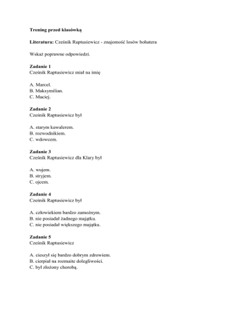 Trening przed klasówką Literatura: Cześnik Raptusiewicz - znajomość losów bohatera Wskaż poprawne odpowiedzi. Zadanie 1 Cześnik Raptusiewicz miał na imię A. Marcel. B. Maksymilian. C. Maciej. Zadanie 2 Cześnik Raptusiewicz był A. starym kawalerem. B. rozwodnikiem. C. wdowcem. Zadanie 3 Cześnik Raptusiewicz dla Klary był A. wujem. B. stryjem. C. ojcem. Zadanie 4 Cześnik Raptusiewicz był A. człowiekiem bardzo zamożnym. B. nie posiadał żadnego majątku. C. nie posiadał większego majątku. Zadanie 5 Cześnik Raptusiewicz A. cieszył się bardzo dobrym zdrowiem. B. cierpiał na rozmaite dolegliwości. C. był złożony chorobą. Zadanie 6 Cześnik Raptusiewicz A. nie potrafił czytać, ale umiał pisać. B. nie potrafił pisać, ale umiał czytać. C. nie potrafił ani pisać, ani czytać. Zadanie 7 Cześnik Raptusiewicz był A. kłótliwy, porywczy, spokojny. B. kłótliwy, porywczy, wybuchowy. C. opanowany, kłótliwy, porywczy. Zadanie 8 Powiedzonkiem Cześnika Raptusiewicza były słowa A. "masz panie". B. "mocium, mocium" C. "mocium panie". Zadanie 9 Nazwisko Raptusiewicz oznacza A. bezkonfliktowy. B. zrównoważony. C. narwaniec. ODPOWIEDZI DO ZADAŃ Zadanie 1 C Zadanie 2 A Zadanie 3 B Zadanie 4 C Zadanie 5 B Zadanie 6 C Zadanie 7 B Zadanie 8 C Zadanie 9 C ....................................................................................................................................................... Literatura: praca z tekstem Przeczytaj wiersz Janusza Pasierba „Przypowieść o ojcu”, a następnie wskaż poprawną odpowiedź. Janusz Pasierb "Przypowieść o ojcu" Kiedy się starasz zapomnieć pamięta kiedy nie możesz zasnąć czeka aż się obudzisz kiedy nie myślisz wracać wygląda ciebie kiedy nie widzisz wyjścia każe otwierać wrota kiedy umierasz z głodu poleca nakrywać stoły kiedy się kulisz w łachmanie wybiera dla ciebie szatę gdy mówisz wstanę i pójdę rusza naprzeciw gdy trzesz oczy jak suche kamienie płacze nad tobą kiedy nie śmiesz wyciągnąć rękę oplatają cię jego ramiona gdy twój brat wypomni żeś odszedł odpowie że właśnie wróciłeś Zadanie 1 Wiersz został napisany A. tercyną. B. sekstyną. C. dystychem. D. sylabotonikiem. Zadanie 2 Każda zwrotka rozpoczyna się od A. spójnika. B. przymiotnika. C. zaimka. D. rzeczownika. Zadanie 3 „Umierać z głodu” to A. epitet. B. onomatopeja. C. personifikacja. D. metafora. Zadanie 4 „Oczy jak suche kamienie” to A. onomatopeja. B. epitet. C. porównanie. D. personifikacja. Zadanie 5. Który zestaw zawiera poprawnie nazwane części mowy występujące w zwrotce pierwszej A. zaimek, partykuła, czasownik, rzeczownik, czasownik. B. zaimek, czasownik, czasownik, spójnik, czasownik. C. zaimek, zaimek, czasownik, bezokolicznik, czasownik. D. zaimek, rzeczownik, czasownik, zaimek, spójnik. Zadanie 6 Wiersz jest aluzją do A. tekstu fantasy. B. tekstu mitologicznego. C. tekstu biblijnego. D. tekstu popularnonaukowego. Zadanie 7 W której zwrotce jest mowa o zaspokojeniu głodu? A. w czwartej. B. w trzeciej. C. w piątej. D. w szóstej. Zadanie 8 Jakie emocje zostały wyrażone w zwrotce dziewiątej? Wybierz stosowne wyrazy spośród podanych poniżej. obawa, dobroć, gniew, wzburzenie, czułość, łagodność, lęk, niepewność, zdenerwowanie ODPOWIEDZI DO ZADAŃ Zadanie 1 C Zadanie 2 C Zadanie 3 D Zadanie 4 C Zadanie 5 C Zadanie 6 C Zadanie 7 C Zadanie 8 obawa, dobroć, czułość, łagodność, lęk, niepewność ....................................................................................................................................................... Nauka o języku: imiesłów przymiotnikowy czynny Zadanie 1 Od podanych bezokoliczników utwórz przymiotniki czynne w rodzajach męskim, żeńskim, nijakim. A. biegać B. czytać C. myśleć D. rysować E. kupić Zadanie 2 Przekształć podane sformułowania tak, aby zamiast czasowników użyć imiesłowów przymiotnikowych czynnych. A. koń, który galopuje B. dziecko, które płacze C. nauczycielka, która mówi D. murarz, który buduje E. obraz, który wisi ODPOWIEDZI DO ZADAŃ Zadanie 1 A. biegać - biegający, biegająca, biegające B. czytać - czytający, czytająca, czytające C. myśleć - myślący, myśląca, myślące D. rysować - rysujący, rysująca, rysujące E. kupić - kupujący, kupująca, kupujące Zadanie 2 A. koń, który galopuje - galopujący koń B. dziecko, które płacze - płaczące dziecko C. nauczycielka, która mówi - mówiąca nauczycielka D. murarz, który buduje - budujący murarz E. obraz, który wisi - wiszący obraz