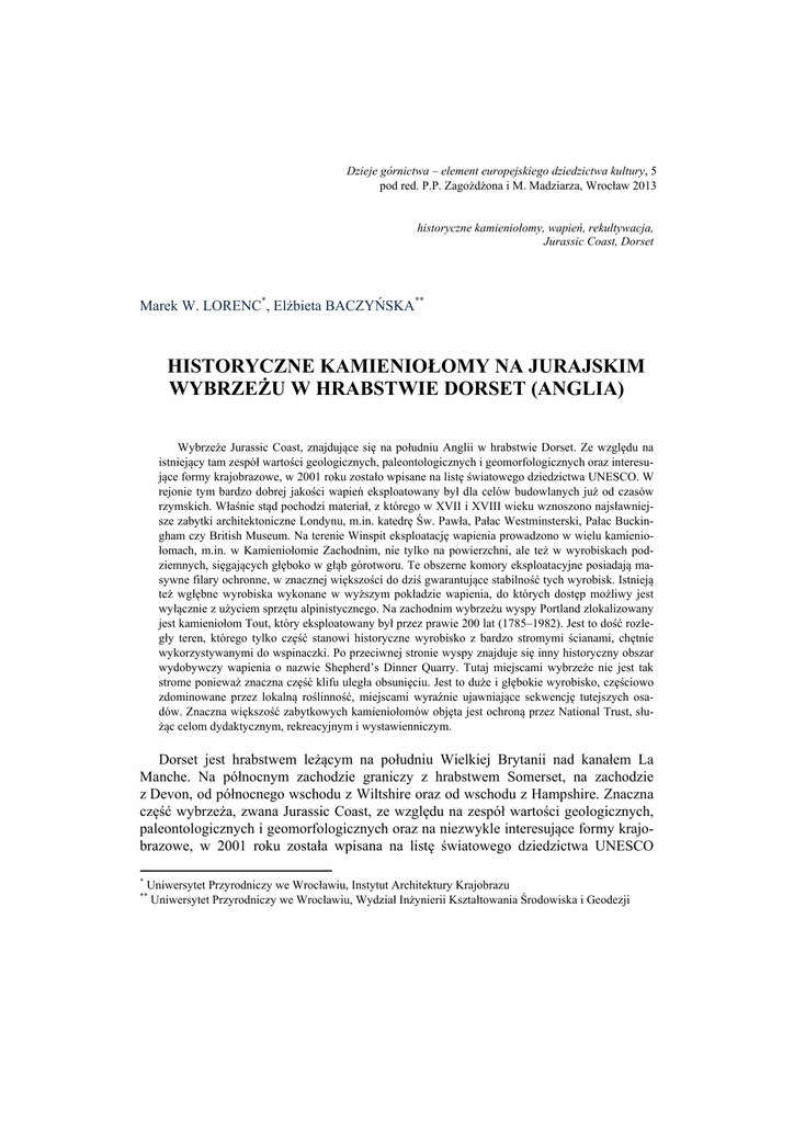 Dzieje górnictwa – element europejskiego dziedzictwa kultury, 5 pod red. P.P. Zagożdżona i M. Madziarza, Wrocław 2013 historyczne kamieniołomy, wapień, rekultywacja, Jurassic Coast, Dorset Marek W. LORENC*, Elżbieta BACZYŃSKA** HISTORYCZNE KAMIENIOŁOMY NA JURAJSKIM WYBRZEŻU W HRABSTWIE DORSET (ANGLIA) Wybrzeże Jurassic Coast, znajdujące się na południu Anglii w hrabstwie Dorset. Ze względu na istniejący tam zespół wartości geologicznych, paleontologicznych i geomorfologicznych oraz interesujące formy krajobrazowe, w 2001 roku zostało wpisane na listę światowego dziedzictwa UNESCO. W rejonie tym bardzo dobrej jakości wapień eksploatowany był dla celów budowlanych już od czasów rzymskich. Właśnie stąd pochodzi materiał, z którego w XVII i XVIII wieku wznoszono najsławniejsze zabytki architektoniczne Londynu, m.in. katedrę Św. Pawła, Pałac Westminsterski, Pałac Buckingham czy British Museum. Na terenie Winspit eksploatację wapienia prowadzono w wielu kamieniołomach, m.in. w Kamieniołomie Zachodnim, nie tylko na powierzchni, ale też w wyrobiskach podziemnych, sięgających głęboko w głąb górotworu. Te obszerne komory eksploatacyjne posiadają masywne filary ochronne, w znacznej większości do dziś gwarantujące stabilność tych wyrobisk. Istnieją też wgłębne wyrobiska wykonane w wyższym pokładzie wapienia, do których dostęp możliwy jest wyłącznie z użyciem sprzętu alpinistycznego. Na zachodnim wybrzeżu wyspy Portland zlokalizowany jest kamieniołom Tout, który eksploatowany był przez prawie 200 lat (1785–1982). Jest to dość rozległy teren, którego tylko część stanowi historyczne wyrobisko z bardzo stromymi ścianami, chętnie wykorzystywanymi do wspinaczki. Po przeciwnej stronie wyspy znajduje się inny historyczny obszar wydobywczy wapienia o nazwie Shepherd’s Dinner Quarry. Tutaj miejscami wybrzeże nie jest tak strome ponieważ znaczna część klifu uległa obsunięciu. Jest to duże i głębokie wyrobisko, częściowo zdominowane przez lokalną roślinność, miejscami wyraźnie ujawniające sekwencję tutejszych osadów. Znaczna większość zabytkowych kamieniołomów objęta jest ochroną przez National Trust, służąc celom dydaktycznym, rekreacyjnym i wystawienniczym. Dorset jest hrabstwem leżącym na południu Wielkiej Brytanii nad kanałem La Manche. Na północnym zachodzie graniczy z hrabstwem Somerset, na zachodzie z Devon, od północnego wschodu z Wiltshire oraz od wschodu z Hampshire. Znaczna część wybrzeża, zwana Jurassic Coast, ze względu na zespół wartości geologicznych, paleontologicznych i geomorfologicznych oraz na niezwykle interesujące formy krajobrazowe, w 2001 roku została wpisana na listę światowego dziedzictwa UNESCO * Uniwersytet Przyrodniczy we Wrocławiu, Instytut Architektury Krajobrazu Uniwersytet Przyrodniczy we Wrocławiu, Wydział Inżynierii Kształtowania Środowiska i Geodezji ** 176 Marek W. LORENC, Elżbieta BACZYŃSKA (Bennet & Doyle, 1998). Całość wybrzeża objętego ochroną liczy 153 km i jest to jedno z nielicznych miejsc na świecie, gdzie widoczne są w stanie nienaruszonym dowody na 185 mln ewolucji (http://whc.unesco..., 2012). Wybrzeże to cieszy się również dużym zainteresowaniem wśród paleontologów ze względu na liczne szczątki kopalnych gatunków fauny, ślady dinozaurów (Edmonds, 2002), w tym latających gadów i płazów morskich, bogate źródło amonitów (Clasby, 2003; Damon, 1884) oraz flory, m.in. dobrze zachowane pozostałości lasów jurajskich (Damon, 1860; http:// www.jurassiccoast..., 2012). W południowej Anglii występują głównie utwory mezozoiczne, takie jak triasowe piaskowce i zlepieńce, jurajskie wapienie oraz górnokredowe osady kredy (Bird 2010). Spotykane są również osady kenozoiczne w postaci eoceńskich glin i żwirów, także jeziornych piaskowców i wapieni. Jurajskie Wybrzeże poza hrabstwem Dorset obejmuje też wschodnią część hrabstwa Devon. Dzięki wychyleniu i zapadaniu pod niewielkim kątem ku wschodowi pakietu płasko zalegających osadów mezozoicznych istnieje tu możliwość prześledzenia różnorodności litologicznej. Wybrzeże to ujawnia przekrój przez cały mezozoik, którego trzy okresy reprezentowane są przez trzy rodzaje skał. Najstarsze osady triasowe odsłaniają się w części wybrzeża leżącej na terenie East Devon i są to czerwone piaskowce pochodzenia pustynnego. Położone bardziej na wschód klify wybrzeża Dorset zbudowane są z ciemnych mułowców, uformowanych we wczesnojurajskim morzu tropikalnym, które w tym czasie wtargnęło na tereny pustynne. Dalej na wschód rozciągają się jurajskie skały wapienne z podrzędnym udziałem jasnych piaskowców kredowych (West, 2010). Znacznej miąższości pakiety białej kredy budują wysokie klify we wschodniej części Jurajskiego Wybrzeża, w najbliższych okolicach unikatowej formy morfologicznej, jaką jest Durdle door (rys. 1 i 2). Względnie ciepły i słoneczny klimat pozwala wielu gatunkom roślin na szybki rozwój, jednak wyłącznie na lądzie stałym. Wapienna gleba charakteryzuje się niskimi właściwościami odżywczymi, co utrudnia rozwój wielu gatunków, szczególnie drzew. Dzięki temu gabarytowo mniejsze gatunki kwiatów i traw mają duże szanse na rozwój. Spotkać tu można odmianę lawendy, rosnącą na wysokich klifach, unikatową zarówno dla obszaru Portland, jak i dla całej Wielkiej Brytanii. Dzikie kwiaty i trawy tworzą doskonałe warunki dla licznej grupy zamieszkujących te tereny motyli. Ponad 50 rzadkich gatunków tych owadów występuje na wyspie, uwzględniając w tym gatunki migrujące tu z kontynentu (http://www.portlandcp..., 2012). Spośród gatunków zamieszkujących Portland, a rzadkich dla Wielkiej Brytanii, należy wymienić motyla o nazwie Modraszek argus (Plebejus argus), który upodobał sobie właśnie jurajskie wapienie. Historyczne kamieniołomy na Jurajskim Wybrzeż