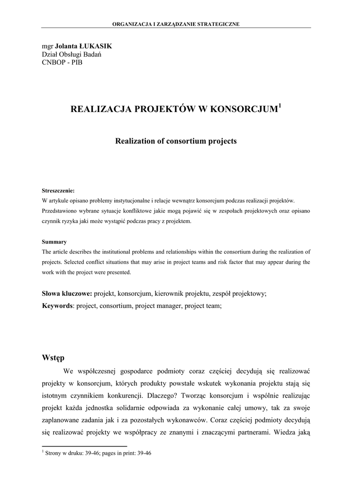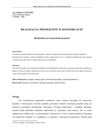 ORGANIZACJA I ZARZĄDZANIE STRATEGICZNE mgr Jolanta ŁUKASIK Dział Obsługi Badań CNBOP - PIB REALIZACJA PROJEKTÓW W KONSORCJUM1 Realization of consortium projects Streszczenie: W artykule opisano problemy instytucjonalne i relacje wewnątrz konsorcjum podczas realizacji projektów. Przedstawiono wybrane sytuacje konfliktowe jakie mogą pojawić się w zespołach projektowych oraz opisano czynnik ryzyka jaki moŜe wystąpić podczas pracy z projektem. Summary The article describes the institutional problems and relationships within the consortium during the realization of projects. Selected conflict situations that may arise in project teams and risk factor that may appear during the work with the project were presented. Słowa kluczowe: projekt, konsorcjum, kierownik projektu, zespół projektowy; Keywords: project, consortium, project manager, project team; Wstęp We współczesnej gospodarce podmioty coraz częściej decydują się realizować projekty w konsorcjum, których produkty powstałe wskutek wykonania projektu stają się istotnym czynnikiem konkurencji. Dlaczego? Tworząc konsorcjum i wspólnie realizując projekt kaŜda jednostka solidarnie odpowiada za wykonanie całej umowy, tak za swoje zaplanowane zadania jak i za pozostałych wykonawców. Coraz częściej podmioty decydują się realizować projekty we współpracy ze znanymi i znaczącymi partnerami. Wiedza jaką 1 Strony w druku: 39-46; pages in print: 39-46 ORGANIZACJA I ZARZĄDZANIE STRATEGICZNE wnoszą do projektu partnerzy gwarantuje sukces i powodzenie całego przedsięwzięcia od momentu jego planowania, aŜ po zakończenie i wdroŜenie. Artykuł ten jest kontynuacją informacji jakie ukazały się w Nr 1 kwartalnika Bezpieczeństwo i Technika PoŜarnicza pt. „Specyfika projektów realizowanych w konsorcjum”. Nawiązując do poprzedniego artykułu przypomnę, Ŝe terminem Konsorcjum określa się porozumienie podmiotów w celu zawiązania współpracy do zrealizowania określonego przedsięwzięcia. W zaleŜności od rodzaju i charakteru planowanego projektu rozpoznajemy i moŜemy zaprosić do współpracy naszych najlepszych partnerów. Realizacja wspólnego celu wymaga współdziałania pomiędzy podmiotami odpowiedzialnymi za wspólny sukces przedsięwzięcia. Niniejszy artykuł ma charakter ogólny, ze szczególnym zwróceniem uwagi na kwestie merytoryczne występujące w projektach realizowanych w konsorcjum. Podstawa prawna utworzenia konsorcjum Najczęstszą formą zawiązania konsorcjum jest umowa pomiędzy uczestnikami konsorcjum. Reprezentowane jest przez jeden lub kilka podmiotów naleŜących do konsorcjum. Konsorcjum nie jest podmiotem gospodarczym, nie musi więc być rejestrowane, nie musi mieć odrębnej nazwy ani teŜ siedziby, ma charakter najczęściej tymczasowy. Podmioty tworzące konsorcjum są niezaleŜne w swoich dotychczasowych działaniach (czyli w działaniach nie związanych z konsorcjum), a w działaniach dotyczących współpracy w konsorcjum realizują wspólną politykę finansową objętą porozumieniem. Zawierając umowę konsorcjum podmioty mogą określić, który z podmiotów lub osób będzie reprezentował konsorcjum na zewnątrz (moŜe to być jeden podmiot, kilka, lub osoba trzecia). Zobowiązanie uczestników konsorcjum do współdziałania dla osiągnięcia wspólnego celu poprzez podejmowanie określonych w umowie zadań stanowi istotę konsorcjum2. Celem zawiązania konsorcjum jest najczęściej wspólne działanie w realizacji konkretnego przedsięwzięcia gospodarczego, które ze względu na potencjał finansowy oraz połączenie kompetencji poszczególnych podmiotów, przekracza moŜliwości jednej instytucji. Umowa na podstawie której zostaje utworzone konsorcjum, powinna jasno określać w jaki sposób konsorcjum ma być reprezentowane oraz określać zakres ponoszonej odpowiedzialności. W związku z faktem, iŜ umowy o zawiązanie konsorcjum są w róŜny 2 T.D. Nędzi, B. Cegłowski, Pozyskiwanie kapitału. Podstawowe formy i moŜliwości zdobycia kapitału, One Press 2005, str. 55 ORGANIZACJA I ZARZĄDZANIE STRATEGICZNE sposób konstruowane warto w umowie konsorcjum szczegółowo doprecyzować za co odpowiada kaŜda ze stron. Dlaczego warto tworzyć konsorcjum? Do jednej z wielu zalet konsorcjum naleŜy zaliczyć przede wszystkim łatwość i szybkość jego tworzenia. Jak wspomniałam wyŜej polskie prawo nie przewiduje zasadniczych i uregulowanych zasad. Pozostawia konsorcjantom w tym zakresie duŜą swobodę co wpływa przede wszystkim na prawidłowe tworzenie wewnętrznych relacji. Jest niekiedy traktowane jako nowo powstała spółka cywilna, która utworzyła się w celu osiągnięcia wspólnego zamierzenia. Wszyscy konsorcjanci realizując wspólne przedsięwzięcie dąŜą do uzyskania korzyści oraz muszą mieć na uwadze wspólne ponoszenie ryzyka jakie moŜe wystąpić w trakcie realizacji projektu. Konsorcja tworzy się najczęściej w momencie potrzeby zrealizowania rozległych i skomplikowanych przedsięwzięć, których sami nie jesteśmy w stanie sprostać, a które obarczone są duŜym ryzykiem. Problemy instytucjonalne i relacje w konsorcjum podczas realizacji projektu Ogólne zagadnienia natury finansowej i formalnej przedstawiłam we wspomnianym na wstępie wcześniejszym artykule, w którym to opisałam problemy jakie występują podczas wspólnej realizacji projektów w konsorcjum. W tym miejscu postaram się przedstawić kilka przykładów praktycznych związanych z problemami merytorycznymi w projektach. Jak nie trudno się domyśleć na etapie przygotowywania projektu nie jesteśmy w stanie przewiedzieć wszystkich ewentualnych trudności jakie mogą pojawić się podczas realizacji projektu. Wybierając do współpracy kluczowe podmioty, z którymi juŜ współpracowaliśmy albo rozpoczynamy współpracę staramy się na początku oceniać ich doświadczenia i wiedzę w danej dziedzinie. Często analizujemy równieŜ zasoby