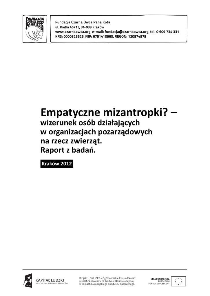 Empatyczne mizantropki? – wizerunek osób działających w organizacjach pozarządowych na rzecz zwierząt. Raport z badań. Kraków 2012 Spis treści Przedmowa............................................................................................................ 3 Wprowadzenie....................................................................................................... 5 Część 1 Wyniki badań ankietowych..................................................................................... 8 1.1 Opis badanej próby – cechy społeczno-demograficzne..................................8 1.2 Ocena sytuacji zwierząt w Polsce.................................................................... 9 1.3 Wiedza o organizacjach.................................................................................. 9 1.4 Działalność jest kobietą?............................................................................... 13 1.5 Zakończenie.................................................................................................. 16 Część 2.................................................................................................................. 17 2.1 Wywiady z przedstawicielami i przedstawicielkami organizacji prozwierzęcych.............................................................................................. 17 2.2 Historie karmicielek...................................................................................... 32 Epilog – aktywiści i aktywistki w mediach............................................................. 37 Aneks................................................................................................................... 47 Przedmowa Potrzeba zbadania wizerunku osób działających na rzecz zwierząt została zdiagnozowana w trakcie skierowanego do NGO prozwierzęcych projektu „Sieć OFF - Ogólnopolskie Forum Fauna” realizowanego przez Fundację Czarna Owca Pana Kota. Z rozmów przeprowadzonych z aktywistkami i aktywistami wynikało, że najbardziej utrudnia im pracę w terenie i działalność na rzecz zwierząt brak zaufania społecznego. Postanowiłyśmy zatem przyjrzeć się bliżej społecznym wyobrażeniom. Zadanie to nie było łatwe, ponieważ do tej pory nie istniały badania na ten temat. Oczywiście ruchy ekologiczne budziły zainteresowanie części badaczy i badaczek społecznych (wspomnieć należy publikacje Piotra Żuka ) niewiele jednak było badań poświęconych konkretnie osobom pracującym na rzecz zwierząt. Nasza praca miała zatem charakter pionierski. Badanie zostało zrealizowane w okresie od maja do grudnia 2012 roku. Składało się ono z następujących elementów: − ankieta internetowa, którą wypełniło 616 osób. Głównym czynnikiem przemawiającym za tą metodą realizacji badania była możliwość dotarcia do dużej liczby odbiorców w stosunkowo krótkim czasie. Ta zaleta przeważyła nad wadami badań internetowych, jakimi są nadreprezentacja osób młodych i zamieszkałych w dużych miastach1. − 16 wywiadów pogłębionych z przedstawicielkami i przedstawicielami organizacji uczestniczących w projekcie. Dobierając organizacje do badania, starałyśmy się, aby grupa była maksymalnie zróżnicowana, zarówno ze względu na lokalizację danej organizacji, jak i na charakter podejmowanych przez nią działań. − Jednym z problemów, jaki wyłonił się w trakcie badań, była kwestia traktowania indywidualnych „karmicielek kotów”. Początkowo grupa ta nie była brana pod uwagę, niemniej jednak w związku z incydentem, jaki miał miejsce w trakcie badania (akt agresji wobec karmicielki i towarzyszącej jej przedstawicielki organizacji), zdecydowałyśmy się na przeprowadzenie kilku 1 Na istnienie tej asymetrii wskazują między innymi dane umieszczone w ostatniej „Diagnozie Społecznej” (www.diagnoza.com). wywiadów z karmicielkami z Krakowa. Ostatecznie uzyskałyśmy trzy wywiady, które stanowią dla nas cenny materiał badawczy, ponieważ są to historię osób, które odgrywają ważną rolę w działaniach na rzecz zwierząt w Polsce i jednocześnie są nieobecne w mediach i w debacie publicznej. − Analiza materiałów prasowych – w tym przypadku artykułów autorstwa działaczy i działaczek prozwierzęcych oraz reakcji na nie. Raport składa się z trzech części: w pierwszej prezentujemy wyniki ankiet. W drugiej omawiamy wywiady przeprowadzone z działaczkami i działaczami NGO prozwierzęcych. Cześć trzecia, zatytułowana „Epilog”, poświęcona jest obecności działaczy/czek prozwierzęcych w mediach. Przed zaproszeniem do lektury raportu, chciałybyśmy gorąco podziękować wszystkim uczestnikom i uczestniczkom badania za pomoc w realizacji. Mamy nadzieję, że udział w naszych badaniach był dla Państwa ciekawym doświadczeniem. Zespół Fundacji Czarna Owca Pana Kota Raport opracowała na zlecenie Fundacji Czarna Owca Pana Kota – Agata Młodawska. Wprowadzenie Wprowadzenie do badania należy rozpocząć od opisania stanu świadomości Polaków, czyli od określenia, z jakiego rodzaju postawami działacze i działaczki muszą się zmierzyć na co dzień. W tym celu posłużono się komunikatami z badań zrealizowanych przez CBOS w 2006 roku z okazji dziesięciolecia ustawy o ochronie zwierząt. Skuteczność ustawy była ocenia rozmaicie: 35% badanych uznało, że ustawa skutecznie chroni zwierzęta, a 33% było zdania przeciwnego. Większość badanych przyznawała (70%), że słyszała o przypadkach, kiedy karano dręczycieli zwierząt2. Badani w 2006 roku byli w jednej kwestii jednomyślni – nie powinno się zabijać zwierząt bez ograniczeń. Ankietowani podeszli jednak do tej kwestii utylitarnie – większość badanych zgodziła się na zabijanie zwierząt „szkodliwych”. Ponad dwie trzecie (67%) uznawała również zabijanie zwierząt za usprawiedliwione, jeżeli miało ono na celu konsumpcję lub było związane z zaspokoj