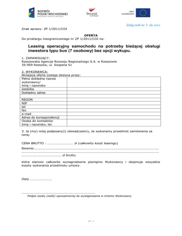 Załącznik nr 3 do siwz Znak sprawy: ZP 1/2011/COI OFERTA Do przetargu nieograniczonego nr ZP 1/2011/COI na: Leasing operacyjny samochodu na potrzeby bieżącej obsługi inwestora typu bus (7 osobowy) bez opcji wykupu. 1. ZAMAWIAJĄCY: Rzeszowska Agencja Rozwoju Regionalnego S.A. w Rzeszowie 35-959 Rzeszów, ul. Szopena 51 2. WYKONAWCA: Niniejsza oferta zostaje złożona przez: Pełna dokładna nazwa wykonawcy/ Imię i nazwisko siedziba Dokładny adres REGON NIP tel fax e-mail Adres do korespondencji Osoba do kontaktów Imię i nazwisko, tel. 3. Ja (my) niżej podpisany(i) oświadczam/y, że wykonamy przedmiot zamówienia za cenę: CENA BRUTTO : …………….......…... zł (całkowity koszt leasingu) Słownie:................................................................................................................ ............................................................................................................................ .................................... zł brutto. która stanowi całkowite wynagrodzenie pieniężne Wykonawcy i obejmuje wszystkie koszty wykonania przedmiotu umowy. Data ……………………… .................................................................. Podpis osoby (osób) upoważnionej do występowania w imieniu Wykonawcy str. 1 4. W przypadku wyboru mojej/naszej* oferty Zobowiązuję/my* się do: - dostarczenia Zamawiającemu samochodu osobowego: ...................................................................................................... - (marka i model samochodu) który spełnia wymagania określone w opisie przedmiotu zamówienia stanowiącym załącznik nr 1 do SIWZ oraz posiada indywidualne cechy zgodnie z załączonym do oferty opisem oferowanego samochodu zawierającym informacje w zakresie cech, parametrów i wyposażenia wskazanych w załączniku nr 1 do SIWZ oddania w/w samochodu Zamawiającemu do używania na czas określony wskazany w SIWZ. 5. Oświadczam/my, iż zapoznaliśmy się ze specyfikacją istotnych warunków zamówienia i nie wnosimy do niej zastrzeżeń. 6. Oświadczam/my, iż akceptujemy przekazany przez Zamawiającego opis przedmiotu zamówienia oraz istotne postanowienia umowy. 7. Oświadczam/my, iż w przypadku wyboru naszej oferty zobowiązujemy się do zawarcia umowy na warunkach określonych w specyfikacji istotnych warunków zamówienia. 8. Część (zakres) zamówienia dotyczący …………………………………………………… realizowana przez podwykonawcę (jeśli dotyczy). 9. W załączeniu następujące oświadczenia i dokumenty: ....... a) opis oferowanego samochodu b) .... Data ……………………… .................................................................. Podpis osoby (osób) upoważnionej do występowania w imieniu Wykonawcy str. 2 będzie