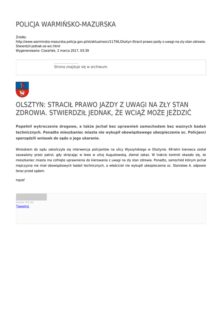 POLICJA WARMIŃSKO-MAZURSKA OLSZTYN: STRACIŁ PRAWO