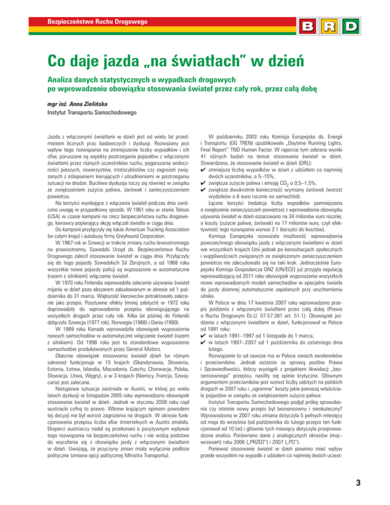 Bezpieczeństwo Ruchu Drogowego Co daje jazda „na światłach” w dzień Analiza danych statystycznych o wypadkach drogowych po wprowadzeniu obowiązku stosowania świateł przez cały rok, przez całą dobę mgr inż. Anna Zielińska Instytut Transportu Samochodowego Jazda z włączonymi światłami w dzień jest od wielu lat przedmiotem licznych prac badawczych i dyskusji. Rozważany jest wpływ tego rozwiązania na zmniejszenie liczby wypadków i ich ofiar, poruszane są aspekty postrzegania pojazdów z włączonymi światłami przez różnych uczestników ruchu, pogarszania widoczności pieszych, rowerzystów, motocyklistów czy zagrożeń związanych z oślepianiem kierujących i utrudnieniami w postrzeganiu sytuacji na drodze. Burzliwa dyskusja toczy się również w związku ze zwiększeniem zużycia paliwa, żarówek i zanieczyszczeniem powietrza. Na korzyści wynikające z włączania świateł podczas dnia zwrócono uwagę w przypadkowy sposób. W 1961 roku w stanie Teksas (USA) w czasie kampanii na rzecz bezpieczeństwa ruchu drogowego, kierowcy popierający akcję włączali światła w ciągu dnia. Do kampanii przyłączyły się także American Trucking Association (w całym kraju) i autobusy firmy Greyhound Corporation. W 1967 rok w Szwecji w trakcie zmiany ruchu lewostronnego na prawostronny, Szwedzki Urząd ds. Bezpieczeństwa Ruchu Drogowego zalecił stosowanie świateł w ciągu dnia. Przyłączyły się do tego pojazdy Szwedzkich Sił Zbrojnych, a od 1968 roku wszystkie nowe pojazdy policji są wyposażone w automatyczne (razem z silnikiem) włączanie świateł. W 1970 roku Finlandia wprowadziła zalecenie używania świateł mijania w dzień poza obszarem zabudowanym w okresie od 1 października do 31 marca. Większość kierowców potraktowało zalecenie jako przepis. Pozytywne efekty (mniej zabitych) w 1972 roku doprowadziły do wprowadzenia przepisu obowiązującego na wszystkich drogach przez cały rok. Kilka lat później do Finlandii dołączyła Szwecja (1977 rok), Norwegia (1988) i Dania (1990). W 1989 roku Kanada wprowadziła obowiązek wyposażenia nowych samochodów w automatyczne włączanie świateł (razem z silnikiem). Od 1998 roku jest to standardowe wyposażenie samochodów produkowanych przez General Motors. Obecnie obowiązek stosowania świateł dzień (w różnym zakresie) funkcjonuje w 15 krajach (Skandynawia, Słowenia, Estonia, Łotwa, Islandia, Macedonia, Czechy, Chorwacja, Polska, Słowacja, Litwa, Węgry), a w 3 krajach (Niemcy, Francja, Szwajcaria) jest zalecane. Nietypowa sytuacja zaistniała w Austrii, w której po wielu latach dyskusji w listopadzie 2005 roku wprowadzono obowiązek stosowania świateł w dzień. Jednak w styczniu 2008 roku rząd austriacki cofną to prawo. Wbrew krążącym opiniom powodem tej decyzji nie był wzrost zagrożenia na drogach. W okresie funkcjonowania przepisu liczba ofiar śmiertelnych w Austrii zmalała. Eksperci austriaccy nadal są przekonani o pozytywnym wpływie tego rozwiązania na bezpieczeństwo ruchu i nie widzą podstaw do wycofania się z obowiązku jazdy z włączonymi światłami w dzień. Uważają, że przyczyny zmian miały wyłącznie podłoże polityczne (zmiana opcji politycznej Ministra Transportu). W październiku 2003 roku Komisja Europejska ds. Energii i Transportu (DG TREN) opublikowała „Daytime Running Lights, Final Report” TNO Human Factor. W raporcie tym zebrano wyniki 41 różnych badań na temat stosowania świateł w dzień. Stwierdzono, że stosowanie świateł w dzień (DRL): ✔✔ zmniejsza liczbę wypadków w dzień z udziałem co najmniej dwóch uczestników, o 5–15%, ✔✔ zwiększa zużycie paliwa i emisję CO2 o 0,5–1,5%, ✔✔ zwiększa dwukrotnie konieczność wymiany żarówek (wzrost wydatków o 6 euro rocznie na samochód). Łączne korzyści (redukcja liczby wypadków pomniejszona o zwiększenie zanieczyszczeń powietrza) z wprowadzenia obowiązku używania świateł w dzień oszacowano na 34 milionów euro rocznie, a koszty (zużycie paliwa, żarówek) na 17 milionów euro, czyli efektywność tego rozwiązania wynosi 2:1 (korzyści do kosztów). Komisja Europejska rozważała możliwość wprowadzenia powszechnego obowiązku jazdy z włączonymi światłami w dzień we wszystkich krajach Unii jednak po konsultacjach społecznych i wątpliwościach związanych ze zwiększonym zanieczyszczeniem powietrza nie zdecydowała się na taki krok. Jednocześnie Europejska Komisja Gospodarcza ONZ (UN/ECE) już przyjęła regulację wprowadzającą od 2011 roku obowiązek wyposażania wszystkich nowo wprowadzanych modeli samochodów w specjalne światła do jazdy dziennej automatycznie zapalanych przy uruchomieniu silnika. W Polsce w dniu 17 kwietnia 2007 roku wprowadzono przepis jeżdżenia z włączonymi światłami przez całą dobę (Prawo o Ruchu Drogowym Dz.U. 07.57.381 art. 51.1). Obowiązek jeżdżenia z włączonymi światłami w dzień, funkcjonował w Polsce od 1991 roku: ✔✔ w latach 1991–1997 od 1 listopada do 1 marca, ✔✔ w latach 1997–2007 od 1 października do ostatniego dnia lutego. Rozwiązanie to od zawsze ma w Polsce swoich zwolenników i przeciwników. Jednak ostatnio za sprawą posłów Prawa i Sprawiedliwości, którzy wystąpili z projektem likwidacji „bezsensownego” przepisu, nasiliły się opinie krytyczne. Głównym argumentem przeciwników jest wzrost liczby zabitych na polskich drogach w 2007 roku i „ogromne” koszty jakie ponoszą właściciele pojazdów w związku ze zwiększeniem zużycia paliwa. Instytut Transportu Samochodowego podjął próbę sprawdzenia czy istotnie nowy przepis był bezsensowny i nieskuteczny? Wprowadzona w 2007 roku zmiana dotyczyła 5 pełnych miesięcy od maja do września (od października do lutego przepis ten funkcjonował od 10 lat) i głównie tych miesięcy dotyczyła przeprowadzona analiza. Porównano dane z analogicznych okresów (maj– wrzesień) roku 2006 („PRZED”) i 