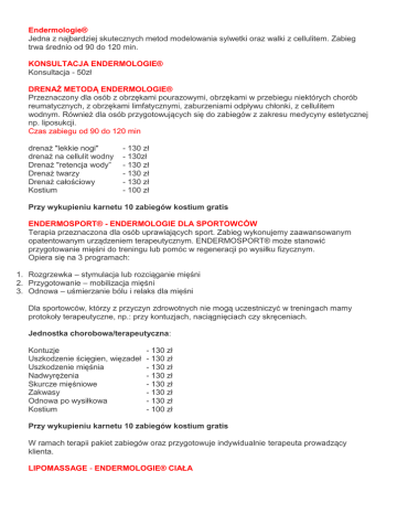 Endermologie® Jedna z najbardziej skutecznych metod modelowania sylwetki oraz walki z cellulitem. Zabieg trwa średnio od 90 do 120 min. KONSULTACJA ENDERMOLOGIE® Konsultacja - 50zł DRENAŻ METODĄ ENDERMOLOGIE® Przeznaczony dla osób z obrzękami pourazowymi, obrzękami w przebiegu niektórych chorób reumatycznych, z obrzękami limfatycznymi, zaburzeniami odpływu chłonki, z cellulitem wodnym. Również dla osób przygotowujących się do zabiegów z zakresu medycyny estetycznej np. liposukcji. Czas zabiegu od 90 do 120 min drenaż "lekkie nogi" drenaż na cellulit wodny Drenaż "retencja wody” Drenaż twarzy Drenaż całościowy Kostium - 130 zł - 130zł - 130 zł - 130 zł - 130 zł - 100 zł Przy wykupieniu karnetu 10 zabiegów kostium gratis ENDERMOSPORT® - ENDERMOLOGIE DLA SPORTOWCÓW Terapia przeznaczona dla osób uprawiających sport. Zabieg wykonujemy zaawansowanym opatentowanym urządzeniem terapeutycznym. ENDERMOSPORT® może stanowić przygotowanie mięśni do treningu lub pomóc w regeneracji po wysiłku fizycznym. Opiera się na 3 programach: 1. Rozgrzewka – stymulacja lub rozciąganie mięśni 2. Przygotowanie – mobilizacja mięśni 3. Odnowa – uśmierzanie bólu i relaks dla mięśni Dla sportowców, którzy z przyczyn zdrowotnych nie mogą uczestniczyć w treningach mamy protokoły terapeutyczne, np.: przy kontuzjach, naciągnięciach czy skręceniach. Jednostka chorobowa/terapeutyczna: Kontuzje Uszkodzenie ścięgien, więzadeł Uszkodzenie mięśnia Nadwyrężenia Skurcze mięśniowe Zakwasy Odnowa po wysiłkowa Kostium - 130 zł - 130 zł - 130 zł - 130 zł - 130 zł - 130 zł - 130 zł - 100 zł Przy wykupieniu karnetu 10 zabiegów kostium gratis W ramach terapii pakiet zabiegów oraz przygotowuje indywidualnie terapeuta prowadzący klienta. LIPOMASSAGE - ENDERMOLOGIE® CIAŁA To profesjonalna w 100% naturalna, opatentowana przez firmę LPG technologia masażu mechanicznego tkanki łącznej i mięśniowej. Służąca modelowaniu, ujędrnieniu, wyszczupleniu ciała, odbudowie tkanek, zagęszczeniu skóry, stymulacji fibroblastów oraz adipocytów. LIPOMASSAGE® to technika, która rozwiąże Twoje problemy z opornym, zastałym tłuszczem, cellulitem tłuszczowym, cellulitem wodnym oraz zwiotczałą luźną skórą. Zabieg trwa od 90 do 120 minut. Pojedynczy zabieg Pakiet 5 zabiegów Pakiet 10 zabiegów + kostium GRATIS Pakiet 15 zabiegów + kostium GRATIS Pakiet 20 zabiegów + kostium GRATIS Kostium - 150 zł - 700 zł - 1 300 zł - 1 800 zł - 2 300 zł - 100 zł Przy wykupieniu karnetu 10 zabiegów kostium gratis ENDERMOLOGIE® ZLOKALIZOWANA To propozycja dla osób, które po zastosowaniu ENDERMOLOGIE® LIPOMASSAGE na całym ciele pragną skoncentrować się tylko na redukcji opornych lokalnych otłuszczeń, np.: ramion, pleców, brzucha, bioder, pośladków czy ud. Pakiet 5 zabiegów - 600 zł - czas 40 min. ENDERMOTERAPY® - ENDERMOLOGIE® TERAPEUTYCZNA Zabieg przeznaczony dla osób po mastektomii, które mają dolegliwości bólowe, stany zapalne, blizny, obrzęki, podwyższone napięcie mięśniowe. W ramach terapii pakiet zabiegowy przygotowuje indywidualnie terapeuta prowadzący klienta. Zabieg trwa od 90 do 120 min Jednostka chorobowa Mastektomia Napięcie mięśniowe Obrzęk limfatyczny Stan po operacjach plastycznych Blizny, bliznowce Kostium Kostium wymagany przy zabiegach na całe ciało - 130 zł - 130 zł - 130 zł - 130 zł - 130 zł - 100 zł - 100zł Przy wykupieniu karnetu 10 zabiegów kostium gratis ENDERMOLIFT® - ENDERMOLOGIE® twarz; szyja; dekolt; piersi. Jest to w 100% skuteczna naturalna metoda stymulacji komórek po przez pobudzenie kolagenu i elastyny do odbudowy fibroblastów. Naturalna, opatentowana poparta badaniami metoda zapobiegająca starzeniu się skóry, a także likwidowaniu bruzd, zmarszczek oraz zwiotczałej i luźnej skóry, opadających powiek, podwójnego podbródka. Czas trwanie 1 zabiegu: 40 - 60 min Pojedynczy zabieg Pakiet 5 zabiegów Pakiet 10 zabiegów Pakiet 15 zabiegów Pakiet 20 zabiegów - 70 zł - 300 zł - 40 zł - 890 zł - 1080 zł ENDERMOLIFT® z ampułką i maską Czas trwania 1 zabiegu: ok 80 min Pojedynczy zabieg Pakiet 5 zabiegów Pakiet 10 zabiegów Pakiet 15 zabiegów Pakiet 20 zabiegów - 100 zł - 450 zł - 900 zł - 1300 zł - 1700 zł