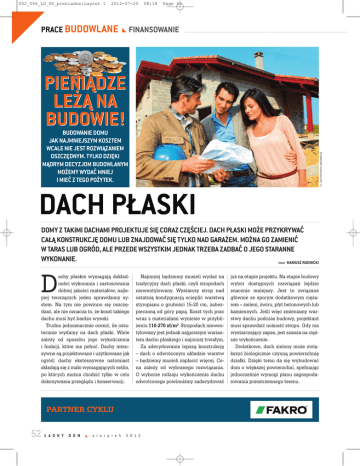 052_056_LD_08_pieniadze:Layout 1 2012-07-20 PRACE BUDOWLANE 08:18 Page 52 FINANSOWANIE FOT.: SHUTTERSTOCK.COM/GOODLUZ BUDOWANIE DOMU JAK NAJMNIEJSZYM KOSZTEM WCALE NIE JEST ROZWIĄZANIEM OSZCZĘDNYM. TYLKO DZIĘKI MĄDRYM DECYZJOM BUDOWLANYM MOŻEMY WYDAĆ MNIEJ I MIEĆ Z TEGO POŻYTEK. DACH PŁASKI DOMY Z TAKIMI DACHAMI PROJEKTUJE SIĘ CORAZ CZĘŚCIEJ. DACH PŁASKI MOŻE PRZYKRYWAĆ CAŁĄ KONSTRUKCJĘ DOMU LUB ZNAJDOWAĆ SIĘ TYLKO NAD GARAŻEM. MOŻNA GO ZAMIENIĆ W TARAS LUB OGRÓD, ALE PRZEDE WSZYSTKIM JEDNAK TRZEBA ZADBAĆ O JEGO STARANNE WYKONANIE. MARIUSZ RUDNICKI TEKST D achy płaskie wymagają dokład- Najmniej będziemy musieli wydać na już na etapie projektu. Na etapie budowy ności wykonania i zastosowania tradycyjny dach płaski, czyli stropodach wybór dostępnych rozwiązań będzie dobrej jakości materiałów, najle- niewentylowany. Wystarczy strop nad znacznie mniejszy. Jest to związane piej tworzących jeden sprawdzony sy- ostatnią kondygnacją ocieplić warstwą głównie ze sporym dodatkowym cięża- stem. Na tym nie powinno się oszczę- styropianu o grubości 15-20 cm, zabez- rem – zieleni, żwiru, płyt betonowych lub dzać, ale nie oznacza to, że koszt takiego pieczoną od góry papą. Koszt tych prac kamiennych. Jeśli więc zmieniamy war- dachu musi być bardzo wysoki. wraz z materiałami wyniesie w przybli- stwy dachu podczas budowy, projektant Trudno jednoznacznie ocenić, ile osta- żeniu 110-270 zł/m2. Stropodach niewen- musi sprawdzić nośność stropu. Gdy ma tecznie wydamy na dach płaski. Wiele tylowany jest jednak najgorszym warian- wystarczający zapas, jest szansa na cięż- zależy od sposobu jego wykończenia tem dachu płaskiego i najmniej trwałym. sze wykończenie. i funkcji, które ma pełnić. Dachy inten- Za zdecydowanie lepszą konstrukcję Dodatkowo, dach zielony może zwię- sywne są projektowane i użytkowane jak – dach o odwróconym układzie warstw kszyć biologicznie czynną powierzchnię ogród; dachy ekstensywne natomiast – będziemy musieli zapłacić więcej. Ce- działki. Dzięki temu da się wybudować składają się z mało wymagających roślin, na zależy od wybranego rozwiązania. dom o większej powierzchni, spełniając po których można chodzić tylko w celu O wyborze rodzaju wykończenia dachu jednocześnie wymogi planu zagospoda- dokonywania przeglądu i konserwacji. odwróconego powinniśmy zadecydować rowania przestrzennego terenu. PARTNER CYKLU 52 Ł A D N Y D O M s i e r p i e ń 2 0 1 2 052_056_LD_08_pieniadze:Layout 1 2012-07-20 08:18 Page 53 FINANSOWANIE PROJEKT DACHU ODWRÓCONEGO 1 KONSTRUKCJA DACHU O ODWRÓCONYM UKŁADZIE WARSTW Dachy odwrócone wymagają odpowiednio mocnej konstrukcji domu. Szczególnie dotyczy to nośności stropu, która jest istot- płyty kamienne lub betonowe na dla możliwości wyboru sposobu wykończenia. Warstwy dachów zielonych ekstensywnych mogą mieć ciężar wynoszący od około 70 kg/m² do nawet 200 kg/m². Planując warstwa żwiru dach z roślinnością intensywną, należy przewidzieć obciążenie rzędu 400 kg/m². warstwa filtrująca Jeśli decydujemy się na taras z elementami zieleni, warto skorzystać z oferty architekta krajobrazu. Zaprojektuje on termoizolacja (polistyren ekstrudowany) ogród, który będzie dostosowany do trudniejszych niż w natuKoszt projektu zależy od projektanta i stopnia skomplikowania wybranego wariantu odwróconego dachu płaskiego. Dla tarasu o powierzchni 50 m2 może wynieść od jednego do kilku ty- RYS.: ANNA UKIELSKA rze warunków. hydroizolacja warstwa lekkiego betonu z uformowanym spadkiem strop żelbetowy sięcy złotych. WARSTWY IZOLACYJNE Standardowym rozwiązaniem pokrycia dachu płaskiego o od- Izolacja termiczna. Jest ona narażona na długotrwałe i bez- wróconym układzie, jest wykonanie termoizolacji na warstwie pośrednie działanie wody. Dlatego straty ciepła przez dach pła- przeciwwilgociowej, ułożonej bezpośrednio na stropie. W ten ski ogranicza się poprzez zastosowanie grubszej o 20% war- sposób chronimy izolację przeciwwilgociową przed uszkodze- stwy izolacji termicznej niż przy stropodachu tradycyjnym. Poza niami i działaniem szkodliwych czynników atmosferycznych, tym nie można wykonać ocieplenia, jak w dachach stromych, zwłaszcza zmian temperatury. Dzięki temu znacznie skutecz- z wełny mineralnej w welonie lub styropianu EPS 200 (przezna- niej zabezpiecza ona dach przed przeciekaniem. czonego na podłogi w garażach), lecz ze znacznie droższego po- Izolacja przeciwwilgociowa. To na niej należy skupić najwię- listyrenu ekstrudowanego (80-90 zł/m2 przy grubości 20 cm). kszą uwagę. Dotyczy to zarówno materiału, jak i ekipy wyko- Płyty polistyrenu ekstrudowanego są bardzo lekkie, więc po- nawczej. Choć mamy do dyspozycji bardzo wiele materiałów, datne na porywy wiatru, zwłaszcza w strefach brzegowych. Ko- to na tę warstwę nadają się jedynie papy termozgrzewalne nieczny jest więc balast. Jako dociążenie stosuje się najczęściej i membrany kauczukowe (EPDM). Za dwie warstwy dobrej ja- żwir, ale można też wykonać warstwy tarasowe albo system kości papy zapłacimy 40-48 zł/m2, natomiast za membranę dachu zielonego. – 45--70 zł/m2. Koszt. Cena wykonania dachu odwróconego zależy od jego Po wykonaniu izolacji, a przed ułożeniem kolejnych warstw, powierzchni i kształtu. Zwykle za ułożenie tylko izolacji prze- powinno się sprawdzić szczelność dachu, wykonując próbę ciwwilgociowej i termicznej trzeba zapłacić 35-110 zł/m2. Do wodną. Odcina się odpływ, a następnie zalewa dach wodą do wykonania pokrycia najlepiej zatrudnić doświadczoną ekipę z referencjami. Wykonywanie pokrycia we własnym zakresie lub przecieka, plama wilgoci będzie widoczna na spodzie stropu do- przez przypadkowych, nieznających się na rzeczy wykonaw- kładnie pod nieszczelnością. ców, najczęściej kończy się drogimi naprawami w przyszłości. 1 Próba szczelno