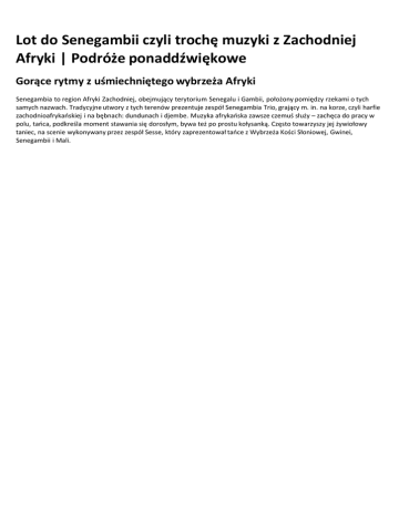 Lot do Senegambii czyli trochę muzyki z Zachodniej Afryki | Podróże ponaddźwiękowe Gorące rytmy z uśmiechniętego wybrzeża Afryki Senegambia to region Afryki Zachodniej, obejmujący terytorium Senegalu i Gambii, położony pomiędzy rzekami o tych samych nazwach. Tradycyjne utwory z tych terenów prezentuje zespół Senegambia Trio, grający m. in. na korze, czyli harfie zachodnioafrykańskiej i na bębnach: dundunach i djembe. Muzyka afrykańska zawsze czemuś służy – zachęca do pracy w polu, tańca, podkreśla moment stawania się dorosłym, bywa też po prostu kołysanką. Często towarzyszy jej żywiołowy taniec, na scenie wykonywany przez zespół Sesse, który zaprezentował tańce z Wybrzeża Kości Słoniowej, Gwinei, Senegambii i Mali.