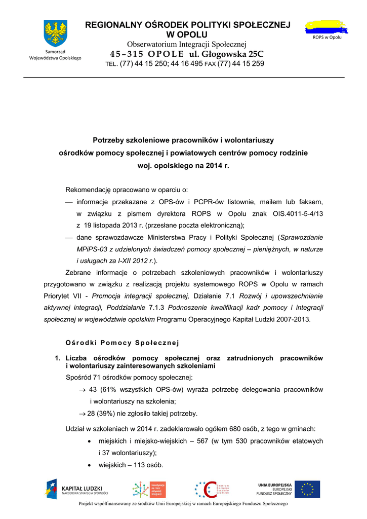 REGIONALNY OŚRODEK POLITYKI SPOŁECZNEJ W OPOLU [Wpisz tekst] Obserwatorium Integracji Społecznej ROPS w Opolu 4 5 – 3 1 5 O P O L E ul. Głogowska 25C Samorząd Województwa Opolskiego TEL. (77) 44 15 250; 44 16 495 FAX (77) 44 15 259 Potrzeby szkoleniowe pracowników i wolontariuszy ośrodków pomocy społecznej i powiatowych centrów pomocy rodzinie woj. opolskiego na 2014 r. Rekomendację opracowano w oparciu o: informacje przekazane z OPS-ów i PCPR-ów listownie, mailem lub faksem, w związku z pismem dyrektora ROPS w Opolu znak OIS.4011-5-4/13 z 19 listopada 2013 r. (przesłane poczta elektroniczną); dane sprawozdawcze Ministerstwa Pracy i Polityki Społecznej (Sprawozdanie MPiPS-03 z udzielonych świadczeń pomocy społecznej – pieniężnych, w naturze i usługach za I-XII 2012 r.). Zebrane informacje o potrzebach szkoleniowych pracowników i wolontariuszy przygotowano w związku z realizacją projektu systemowego ROPS w Opolu w ramach Priorytet VII - Promocja integracji społecznej, Działanie 7.1 Rozwój i upowszechnianie aktywnej integracji, Poddziałanie 7.1.3 Podnoszenie kwalifikacji kadr pomocy i integracji społecznej w województwie opolskim Programu Operacyjnego Kapitał Ludzki 2007-2013. Ośrodki Pomocy Społecznej 1. Liczba ośrodków pomocy społecznej oraz zatrudnionych pracowników i wolontariuszy zainteresowanych szkoleniami Spośród 71 ośrodków pomocy społecznej: 43 (61% wszystkich OPS-ów) wyraża potrzebę delegowania pracowników i wolontariuszy na szkolenia; 28 (39%) nie zgłosiło takiej potrzeby. Udział w szkoleniach w 2014 r. zadeklarowało ogółem 680 osób, z tego w gminach: miejskich i miejsko-wiejskich – 567 (w tym 530 pracowników etatowych i 37 wolontariuszy); wiejskich – 113 osób. Projekt współfinansowany ze środków Unii Europejskiej w ramach Europejskiego Funduszu Społecznego 2 Tabela 1. Pracownicy ośrodków pomocy społecznej woj. opolskiego zainteresowani uczestnictwem w szkoleniach w 2014 r. Zatrudnienie w OPS w 2012 r.- liczba osób ogółem Wyszczególnienie Lp. 1. Gminy miejskie i miejsko-wiejskie 2. Gminy wiejskie Razem Liczba pracowników i wolontariuszy OPS zainteresowana uczestnictwem w szkoleniach w 2014 r. Ogółem % 1 025 567 55,3 270 113 41,9 1 295 680 52,5 Udział pracowników ośrodków pomocy społecznej (łącznie z wolontariuszami) wyrażających chęć uczestnictwa w szkoleniach w 2014 r. w stosunku do wszystkich zatrudnionych w 2012 r. wynosi 52,5%, przy czym zainteresowanie szkoleniami jest większe w gminach miejskich i miejsko-wiejskich (55,3%) niż w gminach wiejskich (41,9%). Wykres 1. Udział pracowników OPS zainteresowanych szkoleniami w 2014 r. w ogólnej liczbie zatrudnionych w 2012 r. (w proc.) 2. Liczba uczestników szkoleń wg stanowisk Spośród 643 pracowników etatowych OPS wyrażających chęć uczestnictwa w szkoleniach: 299 to pracownicy socjalni; 83 - inni pracownicy merytoryczni zatrudnieni w jednostce (kierownicy działów, klubów integracji społecznej, inspektorzy, koordynatorzy projektów realizowanych przez placówkę, asystenci rodziny, terapeuci, opiekunowie, psycholodzy, pracownicy zespołów interdyscyplinarnych); Projekt współfinansowany ze środków Unii Europejskiej w ramach Europejskiego Funduszu Społecznego 3 210 - pozostali pracownicy (informatycy, referenci, pracownicy działu świadczeń rodzinnych i Funduszu Alimentacyjnego, dodatków mieszkaniowych), w tym 68 głównych księgowych i księgowych; 51 - dyrektorzy i kierownicy OPS oraz ich zastępcy. Tabela 2. Pracownicy ośrodków pomocy społecznej zainteresowani uczestnictwem w szkoleniach w 2014 r. wg zajmowanych stanowisk Lp. Zatrudnienie na stanowisku w OPS w 2012 r.- liczba osób ogółem * Stanowisko Liczba pracowników OPS zainteresowana uczestnictwem w szkoleniach w 2014 r. Ogółem % 1. Pracownik socjalny 455 299 65,7 2. Inni pracownicy merytoryczni (kierownik działu, KIS, asystenci rodziny inspektor, koordynator, terapeuta, opiekunka, psycholog) 225 83 36,9 4. Dyrektor/kierownik, z-ca dyrektora/kierownika 86 51 59,3 5. Główny księgowy/księgowy oraz pozostali pracownicy (informatyk, referenci, pracownicy działu świadczeń rodzinnych i Funduszu Alimentacyjnego) ** 529 210 39,7 1 295 643 49,7 Razem * liczba osób w OPS bez względu na liczbę etatów wg Sprawozdania MPiPS-03 z udzielonych świadczeń pomocy społecznej w 2012 r. ** w sprawozdawczości MPiPS brak szczegółowych danych o liczbie zatrudnionych głównych księgowych/księgowych w OPS Wykres 2. Pracownicy OPS zainteresowani szkoleniami w 2014 r. według zajmowanych stanowisk (w proc. do liczby zatrudnionych ogółem) Projekt współfinansowany ze środków Unii Europejskiej w ramach Europejskiego Funduszu Społecznego 4 Spośród osób zatrudnionych w ośrodkach pomocy społecznej według zajmowanych stanowisk, prawie połowa (49,7%) wyraziła potrzebę udziału w szkoleniach. Najliczniejszą grupą zainteresowaną szkoleniami są pracownicy merytoryczni: pracownicy socjalni (66%) oraz pracownicy klubów, ośrodków wsparcia, dziennych domów pomocy, asystenci rodziny itp. – 36,9%. Kolejną grupą jest kadra kierownicza OPS – prawie 60% spośród wszystkich kierowników i dyrektorów OPS zgłosiło potrzebę szkolenia. Wśród pozostałych pracowników zatrudnionych w jednostkach, w tym głównych księgowych oraz innych pracowników księgowości i kadr, chęć uczestnictwa w szkoleniach wyraża prawie 40% osób. 3. Wolontariusze – planowana liczba uczestników i tematyka szkoleń Spośród wszystkich ośrodków pomocy społecznej woj. opolskiego kilka jednostek zaplanowało objęcie szkoleniami ogółem 37 wolontariuszy. Są to: Brzeg – 10 osób, Nysa – 25 osób oraz Dobrodzień i Gorzów Śląski – po 1 osobie. Tematyka szkoleń winna obejmować: metody pracy z dziećmi; opiekę nad osobami starszymi; pierwszą pomoc; pracę w grupie; budowanie społeczności lokalnej. 4. Tematyka szkoleń – pracownicy OPS Problematyk