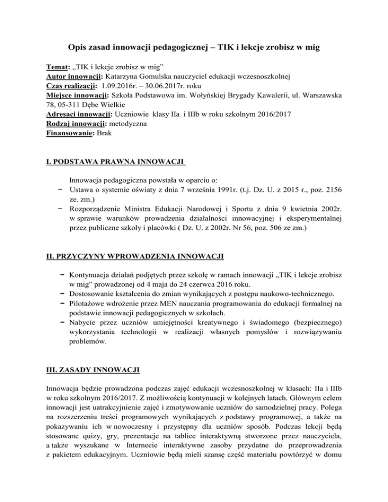Opis zasad innowacji pedagogicznej – TIK i lekcje zrobisz w mig Temat: „TIK i lekcje zrobisz w mig” Autor innowacji: Katarzyna Gomulska nauczyciel edukacji wczesnoszkolnej Czas realizacji: 1.09.2016r. – 30.06.2017r. roku Miejsce innowacji: Szkoła Podstawowa im. Wołyńskiej Brygady Kawalerii, ul. Warszawska 78, 05-311 Dębe Wielkie Adresaci innowacji: Uczniowie klasy IIa i IIIb w roku szkolnym 2016/2017 Rodzaj innowacji: metodyczna Finansowanie: Brak I. PODSTAWA PRAWNA INNOWACJI Innowacja pedagogiczna powstała w oparciu o: − Ustawa o systemie oświaty z dnia 7 września 1991r. (t.j. Dz. U. z 2015 r., poz. 2156 ze. zm.) − Rozporządzenie Ministra Edukacji Narodowej i Sportu z dnia 9 kwietnia 2002r. w sprawie warunków prowadzenia działalności innowacyjnej i eksperymentalnej przez publiczne szkoły i placówki ( Dz. U. z 2002r. Nr 56, poz. 506 ze zm.) II. PRZYCZYNY WPROWADZENIA INNOWACJI − Kontynuacja działań podjętych przez szkołę w ramach innowacji „TIK i lekcje zrobisz w mig” prowadzonej od 4 maja do 24 czerwca 2016 roku. − Dostosowanie kształcenia do zmian wynikających z postępu naukowo-technicznego. − Pilotażowe wdrożenie przez MEN nauczania programowania do edukacji formalnej na podstawie innowacji pedagogicznych w szkołach. − Nabycie przez uczniów umiejętności kreatywnego i świadomego (bezpiecznego) wykorzystania technologii w realizacji własnych pomysłów i rozwiązywaniu problemów. III. ZASADY INNOWACJI Innowacja będzie prowadzona podczas zajęć edukacji wczesnoszkolnej w klasach: IIa i IIIb w roku szkolnym 2016/2017. Z możliwością kontynuacji w kolejnych latach. Głównym celem innowacji jest uatrakcyjnienie zajęć i zmotywowanie uczniów do samodzielnej pracy. Polega na rozszerzeniu treści programowych wynikających z podstawy programowej, a także na pokazywaniu ich w nowoczesny i przystępny dla uczniów sposób. Podczas lekcji będą stosowane quizy, gry, prezentacje na tablice interaktywną stworzone przez nauczyciela, a także wyszukane w Internecie interaktywne zasoby przydatne do przeprowadzenia z pakietem edukacyjnym. Uczniowie będą mieli szansę część materiału powtórzyć w domu grając w gry edukacyjne stworzone na platformie Zondle, czy też obejrzeć dodatkowe materiały udostępnione w sieci przez nauczyciela. Wcześniej nauczyciel nie mógł dzieciom udostępnić wszystkich aplikacji i gier, gdyż często były uaktywniane po wpisaniu kodu, który był przypisany nauczycielowi korzystającemu z danego pakietu edukacyjnego. Cześć z zastosowanych gier (np. „Blockly Games”) będą przygotowywały dzieci do samodzielnego programowania i tworzenia programów. Na ogół praca domowa jest dla dzieci przykrym obowiązkiem, której wykonanie sprawia wiele problemów, a jej rezultat jest oceniany dopiero po spotkaniu z nauczycielem. W przypadku zastosowania technologii informacyjnych uczeń może wykonywać prace domową, która będzie dla niego przyjemną zabawą, a efekt wykonania może zostać oceniony automatycznie po zakończeniu gry, czy też quizu. Dzięki temu proces oceniania jest bardziej przyjazny i kształtujący dla ucznia. W przypadku małych dzieci ocenianie prac domowych zadanych dzień wcześniej bywa często tylko komunikatem i nie skłania dziecka do refleksji nad popełnionymi błędami. Wykorzystując interaktywne gry edukacyjne dziecko często otrzymuje od razu lub po skończeniu gry informację zwrotną, że źle wykonało dane zadanie. Nauczyciel w ustawieniach gry czy quizu może narzucić by o błędnie zaznaczone treści spytać powtórnie, tak by nauczyć dziecko poprawnego rozwiązania. Dzięki czemu dziecko nie tylko poznaje zdobytą liczbę punktów, ale także ma szansę poćwiczyć materiał, który został źle utrwalony. Gry tworzone przez nauczyciela mogą być dobrym przygotowaniem i zachętą dla uczniów do tworzenia własnych programów. Uczniowie podczas innowacji będą ćwiczyli umiejętność logicznego myślenia i precyzyjnego prezentowanie myśli i pomysłów, które są bardzo istotne w informatyce. Podczas zajęć z edukacji komputerowej uczniowie będą wykorzystywali program Scratch 2.0 jako darmowego narzędzia do edytowania grafiki, tworzenia prezentacji, animacji poklatkowych oraz nauki podstaw programowania.W trakcie realizacji innowacji będąwykorzystywane scenariusze programistyczne stworzone w ramach programu Mistrzowie Kodowania i udostępnione na wolnej licencji (CC BY-SA) na stronie http://wiki.mistrzowiekodowania.pl/. Jednakże nie wpłynie to na zmianę programu nauczania. Będą to treści nadprogramowe. IV. ZAKRES NOWATORSTWA INNOWACJI O nowatorstwie innowacji świadczy między innymi: − Zastosowanie tablicy interaktywnej, uczniowskich komputerów, tabletów i smartfonów oraz zasobów mobilnych aplikacji edukacyjnych w procesie wspomagania wszechstronnego kształcenia uczniów. − Organizacja procesu kształcenia z wykorzystaniem elementów dydaktyki cyfrowej: nauczanie wyprzedzające, flippedclassroom, kształcenie problemowe, kształcenie hybrydowe, gamifikacja, wykorzystanie zasobów Internetu, itd. − Organizacja nauczania z wykorzystaniem zasobów platform edukacyjnych np. Zondle, Scholaris, Edmondo, Memorizer, LearningApps.org. − − − Wykorzystanie metody tutoringu. Wprowadzeniu do programu zajęć komputerowych języka programowania Scratch 2.0. jako edytora tekstu, grafiki, narzędzia do tworzenia prezentacji oraz sterowania obiektem po ekranie. Wyposażenie uczniów w umiejętności posługiwania się algorytmami nie tylko na lekcjach zajęć komputerowych. V. CELE OGÓLNE INNOWACJI Celem innowacji jest realizowanie procesu kształcenia poprzez wprowadzenie dzieci w świat technologii komunikacyjno-informacyjnych. Nabycie przez uczniów umiejętności wykorzystania edukacyjnych zasobów internetowych dostosowanych do ich wieku. Wsparcie procesu uczenia się dzieci poprzez gry i zasoby interaktywne ogólnodostępne w sieci i st