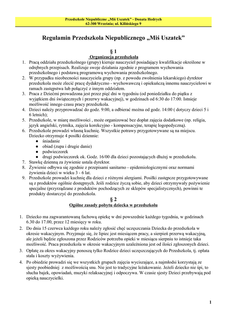 Przedszkole Niepubliczne „Miś Uszatek” - Donata Hedrych 62-300 Września; ul. Kilińskiego 9 Regulamin Przedszkola Niepublicznego „Miś Uszatek” §1 Organizacja przedszkola 1. Pracą oddziału przedszkolnego (grupy) kieruje nauczyciel posiadający kwalifikacje określone w odrębnych przepisach. Realizuje swoje działania zgodnie z programem wychowania przedszkolnego i podstawą programową wychowania przedszkolnego. 2. W przypadku nieobecności nauczyciela grupy (np. z powodu zwolnienia lekarskiego) dyrektor przedszkola może zlecić pracę dydaktyczno - wychowawczą i opiekuńczą innemu nauczycielowi w ramach zastępstwa lub połączyć z innym oddziałem. 3. Praca z Dziećmi prowadzona jest przez pięć dni w tygodniu (od poniedziałku do piątku z wyjątkiem dni świątecznych i przerwy wakacyjnej), w godzinach od 6:30 do 17:00. Istnieje możliwość innego czasu pracy przedszkola. 4. Dzieci należy przyprowadzać do godz. 9:00, a odbierać można od godz. 14:00 ( dotyczy dzieci 5 i 6 letnich); 5. Przedszkole, w miarę możliwości , może organizować bez dopłat zajęcia dodatkowe (np. religia, język angielski, rytmika, zajęcia korekcyjno - kompensacyjne, terapię logopedyczną). 6. Przedszkole prowadzi własną kuchnię. Wszystkie potrawy przygotowywane są na miejscu. Dziecko otrzymuje 4 posiłki dziennie: śniadanie obiad (zupa i drugie danie) podwieczorek drugi podwieczorek ok. Godz. 16/00 dla dzieci pozostających dłużej w przedszkolu. 7. Stawkę dzienną za żywienie ustala dyrektor. 8. Żywienie odbywa się zgodnie z przepisami sanitarno - epidemiologicznymi oraz normami żywienia dzieci w wieku 3 - 6 lat. 9. Przedszkole prowadzi kuchnię dla dzieci z różnymi alergiami. Posiłki zastępcze przygotowywane są z produktów ogólnie dostępnych. Jeśli rodzice życzą sobie, aby dzieci otrzymywały pożywienie specjalne (przyrządzane z produktów pochodzących ze sklepów specjalistycznych), powinni te produkty dostarczyć do przedszkola. §2 Ogólne zasady pobytu dziecka w przedszkolu 1. Dziecko ma zagwarantowaną fachową opiekę w dni powszednie każdego tygodnia, w godzinach 6.30 do 17.00, przez 12 miesięcy w roku. 2. Do dnia 15 czerwca każdego roku należy zgłosić chęć uczęszczania Dziecka do przedszkola w okresie wakacyjnym. Przyjmuje się, że lipiec jest miesiącem pracy, a sierpień przerwą wakacyjną, ale jeżeli będzie zgłoszona przez Rodziców potrzeba opieki w miesiącu sierpniu to istnieje taka możliwość. Praca przedszkola w okresie wakacyjnym uzależniona jest od ilości zgłoszonych dzieci. 3. Opłatę za okres wakacyjny ponoszą tylko Rodzice dzieci uczęszczających do Przedszkola, tj. opłata stała i koszty wyżywienia. 4. Po obiedzie prowadzi się we wszystkich grupach zajęcia wyciszające, a najmłodsi korzystają ze sjesty poobiedniej z możliwością snu. Nie jest to tradycyjne leżakowanie. Jeżeli dziecko nie śpi, to słucha bajek, opowiadań, muzyki relaksacyjnej i odpoczywa. W czasie sjesty Dzieci przebywają pod opieką nauczycielki. 1 Przedszkole Niepubliczne „Miś Uszatek” - Donata Hedrych 62-300 Września; ul. Kilińskiego 9 5. Po przyprowadzeniu Dziecka do przedszkola należy wprowadzić je do sali, w której odbywają się zajęcia, aby nauczyciel mógł wpisać obecność w danym dniu, a Rodzic był pewien, że dziecko jest pod opieką nauczyciela. 6. Dzieci mogą być odbierane tylko przez rodziców (opiekunów), bądź inne osoby, które zostały wpisane do karty zgłoszenia dziecka do przedszkola, bądź po uprzednim osobistym powiadomieniu przedszkola o zmianie osoby odbierającej dziecko. Osobom w stanie wskazującym na spożycie alkoholu nie wydajemy dziecka z przedszkola. 7. Warunkiem przyjęcia dziecka do przedszkola w danym dniu jest jego dobry stan zdrowia. Jeżeli u dziecka stwierdzony zostanie stan podgorączkowy lub jego samopoczucie będzie wskazywało na stan chorobowy rodzice zobowiązani są do zabrania dziecka z przedszkola. 8. Dzieci nie mogą przynosić do przedszkola i spożywać w sali słodyczy, gum do żucia i chipsów. Dopuszczalne są słodycze pod warunkiem, że są zorganizowane dla całej grupy. 9. Do przedszkola dzieci mogą przynosić swoje zabawki w jeden wyznaczony dzień tygodnia. 10. Rodzice ponoszą koszty za obowiązkowe grupowe ubezpieczenie dziecka. Opłata na ubezpieczenie pobierana jest we wrześniu. Szczegółowe informacje dotyczące ubezpieczyciela zostaną podane do wiadomości rodziców (opiekunów) na zebraniach z rodzicami we wrześniu każdego roku. 11. Rodzice ponoszą koszty związane z transportem dzieci na wycieczki i różnego typu wyjazdy autokarowe, bilety wstępu. 12. Przedszkole wyposaża dzieci we wszystkie potrzebne im do wszechstronnego rozwoju pomoce, przybory, artykuły papiernicze i higieniczne, składkę na przybory ustala każdego roku dyrektor , płatna jest ona w dwóch ratach – na początku – we wrześniu i w połowie roku szkolnego – w lutym. 13. Rodzice mają obowiązek przestrzegać postanowień statutu. §3 1. 2. 3. 4. 5. 6. 7. Przedszkole a zdrowie dziecka Przedszkole nie prowadzi opieki medycznej. Odpowiedzialność za wykonanie w odpowiednim terminie wszelkich zabiegów i procesów medycznych związanych ze zdrowiem dzieci między innymi szczepień ochronnych spoczywa na rodzicach. Obowiązkiem rodziców jest przyprowadzenie do przedszkola dzieci zdrowych. Nie przyprowadzamy dzieci, które: mają katar, kaszel, gorączkę (nie dotyczy alergii), są przeziębione lub chore, są w trakcie leczenia antybiotykowego, mają inne objawy, które mają znamiona przeziębienia lub choroby. Nie praktykujemy podawania dzieciom typowych leków przynoszonych z domu; podajemy wyłącznie, za pisemnym upoważnieniem rodziców i alergologa oraz za zgodą dyrekcji przedszkola, leki na alergie. W przypadku kataru i kaszlu alergicznego rodzice zobowiązani są przedstawić stosowne zaświadczenie od lekarza alergologa z wyszczególnieniem rodzaju 