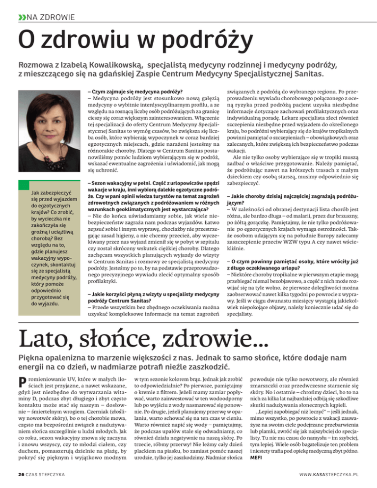 na zdrowie O zdrowiu w podróży Rozmowa z Izabelą Kowalikowską, specjalistą medycyny rodzinnej i medycyny podróży, z mieszczącego się na gdańskiej Zaspie Centrum Medycyny Specjalistycznej Sanitas. – Czym zajmuje się medycyna podróży? – Medycyna podróży jest stosunkowo nową gałęzią medycyny o wybitnie interdyscyplinarnym profilu, a ze względu na rosnącą liczbę osób podróżujących za granicę cieszy się coraz większym zainteresowaniem. Włączenie tej specjalizacji do oferty Centrum Medycyny Specjali‑ stycznej Sanitas to wymóg czasów, bo zwiększa się licz‑ ba osób, które wybierają wypoczynek w coraz bardziej egzotycznych miejscach, gdzie narażeni jesteśmy na różnorakie choroby. Dlatego w Centrum Sanitas posta‑ nowiliśmy pomóc ludziom wybierającym się w podróż, wskazać ewentualne zagrożenia i uświadomić, jak mogą się uchronić. Jak zabezpieczyć się przed wyjazdem do egzotycznych krajów? Co zrobić, by wycieczka nie zakończyła się groźną i uciążliwą chorobą? Bez względu na to, gdzie planujesz wakacyjny wypoczynek, skontaktuj się ze specjalistą medycyny podróży, który pomoże odpowiednio przygotować się do wyjazdu. – Sezon wakacyjny w pełni. Część z urlopowiczów spędzi wakacje w kraju, inni wybiorą dalekie egzotyczne podróże. Czy w pani opinii wiedza turystów na temat zagrożeń zdrowotnych związanych z podróżowaniem w różnych warunkach geoklimatycznych jest wystarczająca? – Nie do końca uświadamiamy sobie, jak wiele nie‑ bezpieczeństw zagraża nam podczas wyjazdów. Łatwo zepsuć sobie i innym wyprawę, chociażby nie przestrze‑ gając zasad higieny, a nie chcemy przecież, aby wycze‑ kiwany przez nas wyjazd zmienił się w pobyt w szpitalu czy został skrócony wskutek ciężkiej choroby. Dlatego zachęcam wszystkich planujących wyjazdy do wizyty w Centrum Sanitas i rozmowy ze specjalistą medycyny podróży. Jesteśmy po to, by na podstawie przeprowadzo‑ nego precyzyjnego wywiadu zlecić optymalny sposób profilaktyki. – Jakie korzyści płyną z wizyty u specjalisty medycyny podróży Centrum Sanitas? – Przede wszystkim bez zbędnego oczekiwania można uzyskać kompleksowe informacje na temat zagrożeń związanych z podróżą do wybranego regionu. Po prze‑ prowadzeniu wywiadu chorobowego połączonego z oce‑ ną ryzyka przed podróżą pacjent uzyska niezbędne informacje dotyczące zachowań profilaktycznych oraz indywidualną poradę. Lekarz specjalista zleci również szczepienia niezbędne przed wyjazdem do określonego kraju, bo podróżni wybierający się do krajów tropikalnych powinni pamiętać o szczepieniach – obowiązkowych oraz zalecanych, które zwiększą ich bezpieczeństwo podczas wakacji. Ale nie tylko osoby wybierające się w tropiki muszą zadbać o właściwe przygotowanie. Należy pamiętać, że podróżując nawet na krótszych trasach z małym dzieckiem czy osobą starszą, musimy odpowiednio się zabezpieczyć. – Jakie choroby dzisiaj najczęściej zagrażają podróżującym? – W zależności od obranej destynacji lista chorób jest różna, ale bardzo długa – od malarii, przez dur brzuszny, po żółtą gorączkę. Pamiętajmy, że nie tylko podróżowa‑ nie po egzotycznych krajach wymaga ostrożności. Tak‑ że osobom udającym się na południe Europy zalecamy zaszczepienie przeciw WZW typu A czy nawet wście‑ kliźnie. – O czym powinny pamiętać osoby, które wróciły już z długo oczekiwanego urlopu? – Niektóre choroby tropikalne w pierwszym etapie mogą przebiegać niemal bezobjawowo, a część z nich może roz‑ wijać się na tyle wolno, że pierwsze dolegliwości można zaobserwować nawet kilka tygodni po powrocie z wypra‑ wy. Jeśli w ciągu dwunastu miesięcy wystąpią jakiekol‑ wiek niepokojące objawy, należy koniecznie udać się do specjalisty. Lato, słońce, zdrowie... Piękna opalenizna to marzenie większości z nas. Jednak to samo słońce, które dodaje nam energii na co dzień, w nadmiarze potrafi nieźle zaszkodzić. P romieniowanie UV, które w małych ilo‑ ściach jest przyjazne, a nawet wskazane, gdyż jest niezbędne do wytwarzania wita‑ miny D, podczas zbyt długiego i zbyt często kontaktu może stać się naszym – dosłow‑ nie – śmiertelnym wrogiem. Czerniak (złośli‑ wy nowotwór skóry), bo o tej chorobie mowa, często ma bezpośredni związek z nadużywa‑ niem słońca szczególnie u ludzi młodych. Jak co roku, sezon wakacyjny znowu się zaczyna i znowu wszyscy, czy to młodzi ciałem, czy duchem, pomaszerują dzielnie na plażę, by pokryć się pięknym i wyjątkowo modnym 26 c zas stefc z yk a w tym sezonie kolorem brąz. Jednak jak zrobić to odpowiedzialnie? Po pierwsze, pamiętajmy o kremie z filtrem. Jeżeli mamy zamiar popły‑ wać, warto zainwestować w ten wodoodporny lub po wyjściu z wody nasmarować się ponow‑ nie. Po drugie, jeżeli planujemy przerwę w opa‑ laniu, warto schować się na ten czas w cieniu. Warto również napić się wody – pamiętajmy, że podczas upałów stale się odwadniamy, co również działa negatywnie na naszą skórę. Po trzecie, róbmy przerwy! Nie leżmy cały dzień plackiem na piasku, bo zamiast pomóc naszej urodzie, tylko jej zaszkodzimy. Nadmiar słońca powoduje nie tylko nowotwory, ale również zmarszczki oraz przedwczesne starzenie się skóry. No i ostatnie – chrońmy dzieci, bo to na nich za kilka lat najbardziej odbiją się szkodliwe skutki nadużywania słonecznych kąpieli. ,,Lepiej zapobiegać niż leczyć” – jeśli jednak, mimo wszystko, po powrocie z wakacji zauwa‑ żysz na swoim ciele podejrzane przebarwienia lub plamki, zwróć się jak najszybciej do specja‑ listy. Tu nie ma czasu do namysłu – im szybciej, tym lepiej. Wiele osób bagatelizuje ten problem i niestety trafia pod opiekę medyczną zbyt późno. Mefi www.k asastefc z yk a.pl