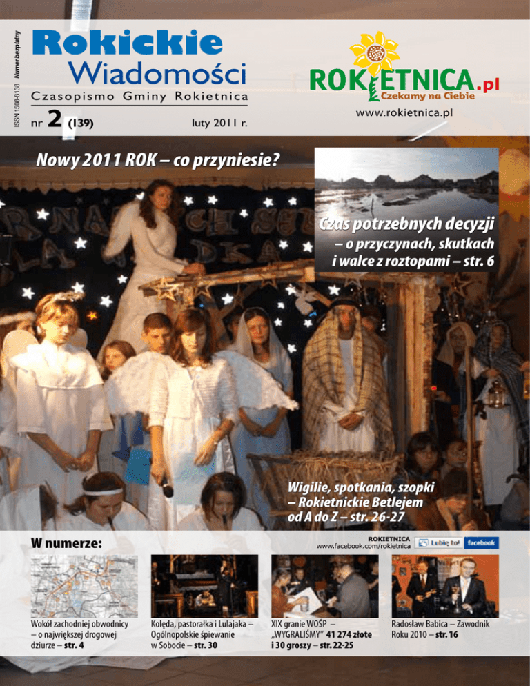 ISSN 1508-8138 Numer bezpłatny Rokickie Wiadomości Czasopismo Gminy Rokietnica nr 2 (139) www.rokietnica.pl luty 2011 r. Nowy 2011 ROK – co przyniesie? Czas potrzebnych decyzji – o przyczynach, skutkach i walce z roztopami – str. 6 Wigilie, spotkania, szopki – Rokietnickie Betlejem od A do Z – str. 26-27 W numerze: Wokół zachodniej obwodnicy – o największej drogowej dziurze – str. 4 ROKIETNICA www.facebook.com/rokietnica Kolęda, pastorałka i Lulajaka – Ogólnopolskie śpiewanie w Sobocie – str. 30 XIX granie WOŚP – „WYGRALIŚMY” 41 274 złote i 30 groszy – str. 22-25 Radosław Babica – Zawodnik Roku 2010 – str. 16 Drodzy Czytelnicy! Rozważanie o czasie jest refleksją etapową. Ma swój początek, nacechowany dynamizmem, snuciem planów oraz swój koniec, skłaniający do podsumowań. Ów finał zdarzeń - nieubłagalny, nie dający się podporządkować narzuconym regułom, czy próbom manipulacji, tylko wybranym przynosi ukojenie i zadowolenie. Większość z nas nerwowo chciałaby cofnąć czas, by – mimo świadomości nieuniknionej kolei rzeczy – móc zmienić podjęte decyzje i wypowiedziane słowa, naprawiając lub przynajmniej korygując ich skutek. Nie znasz dnia, ani godziny – brzmi jak przestroga i wyrok. Ta nieodwracalna konstatacja nie musi jednak wcale być przeciwieństwem nadziei. Koniec bowiem - na szczęście - nie zawsze musi oznaczać ostateczność. Przychodzi bowiem nowy czas, dający przede wszystkim szansę na skorygowanie, stanowiące efekt dokonanych podsumowań. Jaki więc był mijający rok i czego nas nauczył? Zawsze subiektywnej odpowiedzi nie wolno nazwać zgeneralizowanym wnioskiem. Nie mniej jednak zdecydowanie był to czas uczący pokory - wobec niedających się podporządkować prawom natury i ich nieodwracalnym skutkom. Powódź, która wielu zabrała wszystko burząc wiarę w możliwość zaplanowania ustabilizowanego jutra, tragedia Smoleńska symbolicznie łącząca historię z teraźniejszością, wybuch z pozoru niegroźnego wulkanu na Islandii paraliżującego złudnie doskonały i technicznie niezależny światowy porządek, to aż nadto wymowne przykłady, stanowiące przestrogę przed wyniosłą pyszałkowatością. Był to też czas moralnych dylematów: bitwa o krzyż przed warszawskim pałacem prezydenckim, list księdza Wiśniewskiego, wizyta kapłana u chorego generała Jaruzelskiego. Ich pozorna otwartość i dyskusyjność powinna być przede wszystkim nauką wiary w niepodważalność imponderabiliów. Był to Recital wreszcie czas wielkich rocznic i wydarzeń, które trwale zjednoczyć powinny ciągle Fortepianowy rozbity naród – 30 lat „Solidarności”, 20 lat samorządnej niezależności, Rok Chopina. Jacka Kortusa Czy dzięki nim wyszliśmy silniejsi? Budując jutro, z przestrogą minionego roku pokory, starajmy się, by nie była nim mityczna wieża Babel. Niełatwo żyć bowiem w otoczeniu „swoich”, którzy mówią pomieszanymi językami. Danuta Potrawiak Redaktor Naczelny „Rokickich Wiadomości” „Chopin na BIS” NASZE PATRONATY: 20.02.2011 r. – niedziela, godzina 16.00 Kościół p.w. Podwyższenia Krzyża Świętego w Cerekwicy, ul. Szamotulska 12 Honorowy patronat: Wójt Gminy Rokietnica Patronat medialny: wstęp wolny 28 stycznia 2011 r. godz. 19.00 Klub Sołecki Mrowino-Cerekwica - koncert Orkiestry Rozrywkowo - Tanecznej „Polonia Band” pt. „Rytmy świata”. Organizator: GOK w Rokietnicy i sołectwo Mrowino-Cerekwica. Wstęp wolny. 11 lutego 2011 r., godz. 17.00, sala Gminnego Ośrodka Kultury w Rokietnicy. Wykład „Senegal – mój kraj rodzinny. Przegląd kulturalno – historyczny” wygłosi prof. Uniwersytetu Przyrodniczego, Wiceprzewodniczącego Rady Gminy Rokietnica Jean Diatta. Wykład ma charakter otwarty, Akademia Wieku Dostojnego w Rokietnicy zaprasza wszystkich chętnych. Wstęp wolny. 20 lutego 2011 r., godz. 16.00, Kościół p.w. Podwyższenia Krzyża Świętego w Cerekwicy – Recital Fortepianowy Jacka Kortusa pt. „CHOPIN na BIS”. Patronat Wójta Gminy Rokietnica; organizator: Urząd Gminy w Rokietnicy i Parafia Podwyższenia Krzyża Świętego w Cerekwicy. Współpraca: GOK Rokietnica. Wstęp wolny Rokickie Wiadomości Wydawca: Gmina Rokietnica Adres: ul. Golęcińska 1, 62-090 Rokietnica, tel 61-89-60-614 Redaktor naczelny: Danuta Potrawiak zaprasza codziennie w godzinach pracy Urzędu Gminy Zespół redakcyjny: Ryszard Lubka, Katarzyna Filipowiak-Łuczyńska, Anna Skrzypiec Współpraca: Stanisław Florian Sikorski, Krystyna Semba, Grażyna Głowacka, Maria Matuszczak, Małgorzata Musielak, Kamila Tobolska, Anna Skrzypiec, Katarzyna Filipowiak-Łuczyńska, Lidia Zastróżna, Agnieszka Antczak, Anna Garbicz, Sylwia Kiejnich, Maria Chojnacka, Róża Lubka, Piotr Hałas, Ilona Głyda, Magdalena Grygorowicz, Małgorzata Sklepik, Magdalena Dziel-Sierszuła, Małgorzata Remlein, Andrzej Deckert, Michał Kujawa, Jakub Bździuch, Daniel Przybył, Weronika Geremek, Małgorzata Przynoga, Elżbieta Skrzypczak, Katarzyna Piechalak, Bogdana Krajewska Rokickie Wiadomości – luty 2011 Redakcja zastrzega sobie prawo do skrótu i opracowywania materiałów. Za treść reklam i ogłoszeń redakcja nie odpowiada. Skład, ogłoszenia, druk: Studio KWADRAT tel.: 607 566 555, fax: 61 648 26 49, email: [email protected] Nakład: 4000 egzemplarzy Numer zamknięto: 19.12.2010 Propozycje artykułów: Danuta Potrawiak, Urząd Gminy, pok. nr 16 e-mail: [email protected] oraz [email protected] Materiały do numeru 3/2011 prosimy dostarczyć do 11.02.2011. Zachęcamy i zapraszamy do współredagowania naszego pisma. 3 PROSTO Z URZĘDU Wokół zachodniej obwodnicy Poznania. Gmina Rokietnica składa wniosek w Ministerstwie Infrastruktury o rozpoczęcie budowy 5,5 km odcinka IIb przed rokiem 2013. Bartosz Derech Wójt gminy Rokietnica 21 grudnia 2010 r. Ministerstwo Infrastruktury ogłosiło informację na temat planu rzeczowo-finansowego Krajowego Funduszu D