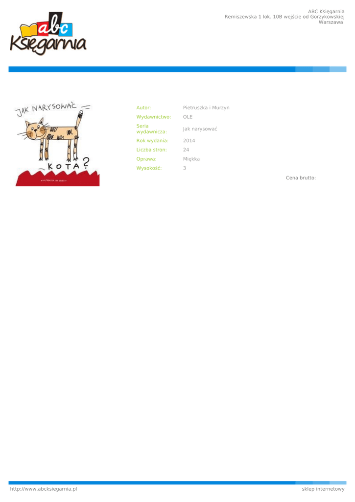 ABC Księgarnia Remiszewska 1 lok. 10B wejście od Gorzykowskiej Warszawa Autor: Pietruszka i Murzyn Wydawnictwo: OLE Seria wydawnicza: Jak narysować Rok wydania: 2014 Liczba stron: 24 Oprawa: Miękka Wysokość: 3 Cena brutto: http://www.abcksiegarnia.pl sklep internetowy