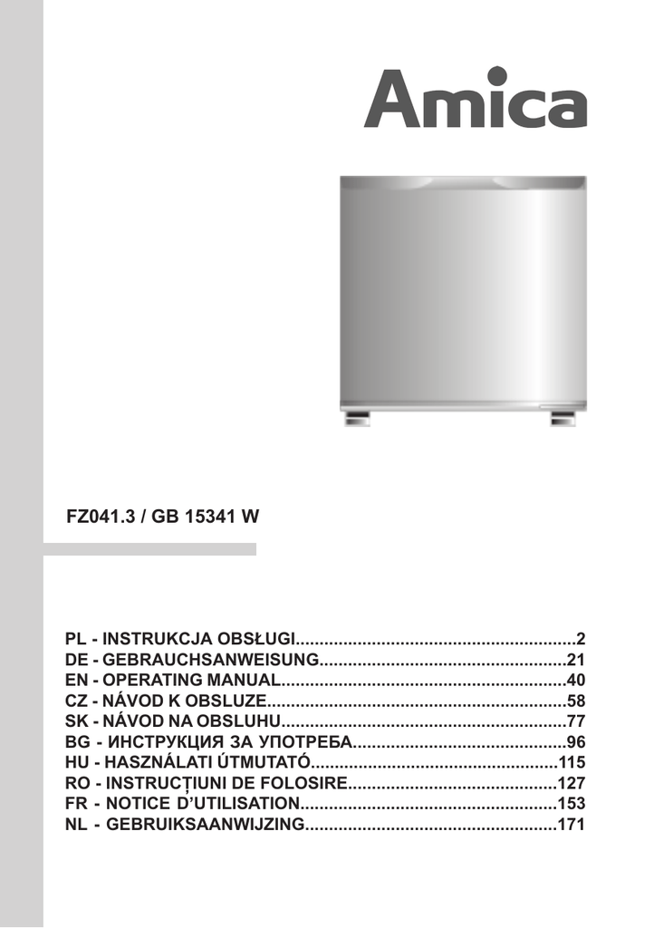 FZ041.3 / GB 15341 W PL - INSTRUKCJA OBSŁUGI...........................................................2 DE - GEBRAUCHSANWEISUNG....................................................21 EN - OPERATING MANUAL............................................................40 CZ - NÁVOD K OBSLUZE...............................................................58 SK - NÁVOD NA OBSLUHU............................................................77 BG - ИНСТРУКЦИЯ ЗА УПОТРЕБА.............................................96 HU - HASZNÁLATI ÚTMUTATÓ....................................................115 RO - INSTRUCŢIUNI DE FOLOSIRE............................................127 FR - NOTICE D’UTILISATION......................................................153 NL - GEBRUIKSAANWIJZING.....................................................171 INFORMACJE OGÓLNE PL Szanowni Państwo, Zamrażarka Amica to połączenie wyjątkowej łatwości obsługi i doskonałej efektywności. Każde urządzenie przed opuszczeniem fabryki zostało dokładnie sprawdzone pod względem bezpieczeństwa i funkcjonalności. Prosimy Państwa o uważną lekturę instrukcji obsługi przed uruchomieniem urządzenia. Uwaga! Zamrażarka przeznaczona jest wyłącznie do użytku domowego. Producent zastrzega sobie możliwość dokonywania zmian nie wpływających na działanie urządzenia. Dopuszczalne są zmiany w wyposażeniu, wystroju wewnętrznym i zewnętrznym wyrobu, nie wpływające na jego funkcjonalność i bezpieczeństwo. Masz wątpliwości? Nie wszystko, co przeczytałeś w instrukcji jest zrozumiałe - zadzwoń do Centrum Serwisowego, gdzie uzyskasz wszechstronną pomoc. tel.0-801 801 800 2 SPIS TREŚCI Budowa i wyposażenie urządzenia..............................................................................................4 Wskazówki dotyczące bezpieczeństwa użytkowania..................................................................5 Zamiana kierunku otwierania drzwi.............................................................................................9 Obsluga i funkcje........................................................................................................................11 Jak ekonomicznie użytkować lodówkę......................................................................................13 Odszranianie, mycie i konserwacja...........................................................................................14 Lokalizacja usterek....................................................................................................................15 Ochrona środowiska..................................................................................................................17 Charakterystyka techniczna.......................................................................................................18 3 BUDOWA I WYPOSAŻENIE URZĄDZENIA model FZ041.3 / GB 15341 W półka druciana nóżki umożliwiające regulację 4 WSKAZÓWKI DOTYCZĄCE BEZPIECZEŃSTWA UŻYTKOWANIA l Zamrażarki nie należy przechylać o więcej niż 40° od pionu pod czas transportu, przenoszenia lub ustawiania. Jeżeli taka sytuacja zaistniała włączenie urządzenia może nastąpić min. po 2 godzi nach od jego ustawienia (rys. 1). l Producent nie ponosi odpowiedzial ności za szkody wynikłe z nieprze strzegania zasad umieszczonych w niniejszej instrukcji. l Prosimy o zachowanie tej in strukcji w celu wykorzystania jej w przys złoś ci lub przekazania ewentualnemu następnemu użytkownikowi. l Niniejszy sprzęt nie jest przeznaczony do użytkowania przez osoby (w tym dzieci) o ograniczonej zdolności fizycznej, czuciowej lub psychicznej oraz osoby o braku doświadczenia lub znajomości sprzętu, chyba, że odbywa się to pod nadzorem lub zgodnie z instrukcją użytkowania sprzętu, przekazanej przez osoby odpowiadające za ich bezpieczeństwo. l Należy zwrócić szczególną uwagę, aby z urządzenia nie korzystały pozostawione bez opieki dzieci. Nie należy pozwalać im bawić się urządzeniem. Nie wolno im siadać na elementach wysuwanych i zawieszać się na drzwiach. lPodczas ustawiania, przesuwania, podnoszenia nie należy chwytać za uchwyty drzwi, ciągnąć za skraplacz z tyłu lodówki oraz dotykać zespołu kompresora. lWyrób pracuje prawidłowo w temperaturze otoczenia N-ST. Nie należy użytkować jej w piwnicy, sieni, w nieogrzewanym domku letniskowym jesienią i zimą. lNie używaj urządzenia, jeżeli wykazuje ono jakiekolwiek oznaki uszkodzenia przewodu przyłączeniowego. lZamrażarka jest urządzeniem wykonanym w I klasie ochrony przciwporażeniowej. 1 l Przed każdą czynnością kons er wac yjn ą należy wyjąć wtyczkę z gniazdka sieciowego. Nie należy ciągnąć za przewód, lecz chwytać za korpus wtyczki. l Dźwięki słyszalne jako trzaskanie lub pękanie są spowodowane przez rozszerzanie i kurczenie się części na skutek zmian temperatury. l Ze względu na bezpieczeństwo nie należy nap raw iać urządzenia we własnym zakresie. Naprawy, wyko nywane przez osoby nie posiadające wymaganych kwalifikacji mogą stanowić poważne niebezpieczeństwo dla użytkownika urządzenia. 5 WSKAZÓWKI DOTYCZĄCE BEZPIECZEŃSTWA UŻYTKOWANIA l W przypadku uszkodzenia układu chłodniczego należy przewietrzyć przez kilkanaście minut pomieszczenie, w którym znajduje się urządzenie. Wyrób zawiera naturalny gaz izobutan (R600a). l Trzymaj opakowanie po urządzeniu z dala od dzieci, Może się ono dla nich okazać niebezpieczne. l Nie próbuj usuwać żadnych części korpusu. l Produktów choćby tylko częściowo rozmrożonych nie można ponownie zamrażać. l Należy uważać, aby nie uszkodzić obiegu chłodniczego, np. przez nakłucie kanałów środka chłodniczego w parowniku, złamanie rur. Wytryskujący czynnik chłodniczy jest palny. W przypadku dostania się do oczu należy przepłukać je czystą wodą i wezwać natychmiast lekarza. l Prz