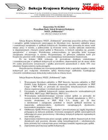Sekcja Krajowa Kolejarzy 03-734 Warszawa, ul. Targowa 74, tel./fax: 22 619 89 85, tel. kolejowy: 922 473 32 09, 473 25 05, fax kolejowy: 922 473 38 41 e-mail: [email protected] strona internetowa: www.skk.org.pl Konto bankowe: PKO BP IV/O Warszawa 71 1020 1042 0000 8502 0009 8582 Stanowisko Nr 01/2015 Prezydium Rady Sekcji Krajowej Kolejarzy NSZZ „Solidarność” ws. obecnej sytuacji na kolei Sekcja Krajowa Kolejarzy NSZZ „Solidarność” protestuje przeciwko polityce Rządu i zarządów spółek kolejowych zmierzającej do likwidacji (tzw. łączenie) zakładów pracy i centralizacji zarządzania w spółkach kolejowych. Działania takie prowadzą do utraty setek miejsc pracy w terenie, a jednocześnie są tworzone nowe, wysoko opłacane stanowiska w departamentach i biurach central spółek w Warszawie, w których zatrudnia się „pseudospecjalistów” z zewnątrz. Wielokrotnie wskazywaliśmy, że specyfika kolei wymaga zarządzania obszarowego w terenie. Przypominamy, że głównym zadaniem kolei jest bezpieczny przewóz osób i ładunków, a nie manipulacja instrumentami finansowymi. Po raz kolejny SKK wskazuje, że prowadzone działania centralizujące i restrukturyzacyjne w spółkach kolejowych są szkodliwe, doprowadziły już do utraty około 5% rynku przewozów towarowych i spadku przewozów pasażerskich o około 10% oraz obniżenie bezpieczeństwa ruchu pociągów. Dotychczasowe działania nie rozwiązują problemów kolei a sprzedaż majątku i spółek kolejowych jest wyłącznie elementem spłaty historycznego zadłużenia wynikającego z kosztów restrukturyzacji, którą kolej realizowała na własny koszt. Sekcja Krajowa Kolejarzy NSZZ „Solidarność” żąda: 1. 2. 3. 4. 5. 6. Wstrzymania likwidacji zakładów w PKP Intercity, łączenia zakładów w PKP Polskie Linie Kolejowe, wdrażania pionowego sposobu zarządzania w PKP Cargo i PKP PLK, co prowadzi do zniszczenia dotychczasowych struktur, chaosu organizacyjnego i zwolnień pracowników. Utrzymania w spółkach kolejowych statusu pracodawców wielozakładowych (PKP PLK, PKP Cargo, PKP Intercity, PKP S.A.). Wstrzymania niekontrolowanego rozrostu central spółek co prowadzi do wzrostu kosztów zarządzania (w PKP S.A. w Centrali zatrudnienie w 2013 r. wzrosło dwukrotnie, w PKP PLK S.A. działa już 28 biur z dyrektorami i zastępcami, podobnie w innych spółkach mnożone są stanowiska pełnomocników, dyrektorów zarządzających, dyrektorów, kierowników projektów i inne). Oddłużenia Spółki Przewozy Regionalne i powstrzymania jej ciągłej degradacji polegającej na dalszym podziale, tworzeniu następnych spółek samorządowych odbierających prace przewozową i likwidację kolejnych połączeń regionalnych oraz miejsc pracy. Zaprzestania transferowania przez zarządy spółek środków finansowych do firm doradczych pod pozorem zlecania usług konsultingowych i szkoleniowych, które powinny być wykonywane przez istniejące komórki organizacyjne spółek. Zaprzestania prywatyzacji spółek kolejowych. 7. 8. 9. 10. Zaprzestanie w PKP CARGO S.A. zastraszania pracowników i kierowania ich na nieświadczenia pracy w sytuacji, gdy Spółka przynosi zysk i nie ogranicza swoich zadań oraz przywrócenia do pracy tych pracowników, którzy aktualnie przebywają na nieświadczeniu pracy. Nie wydzielania do innych podmiotów zaplecza warsztatowego PKP CARGO S.A. oraz innych elementów działalności tej Spółki gdyż spowoduje to utratę wielu miejsc pracy. Zaprzestania dalszej wymiany kadr kolejowych, na osoby z innych branż, często z nadania polityczno – towarzyskiego, nie znających specyfiki kolejowej, ślepo wdrażających metody zarządzania, które na kolei się nie sprawdzają. Poszanowania przez zarządy spółek praw pracowniczych, przestrzegania trybu opiniowania i uzgadniania ze związkami zawodowymi spraw określonych w ogólnych przepisach, wewnętrznych porozumień zawartych w spółkach oraz ustaleń zespołu trójstronnego ds. kolejnictwa, w zakresie zawarcia Paktów Gwarancji Pracowniczych przed prywatyzacją spółki (TK Telekom). W celu realizacji naszych postulatów domagamy się podjęcia pilnych rozmów z Panią Premier. Zabiegamy o to, gdyż – naszym zdaniem – Polska Kolej za kilka miesięcy znajdzie się w tej samej sytuacji, w jakiej obecnie jest Polskie Górnictwo. Chcemy, by wybrzmiało to bardzo wyraźnie w bezpośredniej rozmowie z szefem Rządu RP. W przypadku braku ich realizacji podejmiemy dalsze działania protestacyjno-strajkowe. Warszawa, 13 stycznia 2015 r.