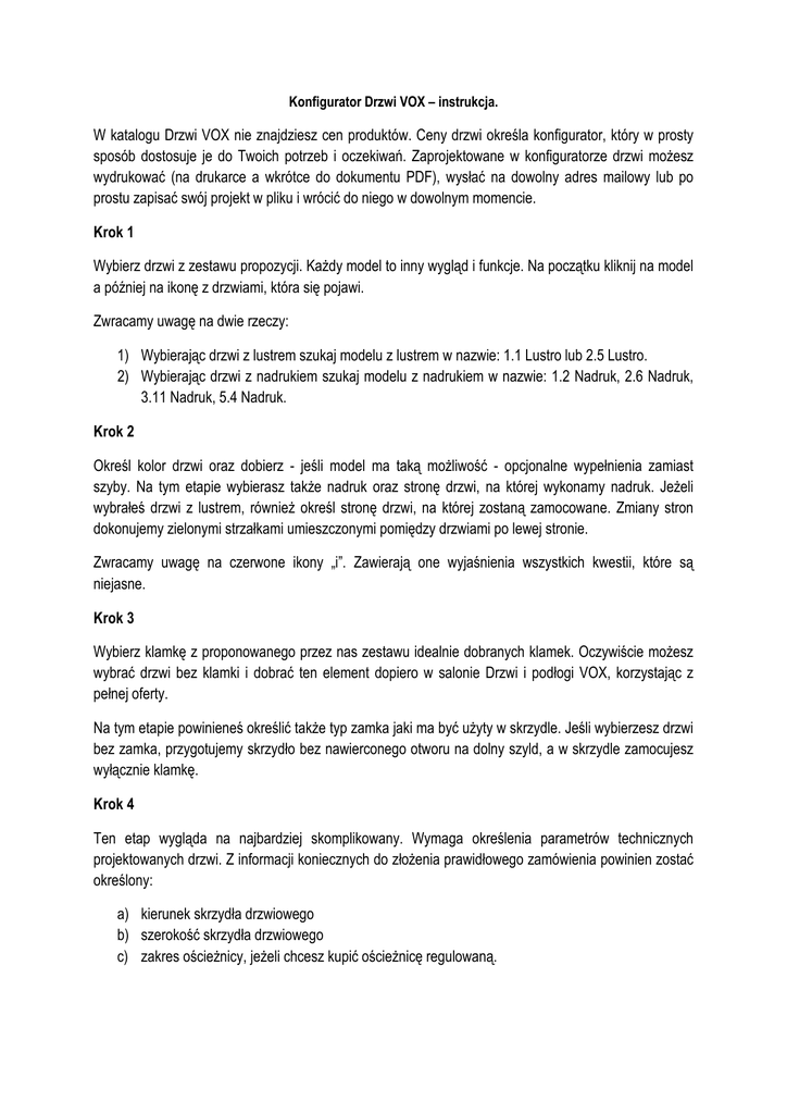 Konfigurator Drzwi VOX – instrukcja. W katalogu Drzwi VOX nie znajdziesz cen produktów. Ceny drzwi określa konfigurator, który w prosty sposób dostosuje je do Twoich potrzeb i oczekiwań. Zaprojektowane w konfiguratorze drzwi możesz wydrukować (na drukarce a wkrótce do dokumentu PDF), wysłać na dowolny adres mailowy lub po prostu zapisać swój projekt w pliku i wrócić do niego w dowolnym momencie. Krok 1 Wybierz drzwi z zestawu propozycji. Każdy model to inny wygląd i funkcje. Na początku kliknij na model a później na ikonę z drzwiami, która się pojawi. Zwracamy uwagę na dwie rzeczy: 1) Wybierając drzwi z lustrem szukaj modelu z lustrem w nazwie: 1.1 Lustro lub 2.5 Lustro. 2) Wybierając drzwi z nadrukiem szukaj modelu z nadrukiem w nazwie: 1.2 Nadruk, 2.6 Nadruk, 3.11 Nadruk, 5.4 Nadruk. Krok 2 Określ kolor drzwi oraz dobierz - jeśli model ma taką możliwość - opcjonalne wypełnienia zamiast szyby. Na tym etapie wybierasz także nadruk oraz stronę drzwi, na której wykonamy nadruk. Jeżeli wybrałeś drzwi z lustrem, również określ stronę drzwi, na której zostaną zamocowane. Zmiany stron dokonujemy zielonymi strzałkami umieszczonymi pomiędzy drzwiami po lewej stronie. Zwracamy uwagę na czerwone ikony „i”. Zawierają one wyjaśnienia wszystkich kwestii, które są niejasne. Krok 3 Wybierz klamkę z proponowanego przez nas zestawu idealnie dobranych klamek. Oczywiście możesz wybrać drzwi bez klamki i dobrać ten element dopiero w salonie Drzwi i podłogi VOX, korzystając z pełnej oferty. Na tym etapie powinieneś określić także typ zamka jaki ma być użyty w skrzydle. Jeśli wybierzesz drzwi bez zamka, przygotujemy skrzydło bez nawierconego otworu na dolny szyld, a w skrzydle zamocujesz wyłącznie klamkę. Krok 4 Ten etap wygląda na najbardziej skomplikowany. Wymaga określenia parametrów technicznych projektowanych drzwi. Z informacji koniecznych do złożenia prawidłowego zamówienia powinien zostać określony: a) kierunek skrzydła drzwiowego b) szerokość skrzydła drzwiowego c) zakres ościeżnicy, jeżeli chcesz kupić ościeżnicę regulowaną. Aby określić bezbłędnie powyższe parametry polecamy skorzystanie z pomocy Certyfikowanych Montażystów współpracujących z siecią Drzwi i podłogi VOX lub z partnerami sieci Drzwi i podłogi VOX, którzy dokonają bezpłatnego pomiaru w mieszkaniu klienta, w przypadku finalizacji zamówienia. Konfigurator będzie przypominał o konieczności wypełnienia wszystkich danych i uniemożliwi wysłanie zamówienia do realizacji bez kompletnych danych. Na tym etapie możesz skorzystać z opcji menu bocznego takich jak „zapisz” oraz „wczytaj”, aby po dokonanym pomiarze uzupełnić brakujące dane. Ostatnie trzy elementy do konfiguracji w tym kroku to dodatkowy zawias, podcięcie wentylacyjne do drzwi łazienkowych oraz kolor zawiasów. Niektóre modele drzwi w standardzie mają zaznaczony trzeci zawias z uwagi na wagę skrzydła. W tych modelach nie ma możliwości zamówienia skrzydła drzwiowego z dwoma zawiasami, z powodu ograniczeń technicznych. Krok 5 Ostatni etap konfiguracji umożliwia dodanie do zaprojektowanych drzwi fantastycznych funkcjonalności dostępnych wyłącznie w Drzwiach VOX takich jak szyna na akcesoria, tablica magnetyczna czy wejście dla kota. Wszystko jest tak zaprojektowane, aby nie umieszczać powyższych rozwiązań w drzwiach niemożliwych do zamówienia. Opis wszystkich funkcji znajduje się na tym etapie konfiguratora, na głównej stronie konfiguratora www.drzwi.vox.pl oraz w katalogu. Aby zastosować dane rozwiązanie w drzwiach, należy przeciągnąć „ikonę” symbolizującą funkcję na podświetlone pole na drzwiach po lewej stronie ekranu. Nie ma możliwości zastosowania rozwiązania w innych miejscach drzwi niż zostało to wskazane w konfiguratorze. MENU BOCZNE (umieszone po lewej stronie w środku ekranu): Powiększenie – w każdym momencie możesz dokładniej obejrzeć zaprojektowane drzwi Zapisz – w każdej możesz zapisać konfigurację. Aby zapisać konfigurację musisz utworzyć dowolną nazwę oraz podać adres mailowy, na który ma ona zostać wysłana Wczytaj – dzięki tej opcji możesz wczytać wcześniej przygotowaną konfigurację. Aby wczytać wcześniej zapisaną konfigurację wpisz jej nazwę, która trafiła na podanego wcześniej maila np. Drzwi Łazienka_4f76c30b35194 Drukuj – wydruk dokonanej konfiguracji Zobacz w aranżacji – wybrane drzwi możesz zobaczyć w programie aranżacyjnym „Dobierz podłogi i drzwi”. Dzięki tej opcji do zaprojektowanych drzwi dobierzesz podłogę oraz kolor ściany. MENU DOLNE: Pokaż szczegóły – dzięki tej opcji możesz zobaczyć szczegóły dokonanego wyboru. Dodaj do koszyka – po zakończeniu konfiguracji drzwi dodajesz do koszyka zakupowego. Uwaga: do koszyka można dodać tylko w pełni skonfigurowany produkt. Muzą być wybrane także parametry techniczne. Pokaż koszyk – pokazuje wybrane drzwi. W każdej chwili możesz zmodyfikować swój wybór korzystając z przycisku „Edytuj”. Możesz zrezygnować z dokonanego wyboru używając przycisku „Usuń”. KUP – opcja dostępna tylko przy zakupie internetowym poprzez sklep www.drzwiipodlogi.vox.pl CENA Wszystkie ceny w konfiguratorze są cenami brutto. W zależności od dokonywanych wyborów cena ulega zmianie. Cena aktualizowana jest na bieżąco po każdym działaniu wpływającym na zmianę ceny wybranego produktu.