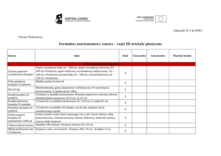 Załącznik Nr 3 do SIWZ Pieczęć Wykonawcy Formularz asortymentowy cenowy – część III artykuły plastyczne Nazwa Opis Artykuły plastyczne Augustów Papier rysunkowy biały A4 – 500 szt., papier rysunkowy kolorowy A4 400 szt. 8 kolorów, papier kolorowy wycinankowy nabłyszczany A3 – Zestaw papierów rysunkowych komplet 100 szt. 10 kolorów, brystol biały A3 – 100 szt., brystol kolorowy A4 – 100 szt. 10 kolorów Folia piankowa Miękka pianka format A4 komplet 15 kolorów Wielofunkcyjny, gęsty, bezpieczny i nietoksyczny. Po wyschnięciu Klej 0,5 kg przezroczysty. 5 opakowań po 100 g 24 kolory w pudełku kartonowym. Owinięte papierowa ochroną. Główny Kredki komplet 25 pudełek. składnik glinka kaolinowa. Dł. 8 cm , śr 0,7 cm Kredki ołówkowe 12 kolorów w pudełku kartonowym, dł. 17,8 cm, śr rysika 0,3 cm komplet 21 pudełek Plastelina komplet 25 12 kolorów w pudełku. Nie klejąca się do rąk, nadająca się do pudełek wielokrotnego użytku Farby na bazie wody, łatwo zmywające się z rąk i ubrań. Kolory: żółty, Farba tempera komplet 10 pomarańczowy, ciemnoczerwony, różowy, fioletowy, niebieski, zielony, pojemników 1000 ml czarny, biały, brązowy Tektura falista beżowa Komplet 100 arkuszy. Wymiary arkusza 25 x 35 cm Bibuła karbowana mix Krepina w rolce, mix kolorów. Wymiary 200 x 50 cm . Komplet 15 szt. 15 kolorów Ilość 1 1 1 1 1 1 1 1 2 Cena netto Cena brutto Wartość brutto Papier pakowy beżowy komplet 10 arkuszy Tektura falista mix 10 kolorów Ołówki trójkątne komplet 25 szt Zestaw pędzli komplet 30 szt Kubeczki na farby komplet 10 szt Krosno Papier pakowy wymiary 100 x 125 cm. 10 arkuszy format A4. MIX 10 kolorów ołówki trójkątne dł. 17,5 cm Różne rodzaje pędzli z naturalnego włosia o wielu wymiarach . Pędzle płaskie i okrągłe. kubeczki do farb. Przykrywka o specjalnym kształcie przytrzymuje pędzel i chroni farbę przed wylaniem. Wymiary 7 x 7 cm Drewniana rama do tkania. Wymiary 22 x 17 cm Artykułu plastyczne Czarna Papier rysunkowy biały A4 – 500 szt., papier rysunkowy kolorowy A4 400 szt. 8 kolorów, papier kolorowy wycinankowy nabłyszczany A3 – Zestaw papierów rysunkowych komplet 100 szt. 10 kolorów, brystol biały A3 – 100 szt., brystol kolorowy A4 – 100 szt. 10 kolorów Folia piankowa Miękka pianka format A4 komplet 15 kolorów Wielofunkcyjny, gęsty, bezpieczny i nietoksyczny. Po wyschnięciu Klej 0,5 kg przezroczysty. 5 opakowań po 100 g 24 kolory w pudełku kartonowym. Owinięte papierowa ochroną. Główny Kredki komplet 25 pudełek. składnik glinka kaolinowa. Dł. 8 cm , śr 0,7 cm Kredki ołówkowe 12 kolorów w pudełku kartonowym, dł. 17,8 cm, śr rysika 0,3 cm komplet 21 pudełek Plastelina komplet 25 12 kolorów w pudełku. Nie klejąca się do rąk, nadająca się do pudełek wielokrotnego użytku Farby na bazie wody, łatwo zmywające się z rąk i ubrań. Kolory: żółty, Farba tempera komplet 10 pomarańczowy, ciemnoczerwony, różowy, fioletowy, niebieski, zielony, pojemników 1000 ml czarny, biały, brązowy Tektura falista beżowa Komplet 100 arkuszy. Wymiary arkusza 25 x 35 cm Bibuła karbowana mix Krepina w rolce, mix kolorów. Wymiary 200 x 50 cm . Komplet 15 szt. 15 kolorów Papier pakowy Papier pakowy wymiary 100 x 125 cm. beżowy komplet 10 1 1 1 1 2 8 1 1 1 1 1 1 1 1 2 1 arkuszy Tektura falista mix 10 kolorów Ołówki trójkątne komplet 25 szt Zestaw pędzli komplet 30 szt Kubeczki na farby komplet 10 szt Sznurek z papieru komplet 5 kolorów Sznurek do nawlekania 10 arkuszy format A4. MIX 10 kolorów ołówki trójkątne dł. 17,5 cm Różne rodzaje pędzli z naturalnego włosia o wielu wymiarach . Pędzle płaskie i okrągłe. kubeczki do farb. Przykrywka o specjalnym kształcie przytrzymuje pędzel i chroni farbę przed wylaniem. Wymiary 7 x 7 cm Cienki, kolorowy sznurek z papieru do wykonywania dekoracji, wyplatania. Długość jednego koloru minimum 18 m. Sznurek do nawlekania w kolorze srebrnym dł. 20 m Piankowe literki w różnych kolorach minimum 150 szt. wysokość minimum 4,5 cm Piankowe cyferki w różnych kolorach minimum 150 szt. wysokość Piankowe cyferki minimum 4,5 cm Artykuły plastyczne Jaroszki Papier rysunkowy biały A4 – 500 szt., papier rysunkowy kolorowy A4 400 szt. 8 kolorów, papier kolorowy wycinankowy nabłyszczany A3 – Zestaw papierów rysunkowych komplet 100 szt. 10 kolorów, brystol biały A3 – 100 szt., brystol kolorowy A4 – 100 szt. 10 kolorów Folia piankowa Miękka pianka format A4 komplet 15 kolorów Wielofunkcyjny, gęsty, bezpieczny i nietoksyczny. Po wyschnięciu Klej 0,5 kg przezroczysty. 5 opakowań po 100 g 24 kolory w pudełku kartonowym. Owinięte papierowa ochroną. Główny Kredki komplet 25 pudełek. składnik glinka kaolinowa. Dł. 8 cm , śr 0,7 cm Kredki ołówkowe 12 kolorów w pudełku kartonowym, dł. 17,8 cm, śr rysika 0,3 cm komplet 21 pudełek Piankowe litery 1 1 1 2 2 1 1 1 1 1 1 1 1 12 kolorów w pudełku. Nie klejąca się do rąk, nadająca się do wielokrotnego użytku Plastelina komplet 25 pudełek Farby na bazie wody, łatwo zmywające się z rąk i ubrań. Kolory: żółty, pomarańczowy, ciemnoczerwony, różowy, fioletowy, niebieski, zielony, czarny, biały, brązowy Tektura falista beżowa Komplet 100 arkuszy. Wymiary arkusza 25 x 35 cm Bibuła karbowana mix Krepina w rolce, mix kolorów. Wymiary 200 x 50 cm . Komplet 15 szt. 15 kolorów Papier pakowy Papier pakowy wymiary 100 x 125 cm. beżowy komplet 10 arkuszy Tektura falista mix 10 10 arkuszy format A4. MIX 10 kolorów kolorów Ołówki trójkątne ołówki trójkątne dł. 17,5 cm komplet 25 szt Zestaw pędzli komplet Różne rodzaje pędzli z naturalnego włosia o wielu wymiarach . Pędzle 30 szt płaskie i okrągłe. kubeczki do farb. Przykrywka o specjalnym kształcie przytrzymuje Kubeczki na farby komplet 10 szt pędzel i chroni farbę przed wylaniem. Wymiary 7 x 7 cm Drewniana rama do tkania. Wymiary 22 x 17 cm Krosno Artykuły pla