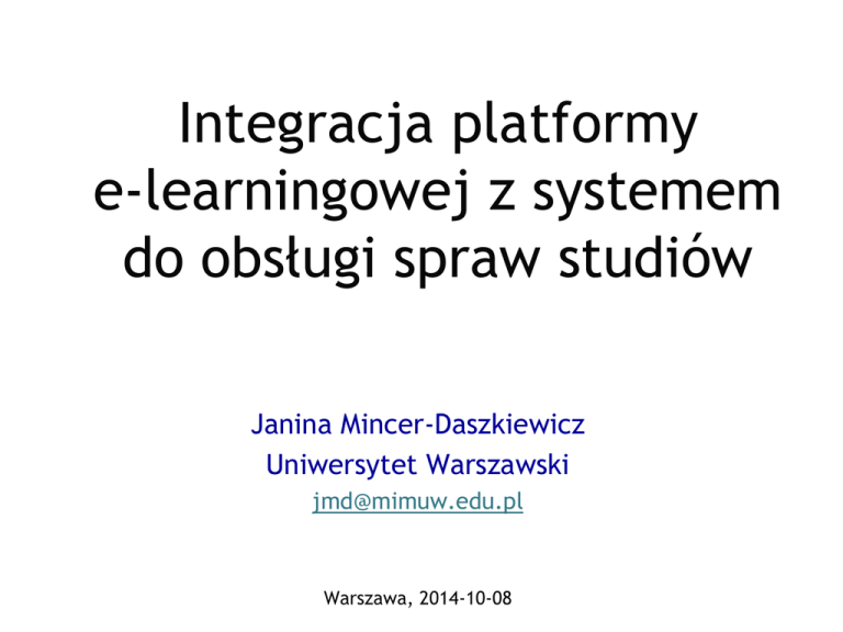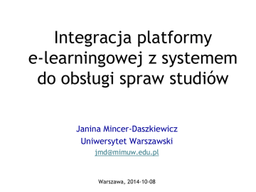 Integracja platformy e-learningowej z systemem do obsługi spraw studiów Janina Mincer-Daszkiewicz Uniwersytet Warszawski [email protected] Warszawa, 2014-10-08 Postawienie problemu Uczelnie korzystają z różnych systemów e-learningowych, zarówno dostępnych nieodpłatnie (jak Moodle), jak i komercyjnych. Zwykle system e-learningowy pochodzi od innego dostawcy niż system do obsługi spraw studiów. Tymczasem oba działają na wspólnym zbiorze danych. 1. 2. Dane studentów są dostępne w systemie uczelnianym, tam odbywają się zapisy na zajęcia i drukowanie kart egzaminacyjnych. W systemie e-learningowym studenci uczestniczą w zajęciach i otrzymują oceny. Właściwa integracja obu systemów, zapewniająca przepływ danych, jest koniecznością. Jako przykład posłuży rozwiązanie wdrożone na Uniwersytecie Warszawskim. 2 Plan prezentacji Moodle i USOS (Uniwersytecki System Obsługi Studiów) jako dwa różne systemy dziedzinowe używane na Uniwersytecie Warszawskim. Integracja poprzez migrację danych – wady i zalety USOS API – metody dostępu do danych w USOS Integracja za pomocą wtyczki do Moodle’a korzystającej z USOS API i Moodle API – wady i zalety 3 COME UW 1. 2. COME (Centrum Otwartej i Multimedialnej Edukacji) – jednostka UW odpowiedzialna za organizację kursów i utrzymywanie platformy e-learningowej Platforma e-learningowa UW 1. 2. 3. Na bazie Moodle (od 2004 roku). Utrzymywana przez informatyków COME (aktualizacja oprogramowania, doraźne usuwanie błędów, integracja z systemami uczelnianymi, bieżące wsparcie). Zintegrowana z Centralnym Systemem Uwierzytelniania (CAS) – tak jak wszystkie inne serwisy ogólnouczelniane UW. 5 COME UW Oferta 1. Szkolenie BHP 2. Szkolenie biblioteczne 3. Przedmioty ogólnouniwersyteckie 4. Języki obce 5. Kurs uzupełniający 0,5 punktu ECTS za zajęcia WF (dla osób ze zwolnieniami lekarskimi) 6. Testy poziomujące z języków obcych 7. Kursy otwarte – płatne 8. Wszystkie inne „normalne” kursy jednostek UW Niektóre jednostki UW utrzymują lokalne platformy e-learningowe (np. MIM) 6 USOS 1. 2. 3. 4. 5. System do obsługi spraw studiów będący własnością konsorcjum MUCI zrzeszającego ponad 40 polskich uczelni (w tym największe uniwersytety). Jedna centralna baza Oracle, aplikacja dla uczelnianej administracji i rodzina aplikacji webowych dla studentów i nauczycieli akademickich (USOSweb, UL, APD, SRS, Ankieter, Informator ECTS, EVA i inne). Migrator – narzędzie do synchronizacji bazy Oracle z lokalnymi bazami aplikacji webowych. USOS API – serwer i zestaw metod (API) dających dostęp do danych przechowywanych w bazie Oracle USOS. W tej prezentacji występuje jedynie jako przykład (problem integracji z Moodle czy inną platformą e-learningową wymaga rozwiązania niezależnie od używanego na uczelni systemu do obsługi toku studiów). 7 Moodle vs USOS 1. 2. 3. 4. 5. 6. 7. Kursy (przedmioty) są definiowane w USOS, otrzymują unikatowe kody. Sylabusy definiuje się w USOS lub USOSweb (opis, warunki zaliczenia, literatura, efekty kształcenia itp.). Prowadzących i protokoły definiuje się w USOS. Zapisy na zajęcia dla studentów i doktorantów odbywają się w USOSweb i UL. Zajęcia „odbywają się” na platformie e-learningowej (dostęp do materiałów, komunikacja prowadzących i uczestników, testy). Punktacja (oceny, wyniki testów poziomujących) powstają na platformie. Rozliczanie studentów odbywa się w USOS. Podwójne wprowadzanie danych nie jest akceptowalnym rozwiązaniem, konieczna jest integracja systemów. 8 Integracja Moodle – USOS 1. 2. 3. 4. Import opisu kursu – po „sparowaniu” kursu z Moodle z przedmiotem w USOS (po kodzie przedmiotu i cyklu dydaktycznym) można pobrać z USOS opis kursu. Import/synchronizacja grup studenckich i prowadzących przedmiot – po „sparowaniu” kursu z przedmiotem można pobrać z USOS listę prowadzących i studentów zapisanych na przedmiot w USOS. Protokół kursu – oceny studentów uzyskane w ramach kursu (oceny końcowe) są wysyłane do USOS. W Moodle'u dokonuje się konwersja z oceny Moodle'owej na ocenę USOS-ową wg skali ocen przypisanej do przedmiotu w USOS zgodnie z regułami określonymi przez prowadzącego. Testy poziomujące z języków obcych – niektóre quizy w Moodle'u są powiązane z USOS (wpisany jest kod testu). Ocena wysyłana jest do USOS. 9 Integracja Moodle – USOS 1. Aktualizacja ocen – dla wszystkich osób zapisanych 10 Integracja Moodle – USOS 2. Aktualizacja ocen – dla wybranych osób 11 Integracja poprzez migrację 1. 2. 3. 4. Migrator powstał w celu automatycznej synchronizacji danych między bazą Oracle a lokalnymi bazami aplikacji webowych. Okazał się wygodnym narzędziem do integracji USOS z innymi systemami funkcjonującymi na uczelni (np. ERP, biblioteka). Użyto migratora do synchronizacji danych między bazą USOS i bazą Moodle. Zalety 1. 5. Działa, jest proste w obsłudze, szybkie, nie wymaga żadnych dodatkowych opłat licencyjnych, nie wymaga zmian w migratorze (jedynie przygotowania pliku konfiguracyjnego mapującego tabele w obu bazach). Wady 1. 2. Synchronizacja odbywa się na żądanie kilka razy dziennie, ale czasem brak dostępu do najświeższych danych bywa kłopotliwy dla użytkowników. Moodle wymaga dostosowania do współpracy z migratorem (dziennik zmian), jest „wrażliwy” na zmiany w strukturze bazy USOS, aktualizacja Moodle do nowej wersji może wymagać zmian w kodzie. 12 Integracja poprzez USOS API 1. 2. 3. 4. USOS API to zestaw metod dających dostęp do danych w bazie USOS i serwer obsługujący wywołania tych metod. Z USOS API korzystają aplikacje webowe USOS, dzięki czemu ta sama funkcjonalność (np. definiowanie uprawnień do zdjęć użytkowników czy obsługa planów zajęć) wygląda tak samo w różnych aplikacjach i nie wymaga powielania kodu. Z USOS API mogą też korzystać zewnętrzni dostawcy oprogramowania, np. firmy dostarczające 
