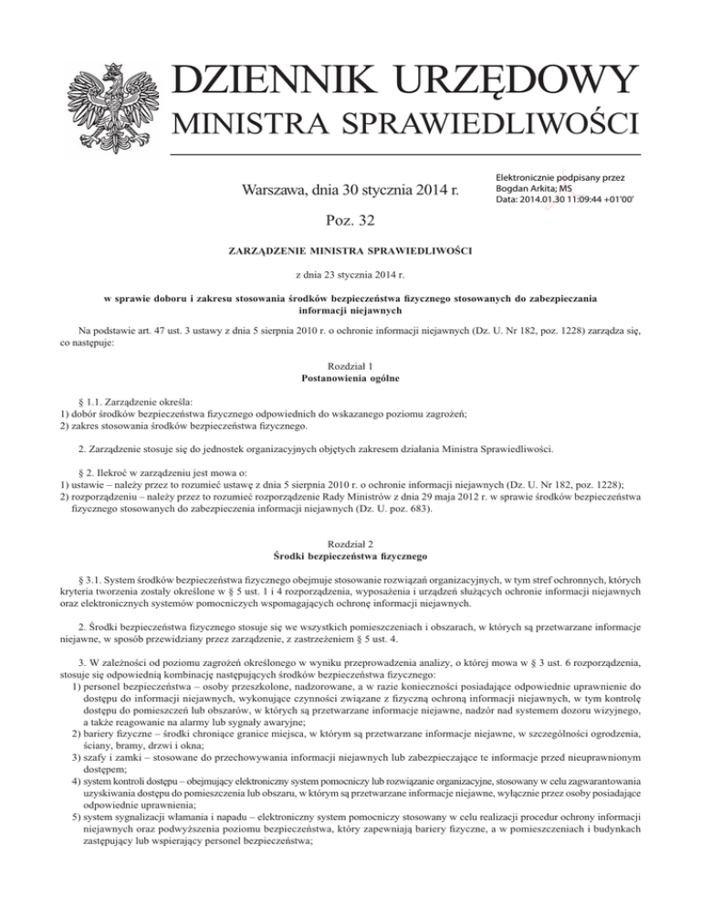 DZIENNIK URZĘDOWY MINISTRA SPRAWIEDLIWOŚCI Warszawa, dnia 30 stycznia 2014 r. Elektronicznie podpisany przez Bogdan Arkita; MS Data: 2014.01.30 11:09:44 +01'00' Poz. 32 ZARZĄDZENIE MINISTRA SPRAWIEDLIWOŚCI z dnia 23 stycznia 2014 r. w sprawie doboru i zakresu stosowania środków bezpieczeństwa fizycznego stosowanych do zabezpieczania informacji niejawnych Na podstawie art. 47 ust. 3 ustawy z dnia 5 sierpnia 2010 r. o ochronie informacji niejawnych (Dz. U. Nr 182, poz. 1228) zarządza się, co następuje: Rozdział 1 Postanowienia ogólne § 1.1. Zarządzenie określa: 1) dobór środków bezpieczeństwa fizycznego odpowiednich do wskazanego poziomu zagrożeń; 2) zakres stosowania środków bezpieczeństwa fizycznego. 2. Zarządzenie stosuje się do jednostek organizacyjnych objętych zakresem działania Ministra Sprawiedliwości. § 2. Ilekroć w zarządzeniu jest mowa o: 1) ustawie – należy przez to rozumieć ustawę z dnia 5 sierpnia 2010 r. o ochronie informacji niejawnych (Dz. U. Nr 182, poz. 1228); 2) rozporządzeniu – należy przez to rozumieć rozporządzenie Rady Ministrów z dnia 29 maja 2012 r. w sprawie środków bezpieczeństwa fizycznego stosowanych do zabezpieczenia informacji niejawnych (Dz. U. poz. 683). Rozdział 2 Środki bezpieczeństwa fizycznego § 3.1. System środków bezpieczeństwa fizycznego obejmuje stosowanie rozwiązań organizacyjnych, w tym stref ochronnych, których kryteria tworzenia zostały określone w § 5 ust. 1 i 4 rozporządzenia, wyposażenia i urządzeń służących ochronie informacji niejawnych oraz elektronicznych systemów pomocniczych wspomagających ochronę informacji niejawnych. 2. Środki bezpieczeństwa fizycznego stosuje się we wszystkich pomieszczeniach i obszarach, w których są przetwarzane informacje niejawne, w sposób przewidziany przez zarządzenie, z zastrzeżeniem § 5 ust. 4. 3. W zależności od poziomu zagrożeń określonego w wyniku przeprowadzenia analizy, o której mowa w § 3 ust. 6 rozporządzenia, stosuje się odpowiednią kombinację następujących środków bezpieczeństwa fizycznego: 1) personel bezpieczeństwa – osoby przeszkolone, nadzorowane, a w razie konieczności posiadające odpowiednie uprawnienie do dostępu do informacji niejawnych, wykonujące czynności związane z fizyczną ochroną informacji niejawnych, w tym kontrolę dostępu do pomieszczeń lub obszarów, w których są przetwarzane informacje niejawne, nadzór nad systemem dozoru wizyjnego, a także reagowanie na alarmy lub sygnały awaryjne; 2) bariery fizyczne – środki chroniące granice miejsca, w którym są przetwarzane informacje niejawne, w szczególności ogrodzenia, ściany, bramy, drzwi i okna; 3) szafy i zamki – stosowane do przechowywania informacji niejawnych lub zabezpieczające te informacje przed nieuprawnionym dostępem; 4) system kontroli dostępu – obejmujący elektroniczny system pomocniczy lub rozwiązanie organizacyjne, stosowany w celu zagwarantowania uzyskiwania dostępu do pomieszczenia lub obszaru, w którym są przetwarzane informacje niejawne, wyłącznie przez osoby posiadające odpowiednie uprawnienia; 5) system sygnalizacji włamania i napadu – elektroniczny system pomocniczy stosowany w celu realizacji procedur ochrony informacji niejawnych oraz podwyższenia poziomu bezpieczeństwa, który zapewniają bariery fizyczne, a w pomieszczeniach i budynkach zastępujący lub wspierający personel bezpieczeństwa; Dziennik Urzędowy Ministra Sprawiedliwości –2– Poz. 32 6) system dozoru wizyjnego – elektroniczny system pomocniczy stosowany w celu bieżącego monitorowania ochronnego lub sprawdzania incydentów bezpieczeństwa i sygnałów alarmowych przez personel bezpieczeństwa. 4. Zarządzenie określa minimalne wymagania dotyczące zastosowania środków bezpieczeństwa fizycznego, o których mowa w ust. 3. 5. W celu zapewnienia poufności, integralności i dostępności – w rozumieniu rozporządzenia – jeżeli taka potrzeba wynika z analizy, o której mowa w § 3 ust. 6 rozporządzenia, można zastosować dodatkowo inne środki bezpieczeństwa fizycznego, niż wymienione w ust. 3. 6. Jeżeli wynika to z analizy, o której mowa w § 3 ust. 6 rozporządzenia, organizuje się dodatkowo system kontroli osób i przedmiotów. System obejmuje elektroniczny system pomocniczy lub rozwiązanie organizacyjne polegające na zwracaniu się o dobrowolne poddanie się kontroli lub udostępnienie do kontroli rzeczy osobistych, a także przedmiotów wnoszonych lub wynoszonych, stosowany w celu zapobiegania próbom nieuprawnionego wnoszenia na chroniony obszar rzeczy zagrażających bezpieczeństwu informacji niejawnych lub nieuprawnionego wynoszenia informacji niejawnych z budynków lub obiektów. 7. Jeżeli istnieje zagrożenie podglądu, także przypadkowego, informacji niejawnych, zarówno w świetle dziennym, jak i w warunkach sztucznego oświetlenia, podejmuje się działania w celu wyeliminowania takiego zagrożenia. 8. Elektroniczny system pomocniczy wspomagający ochronę informacji niejawnych musi posiadać wydane przez dostawcę, z uwzględnieniem przepisów o systemie oceny zgodności, poświadczenie zgodności z wymogami określonymi w zarządzeniu. § 4. Informacje niejawne przetwarza się z zastrzeżeniem § 5: 1) w przypadku klauzuli „ściśle tajne” lub „tajne” – w strefie ochronnej I lub II; 2) w przypadku klauzuli „poufne” – w strefie ochronnej I, II lub w mieszczącym się w strefie ochronnej III pomieszczeniu lub obszarze wyposażonym w system kontroli dostępu, z zastrzeżeniem, że informacje te można przechowywać wyłącznie w strefie ochronnej I lub II; 3) w przypadku klauzuli „zastrzeżone” – w pomieszczeniu lub obszarze wyposażonym w system kontroli dostępu. § 5.1. Informacje niejawne przetwarza się w systemach teleinformatycznych, w warunkach uwzględniających wyniki procesu szacowania ryzyka, o którym mowa w art. 49 ust. 1 ustawy: 1) w prz