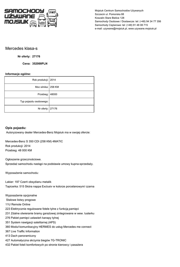 Mojsiuk Centrum Samochodów Używanych Szczecin ul. Pomorska 88 Koszalin Stare Bielice 128 Samochody Osobowe / Dostawcze: tel: (+48) 94 34 77 356 Samochody Ciężarowe: tel: (+48) 91 48 08 715 e-mail: [email protected], www.uzywane.mojsiuk.pl Mercedes klasa-s Nr oferty: 27176 Cena: 352000PLN Informacje ogólne: Rok produkcji: 2014 Moc silnika: 258 KM Przebieg: 48000 Typ pojazdu osobowego: Nr oferty: 27176 Opis pojazdu: Autoryzowany dealer Mercedes-Benz Mojsiuk ma w swojej ofercie: Mercedes-Benz S 350 CDI (258 KM) 4MATIC Rok produkcji: 2014 Przebieg: 48 000 KM Ogłoszenie grzecznościowe. Sprzedaż samochodu nastąpi na podstawie umowy kupna-sprzedaży. Wyposażenie samochodu: Lakier: 197 Czerń obsydianu metalik Tapicerka: 515 Skóra nappa Exclusiv w kolorze porcelanowym/ czarna Wyposażenie opcjonalne Stalowe listwy progowe 11U Remote Online 223 Elektrycznie regulowane fotele tylne z funkcją pamięci 231 Zdalne otwieranie bramy garażowej zintegrowane w wew. lusterku 276 Pakiet pamięci ustawień kanapy tylnej 351 System nawigacji satelitarnej (APS) 360 Moduł komunikacyjny HERMES do usług Mercedes me connect 367 Live Traffic Information 413 Dach panoramiczny 427 Automatyczna skrzynia biegów 7G-TRONIC 432 Pakiet foteli komfortowych po stronie kierowcy i pasażera 448 Interfejs sterowany dotykowo (Touchpad) 463 Wyświetlacz head-up 475 Kontrola ciśnienia w oponach (RDK) 481 Osłona silnika 531 COMAND Online 581 THERMOTRONIC - klimatyzacja automatyczna 61U Podsufitka designo DINAMICA w kolorze czarnym 776 Poszerzony rozstaw kół dla AMG 815 Odtwarzacz DVD 877 Oświetlenie ambient 8U8 Mocowanie fotelików dziecięcych i-Size/ISOFIX 902 Ogrzewanie komfortowe foteli Plus po stronie kierowcy i pasażera 950 Linia AMG 289 Kierownica w drewnie i skórze 729 Elementy wnętrza z drewna topoli w kolorze czarnym, połyskujące 772 Stylizacja AMG 793 19\" obręcze AMG z 5 podwójn. ramion., w szarości tytanu i nabłyszcz., P: 245/45 R 19, T: 275/40 R 19 U26 Dywaniki AMG z napisem «AMG» B03 Funkcja start/stop B51 TIREFIT P09 Pakiet przeciwsłoneczny 297 Rolety przeciwsłoneczne w drzwiach tylnych 540 Elektrycznie sterowana roleta tylnej szyby P17 Pakiet KEYLESS-GO 871 HANDS-FREE ACCESS (bezdotykowe otwieranie klapy bagażnika) 881 Zdalne odblokowanie klapy bagażnika z dociąganiem zamykania 889 KEYLESS-GO P20 Pakiet wspomagania jazdy Plus 233 Aktywny tempomat DISTRONIC PLUS 237 Aktywny asystent \"martwego punktu\" 238 Aktywny asystent utrzymania pasa ruchu 253 System ostrzegający przed uderzeniami z tyłu 266 DISTRONIC PLUS z asystentem układu kierowniczego i Stop & Go Pilot 268 BAS PLUS z asystentem pokonywania skrzyżowań 269 Asystent wspomagania nagłego hamowania BAS PLUS 271 PRE-SAFE® PLUS 300 Hamulec PRE-SAFE P21 Pakiet AIR-BALANCE (system zapachowy z filtrowaniem i jonizacją) P34 Pakiet Exclusive 735 Pakiet elementów wnętrza Exklusiv U25 Listwy progowe z podświetlanym napisem „Mercedes-Benz” P35 Pakiet inteligentnych reflektorów ILS w technologii LED 628 Asystent świateł drogowych 642 LED Intelligent Light System P44 Pakiet asystenta parkowania 218 Kamera cofania 235 PARKTRONIC z aktywnym asystentem parkowania P54 Pakiet zabezpieczenia pojazdu 551 Alarm (EDW) P64 Pakiet pamięci foteli po stronie kierowcy i pasażera 249 Samościemniające lusterka zewnętrzne 275 Pamięć foteli po stronie kierowcy i pasażera, regulacji lusterek zewn. i kolumny kierownicy 439 Komfortowe zagłówki EASY ADJUST po stronie kierowcy i pasażera R05 Opony letnie U10 Czujnik poduszki powietrznej z przodu po stronie pasażera U60 System ochrony pieszych Bezwypadkowy Serwisowany Zadbany Jeden właściciel Cena katalogowa nowego samochodu z wyposażeniem : 570 000 zł BRUTTO Niniejsze ogłoszenie jest wyłącznie informacją handlową i nie stanowi oferty w myśl art. 66, § 1. Kodeksu Cywilnego. Sprzedający nie odpowiada za ewentualne błędy lub nieaktualność ogłoszenia. KONTAKT HANDLOWY: TEL. 692-409-582 TEL. 795-142-622 Jeżeli w naszej ofercie nie ma samochodu który Państwa interesuje proszę o kontakt telefoniczny pod nr tel. 795-142-622 lub przybycie do siedziby naszej firmy Mercedes-Benz Mojsiuk przy ul. Pomorskiej 88. Istnieje możliwość wyszukania indywidualnej oferty na samochód używany. 795-142-622 Jest to informacja handlowa nie stanowiąca oferty w rozumieniu prawa cywilnego, kolory na zdjęciach mogą być inne niż w rzeczywistości. Oferta nie przedstawia rzeczywistych stanów magazynowych