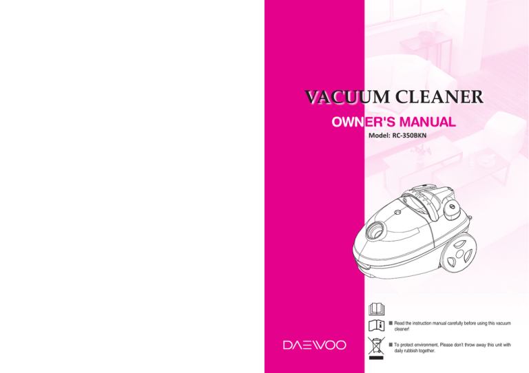 VACUUM CLEANER OWNER'S MANUAL Model:RC-350BKN ■ Read the instruction manual carefully before using this vacuum cleaner! ■ To protect environment, Please don’t throw away this unit with daily rubbish together. DAEWOO ELECTRONICS GUARANTEE CONDITIONS INTRODUCTION Daewoo Electronics products are guaranteed for 12 or 24 months from the date of original purchase as follows:- You have chosen a Daewoo Vacuum Cleaner. American style side by side fridge freezer Combination frost free fridge freezer Undercounter and tabletop fridges and freezers Washing machines Washer dryers Microwave ovens Vacuum cleaners The operation of this vacuum cleaner is easy to use. 24 months* 24 months* 12 months 24 months* 24 months* 12 months 12 months Any defect that arises due to faulty materials or workmanship will be repaired free of charge during this period. The guarantee is subject to the following provisions: • The guarantee does not cover accidental damage, misuse, neglect, tampering or incorrect adjustment, cabinet parts, knobs, software faults or consumable items such as batteries, drive belts or bulbs. • The liability of Daewoo Electronics is limited to the cost of the repair (or replacement) of the product under the guarantee. Daewoo Electronics disclaims any liability for incidental or consequential damages. Daewoo offers a variety of quality product that would make your life more comfortable. Please read the user manual very carefully before starting to use the appliance and keep safely. Thank you. SPECIFICATION Model RC-350BKN Rating voltage 230~240V Rating frequency 50 Hz Input power 800 W Weights(net) 4.1 kg Dimensions (WxHxD) 350 x 280 x 210 mm Cord length 5m • The product must be correctly installed and operated in accordance with the instructions contained in the manual. lt must be used solely for domestic purposes. • The guarantee will be rendered invalid if the product is resold, has had its serial number removed (or has an invalid serial number), or if an unauthorised person has carried out any repairs or alterations. The guarantee is in addition to and does not diminish your statutory or legal rights. For further information regarding your guarantee please see the section at the rear of your instruction manual. ln the event of a breakdown please refer to the troubleshooting guide in your instruction manual and check all plugs, fuses and electricity supply. In the event that you need further assistance please contact Daewoo Electronics Customer Services with your model and serial number, date and place of purchase along with a brief description of the problem. In the event of there being no breakdown or the product is not within the guarantee period you will be charged for the repair. If you purchased an extended warranty for your product please contact the provider of the extended warranty directly. 2 3 NAMES OF PARTS AND OPERATION TECHNIQUE HOSE CONNECTION • Connecting the hose: insert the hose firmly into the hose inlet. (“Click”) • Disconnecting the hose: press the button and pull the hose out of the vacuum cleaner. SUCTION CONTROL CORD REWIND BUTTON • The suction power control at the hand grip enables you to control suction power. • Rewind the power cord by pressing the cord rewind button. PIPE CONNECTION ON/OFF SWITCH • Press the on/off switch. DUST METER DUST METER • When the colour of the dust meter changes to RED for a long time, change the dust bag. • To Connect the nozzle, hold the tubes and the handle: insert the narrowed section into the wide section. PRACTICAL PARKING brush clip STORAGE rest WIDE SUCTION NOZZLE COMBI CREVICE NOZZLE • If you want to stop vacuum cleaning for a while, you can place the brush clip into the rest position. • Use this nozzle for cleaning both carpeted and unoncarpeted floors. Position 2 for carpeted and 1 for noncarpeted. 4 5 • If you want to store the cleaner, hitch the brush clip onto the vacuum cleaner. FEATURES CLEANING THE FILTER 1. This appliance is for household use only, It is only used indoors for dust, but not applied for industrial or decorating areas. It can not suck in water. Warning: 2. This appliance is not intended for use by persons (including children) with reduced physical, sensory or mental capabilities, or lack of experience and knowledge, unless they have been given supervision or instruction concerning use of the appliance by a person responsible for their safety. Exhaust filter 1 •Switch off. 2 3 •Pull the filter case outwards from the cleaner. •Separate the filter from the filter case and shake the dust out of the filter. 3. Children should be supervised to ensure that they do not play with the appliance. ■ Streamline mold-making and original design, representing modern fashionable life. ■ With strong suction power 800W motors, strong suction power. Motor protection filter ■ Multi-filter to avoid the second air pollution Using the multi-filter system ensures cleaning out all the dust, and keep the air clean from the outlet. 1 •Switch off and open the cover. 2 3 •Hold the cover while taking the filter out of the cleaner. •Shake the dust out of the filter. ■O ne appliance fitted with various suction nozzles for multi-purposes Various suction nozzles are used to suck up dust on carpet or hard floor but also to remove dust on wall, ceiling, couch, bed and all home electric appliance. ■P edal on/off buttons for easy operation Pedal on/off buttons can release you from stooping for easy operation. ■S uction power with freely regulation To regulate the suction power on the air flow handle and unit. ■ Dust bag full indicator function When the dust bag or the air filter is full of dust, the dust full indicator on top of the body will be covered by red indications. This shows that you need to empty the dust bag or clean the air filter. CHANGING THE DUSTBAG 1 •Switch off and open the cover. 2 3 •Take off the dustbag holder with the bag together and empty the dust. •Put the
