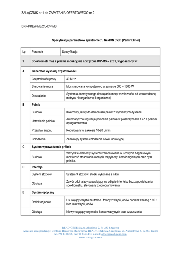 ZAŁĄCZNIK nr 1 do ZAPYTANIA OFERTOWEGO nr 2 ____________________________________________________________ DRP-PREW-ME/2/L-ICP-MS Specyfikacja parametrów spektrometru NexION 350D (PerkinElmer) Lp. Parametr 1 Spektrometr mas z plazmą indukcyjnie sprzężoną ICP-MS – szt.1, wyposażony w: A Generator wysokiej częstotliwości B C Częstotliwość pracy 40 MHz Sterowanie mocą Moc sterowana komputerowo w zakresie 500 – 1600 W Dostrajanie System automatycznego dostrajania mocy w zależności od wprowadzanej matrycy nieorganicznej i organicznej Palnik Budowa Kwarcowy, łatwy do demontażu palnik z wymiennymi dyszami Ustawienie palnika Automatyczna regulacja położenia palnika w płaszczyznach XYZ z poziomu oprogramowania Przepływ argonu Regulowany w zakresie 10-20 L/min. Chłodzenie Zamknięty system chłodzenia cewki indukcyjnej System wprowadzania próbek Budowa D E Specyfikacja Wszystkie elementy systemu zamontowane w uchwycie bagnetowym, możliwość stosowania różnych rozpylaczy, komór mgielnych oraz dysz palnika. Interfejs System stożków System 3 stożków, stożki wykonane z niklu Obsługa Zawór odcinający pozwalający na zdjęcie interfejsu bez zapowietrzania spektrometru, sterowany z oprogramowania System optyczny Deflektor jonów Usuwający cząstki neutralne i fotony z wiązki jonów poprzez zmianę o 90° kierunku wiązki jonów Obsługa Niewymagający czynności konserwacyjnych oraz czyszczenia ___________________________________________________________________________ READ-GENE SA, ul.Akacjowa 2, 71-253 Szczecin Adres do korespondencji: Centrum Badawczo-Rozwojowe READ-GENE SA, Grzepnica, ul. Alabastrowa 8, 72-003 Dobra tel.: 91 4334256, fax: 91 8524433, e-mail: [email protected] www.read-gene.com ZAŁĄCZNIK nr 1 do ZAPYTANIA OFERTOWEGO nr 2 ____________________________________________________________ F G H I Komora reakcyjno-zderzeniowa Tryb pracy Dwa tryby usuwania interferencji: z dyskryminacją kinetyczną jonów (komora kolizyjna) oraz z dyskryminacją mas (komora reakcyjna), komora stanowi integralną część spektrometru Redukcja intensywności interferentów 103 – 109 razy Obsługa gazów Dwa niezależne kanały do podłączenia dwóch różnych gazów (np. hel i metan), możliwość automatycznej zmiany gazu w czasie wykonywanego pomiaru próbki Elektroniczne rozcieńczanie Możliwość tłumienia sygnału dla bogatych matryc Obsługa Komora nie wymaga jakiegokolwiek czyszczenia lub konserwacji System rozdziału mas Budowa Kwadrupolowy z prętami ceramicznymi pokrytymi złotem, rozdzielczość Regulowana w zakresie od 0,3 do 3 amu. Zakres mas Do 285 amu we wszystkich trybach, Prędkość skanowania 5000 amu/s (przy zbieraniu danych w min 5 pkt. dla każdej z mas) Detektor Tryb pracy Dwustopniowy umożliwiający jednoczesną pracę w trybach impulsowego i analogowego pomiaru sygnału Zakres dynamiczny 1010 (praca w zakresie od <0.1 cps do >109 cps w pojedynczym ciągłym skanowaniu) Stabilność kalibracji masy < 0.05 amu przez 8 godzin ciągłej pracy Granica wykrywalności Be < 1, Co < 1, In < 0.5, U < 0.5 ng/L (ppt) dla 3-sekundowego czasu integracji oraz pomiaru w trybie „peak hoping”(1 punkt na jednostkę masy). Czułość (milion cps/mg/L) Be > 3, Mg > 20,In > 50, U > 40 System próżniowy Budowa Czterostopniowy system utrzymania próżni Rodzaje pomp Klasyczna próżniowa oraz turbomolekularna ___________________________________________________________________________ READ-GENE SA, ul.Akacjowa 2, 71-253 Szczecin Adres do korespondencji: Centrum Badawczo-Rozwojowe READ-GENE SA, Grzepnica, ul. Alabastrowa 8, 72-003 Dobra tel.: 91 4334256, fax: 91 8524433, e-mail: [email protected] www.read-gene.com ZAŁĄCZNIK nr 1 do ZAPYTANIA OFERTOWEGO nr 2 ____________________________________________________________ J Zamknięty obieg chłodzenia: temperatura chłodzenia Od –5oC do 40 oC pojemność zbiornika 6 litrów 2. Wyposażenie dodatkowe: A Zestaw roztworów do strojenia aparatu i roztworów płuczących (2 szt.) B Zestaw zapasowych przewodów do pompy perystaltycznej (min. 20 szt). C Oprogramowanie pracujące w środowisku MS Windows 7, sterujące pracą spektrometru ICP-MS (1 szt.) zapewniające w pełni automatyczną optymalizację aparatu, przejmujące kontrolę nad wszystkimi dodatkowymi akcesoriami, pozwalające na przygotowanie raportu wg projektu użytkownika i przesyłanie danych do innych pakietów oprogramowania. D Jednostka sterująca (1 szt.) o parametrach wymaganych do obsługi oprogramowania spektrometru ICP-MS: Pentium i5, 3 GHz, 1 TB HDD, 4 GB RAM, 24" monitor LCD z matrycą IPS, karta LAN, mysz, klawiatura, Windows 7 Professional, 64 bit, Ang. W wyniku Zapytania ofertowego nr 1 najkorzystniejszą ofertę zakupu aparatury złożyła firma: − PerkinElmer Polska Sp. z o.o. − Szczegółowe dane do kontaktu: − PerkinElmer Polska Sp. z o.o. ul. Wołoska 9 02-583 Warszawa − Pan Grzegorz Gołąb Tel: 22 310 88 00 Mob: 609 305 950 e-mail: [email protected] − www.perkinelmer.com ___________________________________________________________________________ READ-GENE SA, ul.Akacjowa 2, 71-253 Szczecin Adres do korespondencji: Centrum Badawczo-Rozwojowe READ-GENE SA, Grzepnica, ul. Alabastrowa 8, 72-003 Dobra tel.: 91 4334256, fax: 91 8524433, e-mail: [email protected] www.read-gene.com
