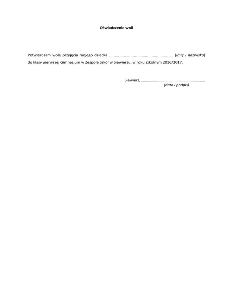 Oświadczenie woli Potwierdzam wolę przyjęcia mojego dziecka …………………………………..…………….………….. (imię i nazwisko) do klasy pierwszej Gimnazjum w Zespole Szkół w Siewierzu, w roku szkolnym 2016/2017. Siewierz, ….............................................................. (data i podpis)