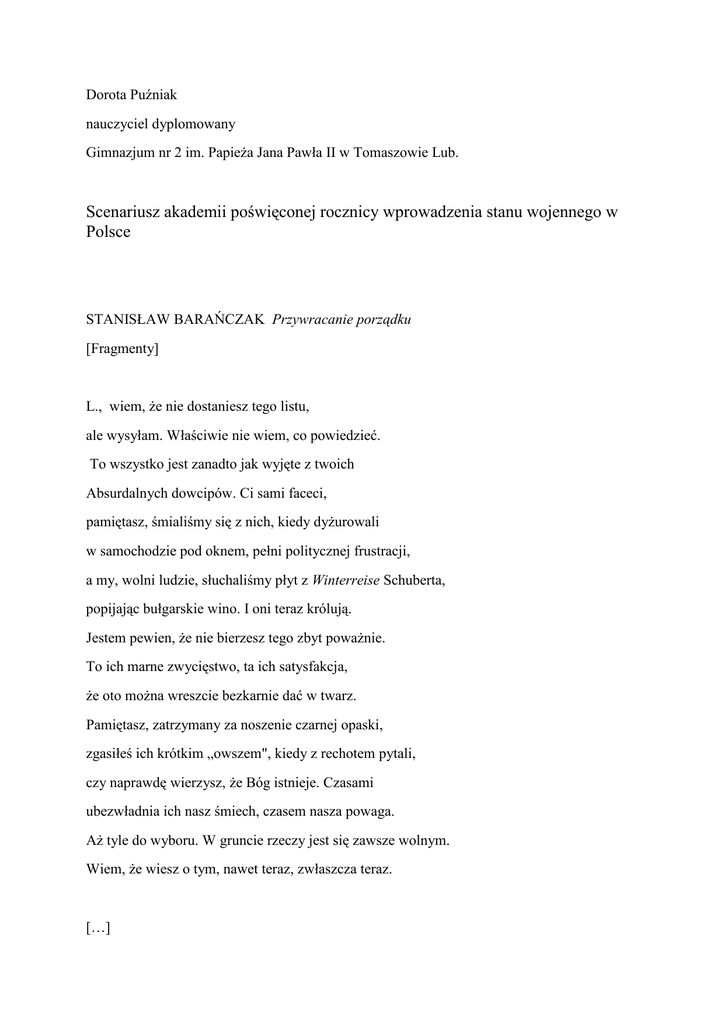 Dorota Puźniak nauczyciel dyplomowany Gimnazjum nr 2 im. PapieŜa Jana Pawła II w Tomaszowie Lub. Scenariusz akademii poświęconej rocznicy wprowadzenia stanu wojennego w Polsce STANISŁAW BARAŃCZAK Przywracanie porządku [Fragmenty] L., wiem, Ŝe nie dostaniesz tego listu, ale wysyłam. Właściwie nie wiem, co powiedzieć. To wszystko jest zanadto jak wyjęte z twoich Absurdalnych dowcipów. Ci sami faceci, pamiętasz, śmialiśmy się z nich, kiedy dyŜurowali w samochodzie pod oknem, pełni politycznej frustracji, a my, wolni ludzie, słuchaliśmy płyt z Winterreise Schuberta, popijając bułgarskie wino. I oni teraz królują. Jestem pewien, Ŝe nie bierzesz tego zbyt powaŜnie. To ich marne zwycięstwo, ta ich satysfakcja, Ŝe oto moŜna wreszcie bezkarnie dać w twarz. Pamiętasz, zatrzymany za noszenie czarnej opaski, zgasiłeś ich krótkim „owszem", kiedy z rechotem pytali, czy naprawdę wierzysz, Ŝe Bóg istnieje. Czasami ubezwładnia ich nasz śmiech, czasem nasza powaga. AŜ tyle do wyboru. W gruncie rzeczy jest się zawsze wolnym. Wiem, Ŝe wiesz o tym, nawet teraz, zwłaszcza teraz. […] Orzeł, tu Sokół, mów, co u ciebie, odbiór. Tu u nas teŜ gorąco, nie zawracaj głowy, skąd mam wziąć ludzi, sam potrzebuję, odbiór. A co mają robić, idą i wykrzykują, odbiór. A takie tam, wolność, sprawiedliwość, odbiór. A gaz pobrałeś, odbiór. No to na co czekasz, Orzeł, przyładuj im, a potem zdrowe grzanie, odbiór. Tak jest, Ŝeby im się odechciało raz na zawsze. RYSZARD KRYNICKI I naprawdę nie wiedzieliśmy Adamowi Michnikowi (…) i naprawdę nie wiedzieliśmy, Ŝe tyle wozów bojowych moŜna skierować przeciwko bezbronnym, przeciwko nam, którzy byliśmy jeszcze dziećmi zbrojnymi jedynie w idee, o których uczono nas w szkołach i których w tych samych szkołach nas oduczano, i naprawdę nie wiedzieliśmy, Ŝe moŜna je wszystkie przekreślić bezlitosną szarŜą sytej przemocy, zwielokrotnionym kłamstwem (...) STANISŁAW BARAŃCZAK Przywracanie porządku [Fragmenty] Skąd pan wziął tę ulotkę, na jakiej podstawie przebywał pan na ulicy o tej porze, jakim prawem ta czarna opaska na rękawie, milczeć, my zadajemy pytania, jesteśmy, jak pan widzi, grzeczni i oczekujemy równie grzecznej odpowiedzi, kto panu dał prawo do tych praw, do kogo naleŜy ta pana Polska, gdzie się ukrywa ta wasza Matka Boska, kontakty, nazwiska, adresy, milczeć, my zadajemy sobie trud po nocy, a pan co, to takiej grzeczności was uczyli na uniwersytecie za państwowe pieniądze, kto was uczył takich wyrazów, kto was podjudzał do tego wyrazu twarzy, milczeć, my zadajemy cierpienia, chyba zdaje pan sobie sprawę z tego, w jakich czasach pan Ŝyje, w jakich środowiskach pan się obraca, daty, nazwiska, fakty, tylko grzecznie mi tu, grzecznie. […] A przecieŜ tyle po drodze zasieków kolczastych i mórz, a jednak ten pojemnik z gazem, wystrzelony nie w moją wcale stronę, mimo wszystko doleciał aŜ tu; to niemoŜliwe, aby to cokolwiek pomogło, to bezcelowe, ich maski są szczelne, a mnie i tak jeszcze długo będą piekły oczy, ale podnoszę go i odrzucam w ich stronę. Bibliografia: Wszystkie teksty pochodzą z antologii „Znak po znaku. Antologia wierszy polskich i obcych z lat 1939 – 1991”. Do scenariusza tej akademii dobrałam takŜe piosenki: Jan Pietrzak Nadzieja Jonasz Kofta Pamiętajcie o ogrodach Marek Grechuta Ojczyzna Ich Troje Dokąd idziesz, Polsko